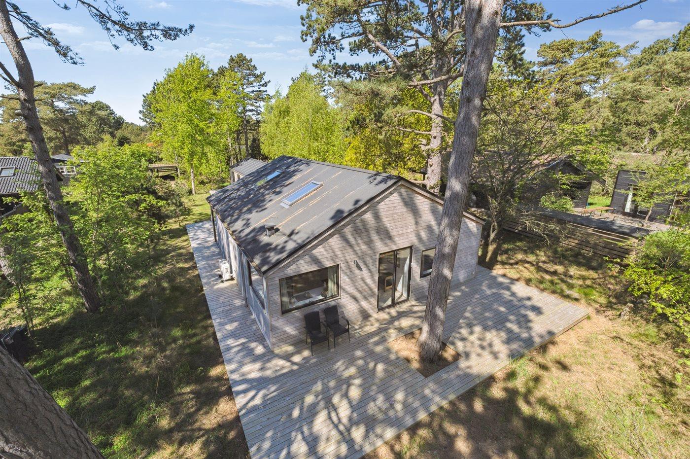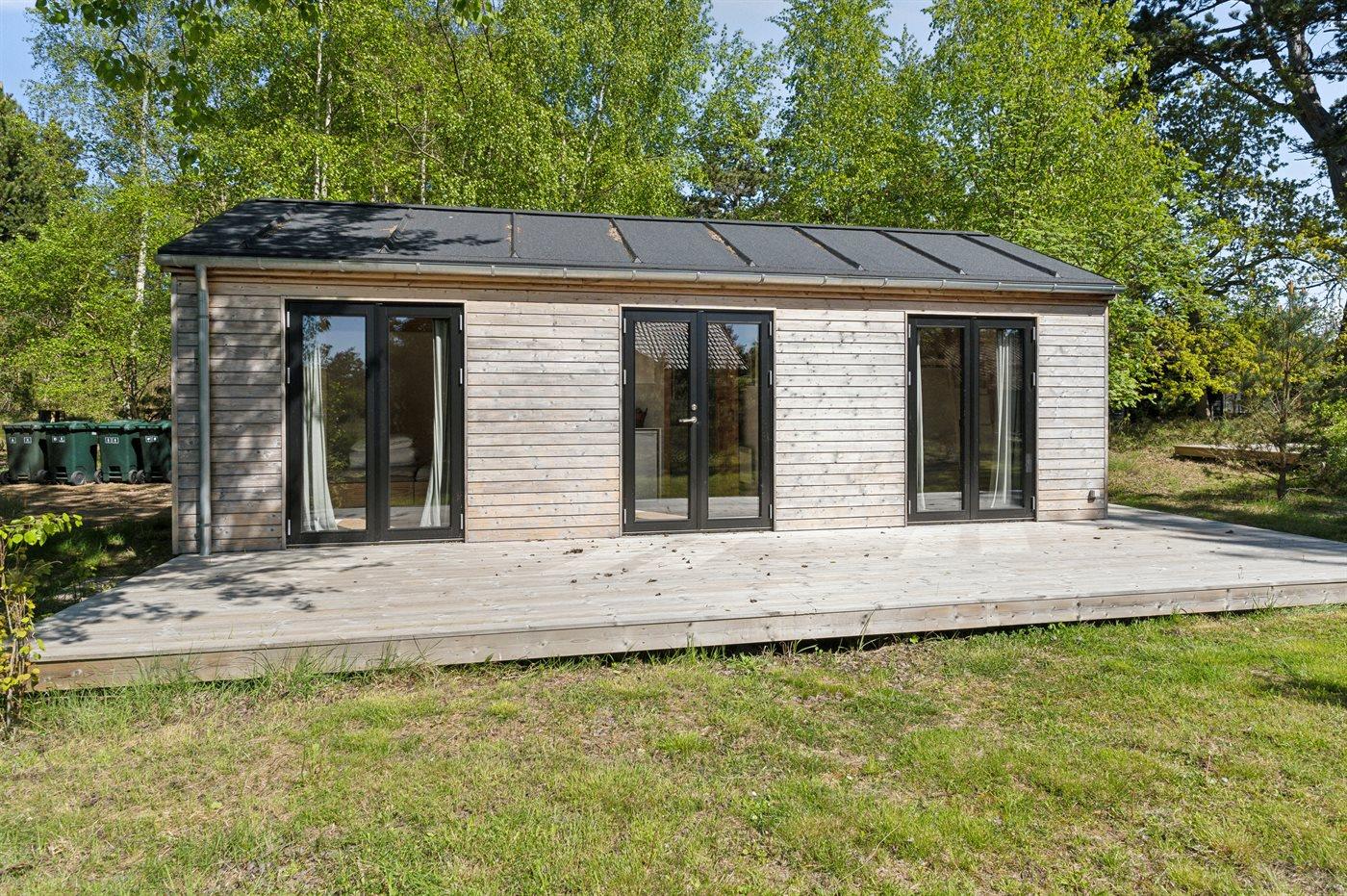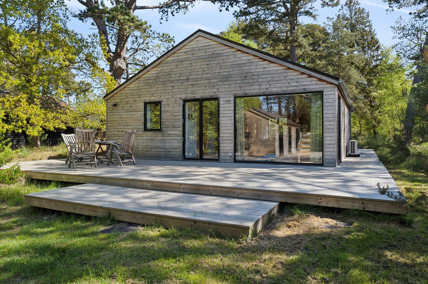 Es besteht aus einem Haupthaus und einem separaten „Luxus-Gästehaus“ mit eigenem Badezimmer und Küchenzeile – ideal für mehrere Generationen oder zwei Familien. Im Haupthaus erwartet dich eine große, offene Wohnküche, die direkt in das Wohnzimmer übergeht und Zugang zur großzügigen Holzterrasse bietet, die das Haus umgibt. Es gibt außerdem zwei Schlafzimmer mit je zwei Schlafplätzen sowie ein luxuriöses Badezimmer mit Fußbodenheizung, Duscheniche und Badewanne. Ein Hauswirtschaftsraum mit Waschmaschine steht ebenfalls zur Verfügung.