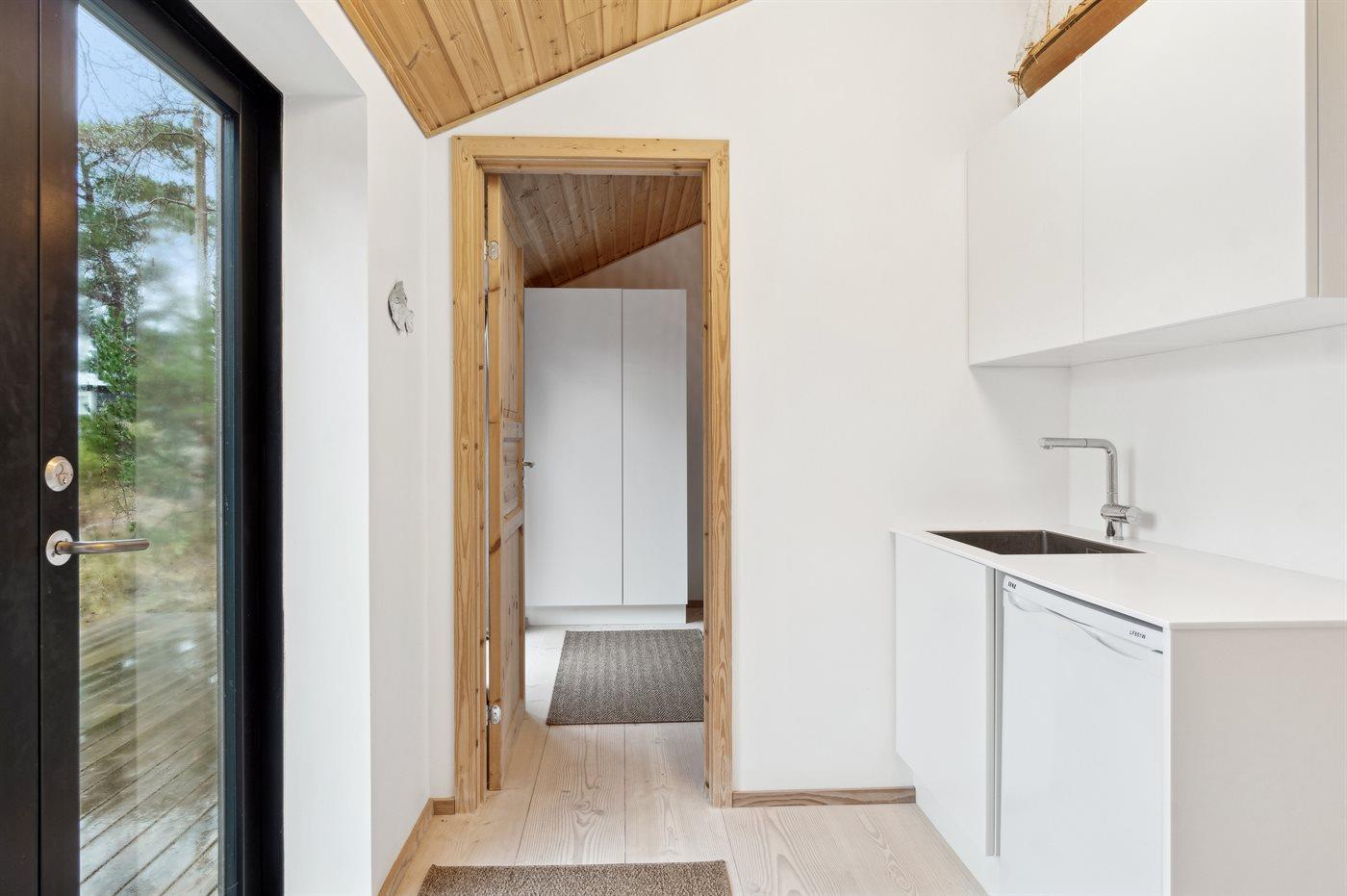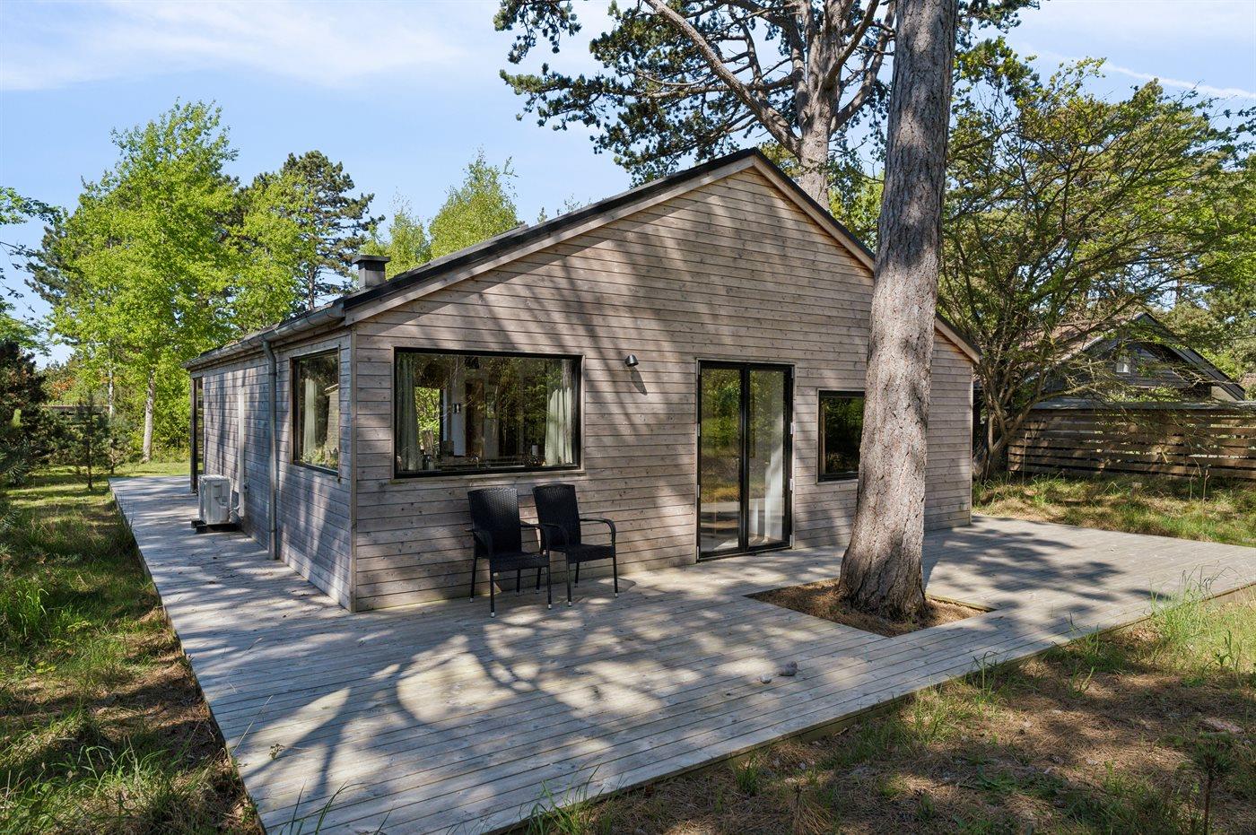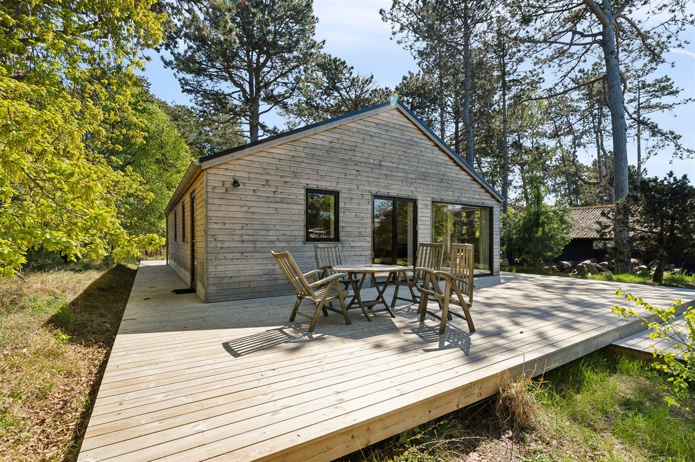 Es besteht aus einem Haupthaus und einem separaten „Luxus-Gästehaus“ mit eigenem Badezimmer und Küchenzeile – ideal für mehrere Generationen oder zwei Familien. Im Haupthaus erwartet dich eine große, offene Wohnküche, die direkt in das Wohnzimmer übergeht und Zugang zur großzügigen Holzterrasse bietet, die das Haus umgibt. Es gibt außerdem zwei Schlafzimmer mit je zwei Schlafplätzen sowie ein luxuriöses Badezimmer mit Fußbodenheizung, Duscheniche und Badewanne. Ein Hauswirtschaftsraum mit Waschmaschine steht ebenfalls zur Verfügung.