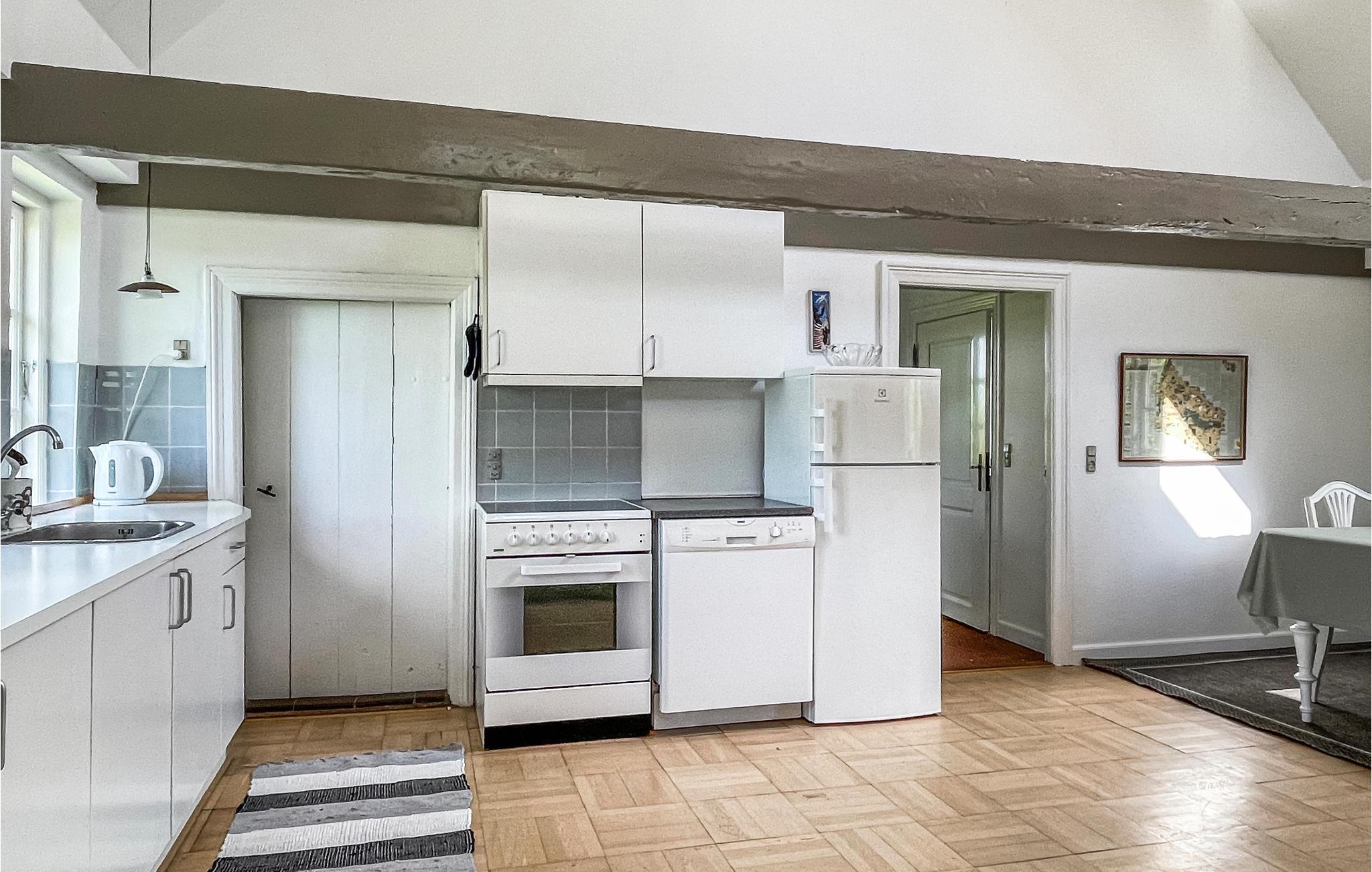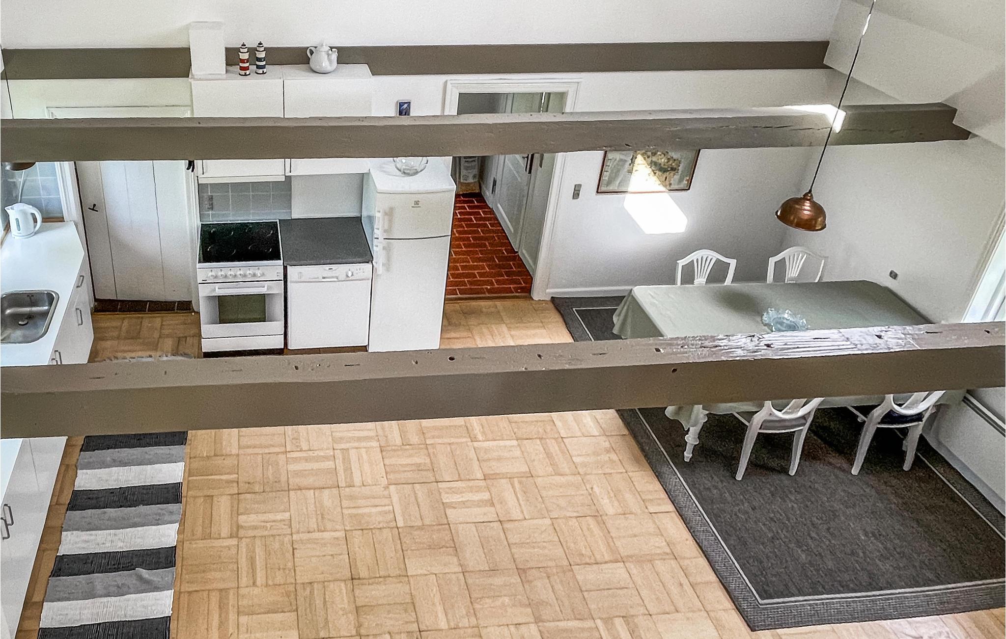 Das zweistöckige Ferienhaus ist dank offenen Raumkonzept bis zu den sichtbaren Holzbalken in der Decke, was eine geräumige und gemütliche Atmosphäre hervorruft. Im Erdgeschoss finden Sie die offene, gut ausgestattete Küche mit Essbereich, zwei große Schlafzimmer und ein Badezimmer mit Fußbodenheizung. Von der Küche führt eine relativ steile Treppe hinauf zum Wohnzimmer, wo Sie in bequemen Möbeln fernsehen können und von wo Sie auf eine schöne Terrasse mit Loungemöbeln und weitem Blick in die schöne, ländliche Umgebung bis zur Rundkirche von Olsker gelangen. Im Hauswirtschaftsraum des Hauses finden Sie eine Waschmaschine.