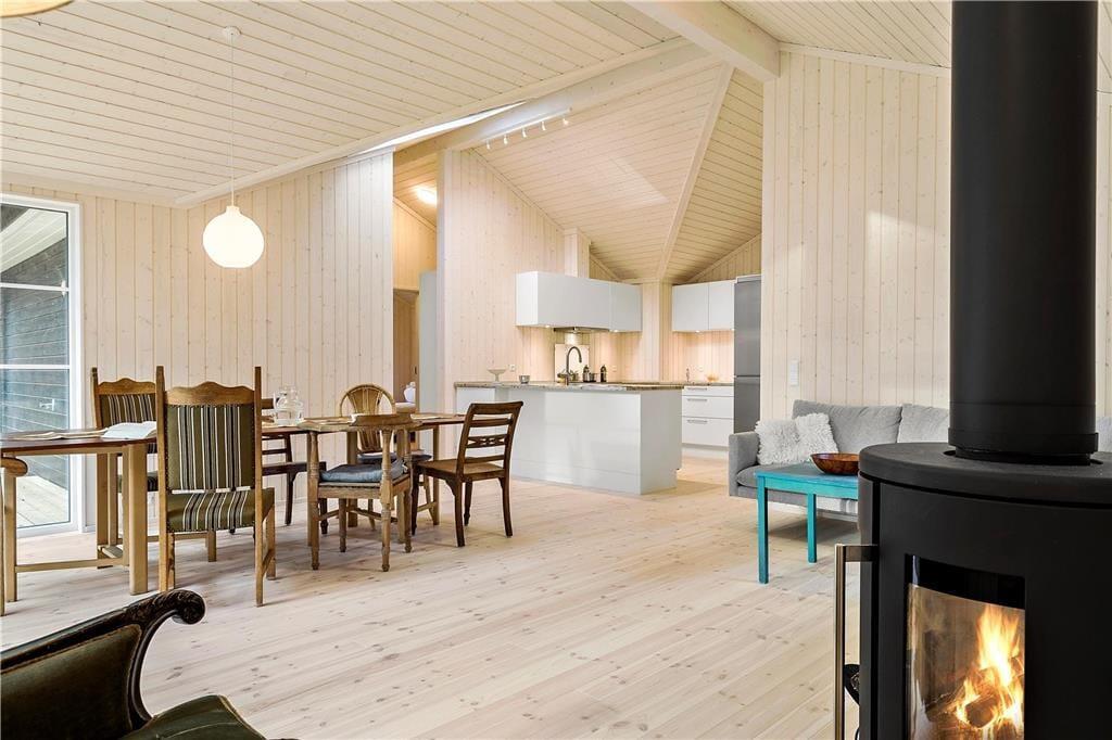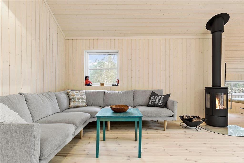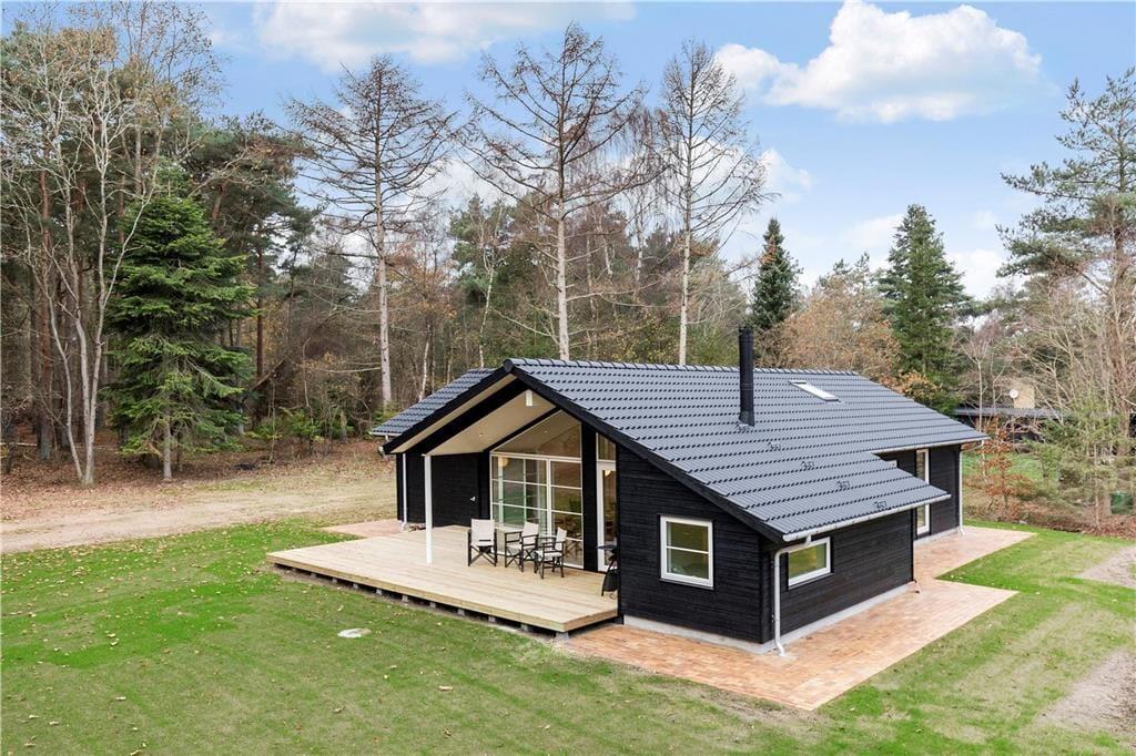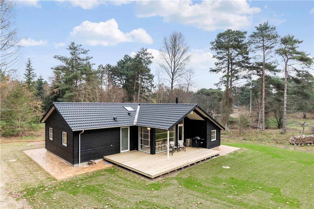 Das Haus verfügt über ein großes Wohnzimmer mit fantastischem Licht, Fernsehen, Wärmepumpe, einer Bettnische mit Doppelbett und großen Panoramafenstern gegen den großen Garten wo die Rehe oft kreuzen. Es gibt 4 gute Schlafzimmer, davon 2 mit Doppelbett, 1 mit einem Ausziehbett und 1 mit Etagenbett und einem Schlafboden mit Matratze. Das Haus hat auch eine schöne und neue offene Küche mit Geschirrspüler. Die beiden Badezimmer sind mit Dusche und Toilette ausgestattet. Vom Wohnzimmer hat man Ausgang zu der schönen Holzterrasse, wo man geschützt sitzen kann und eine gute Mahlzeit vom Grill genießen und das reiche Tierleben beobachten kann.