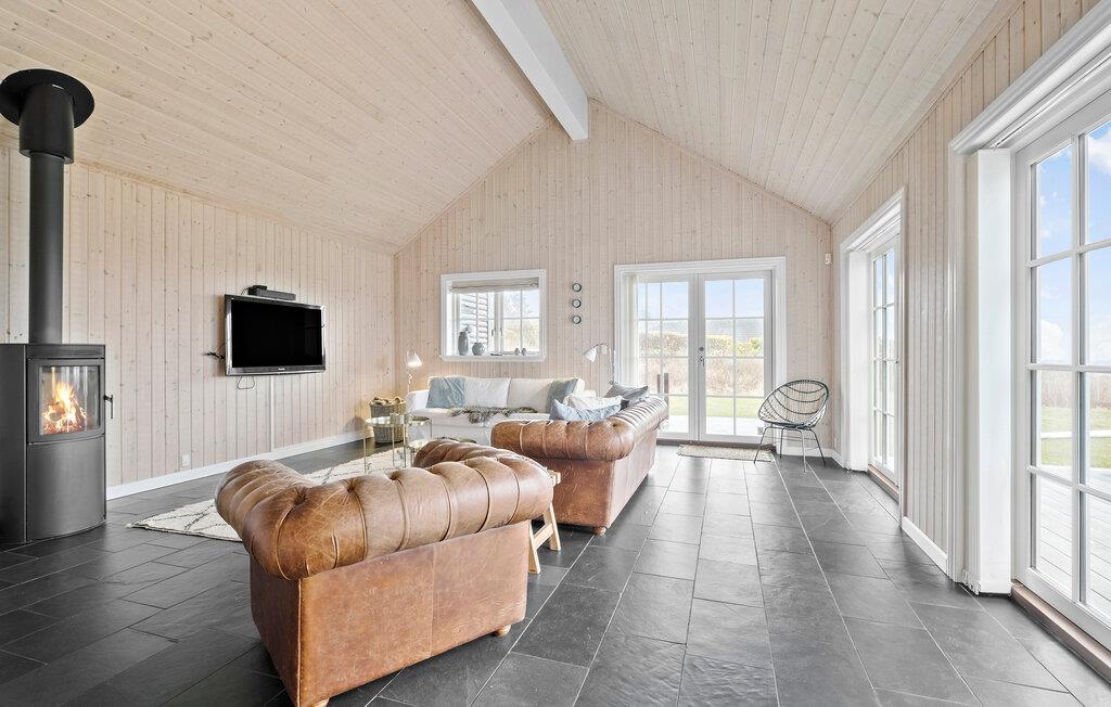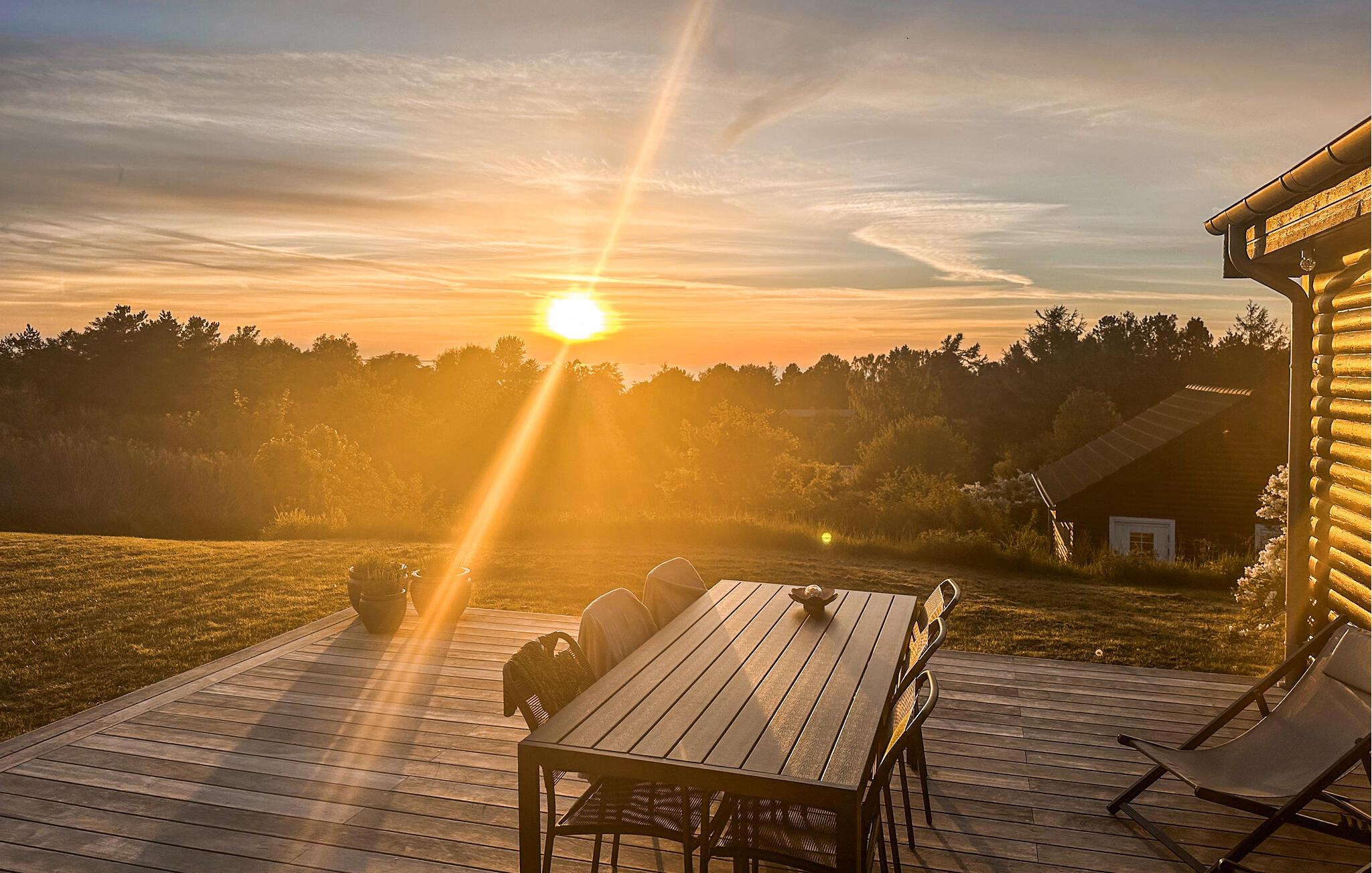 Gemütliches Holzhaus in Ordrup Strand mit Meerblick, offener Terrasse und Kaminofen für erholsame Urlaubstage.