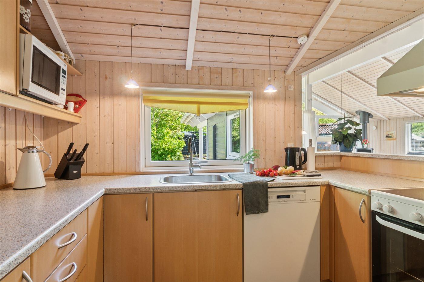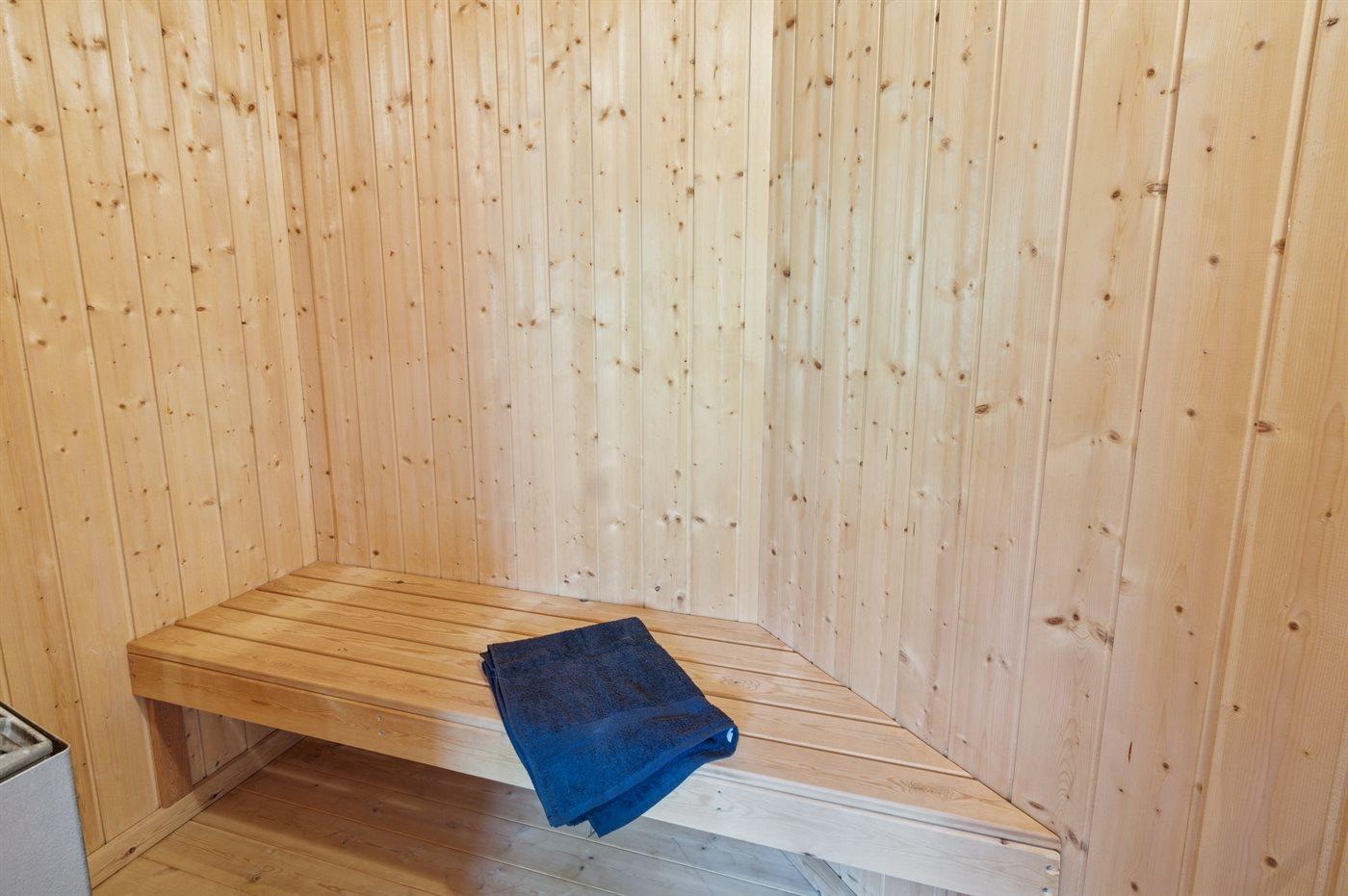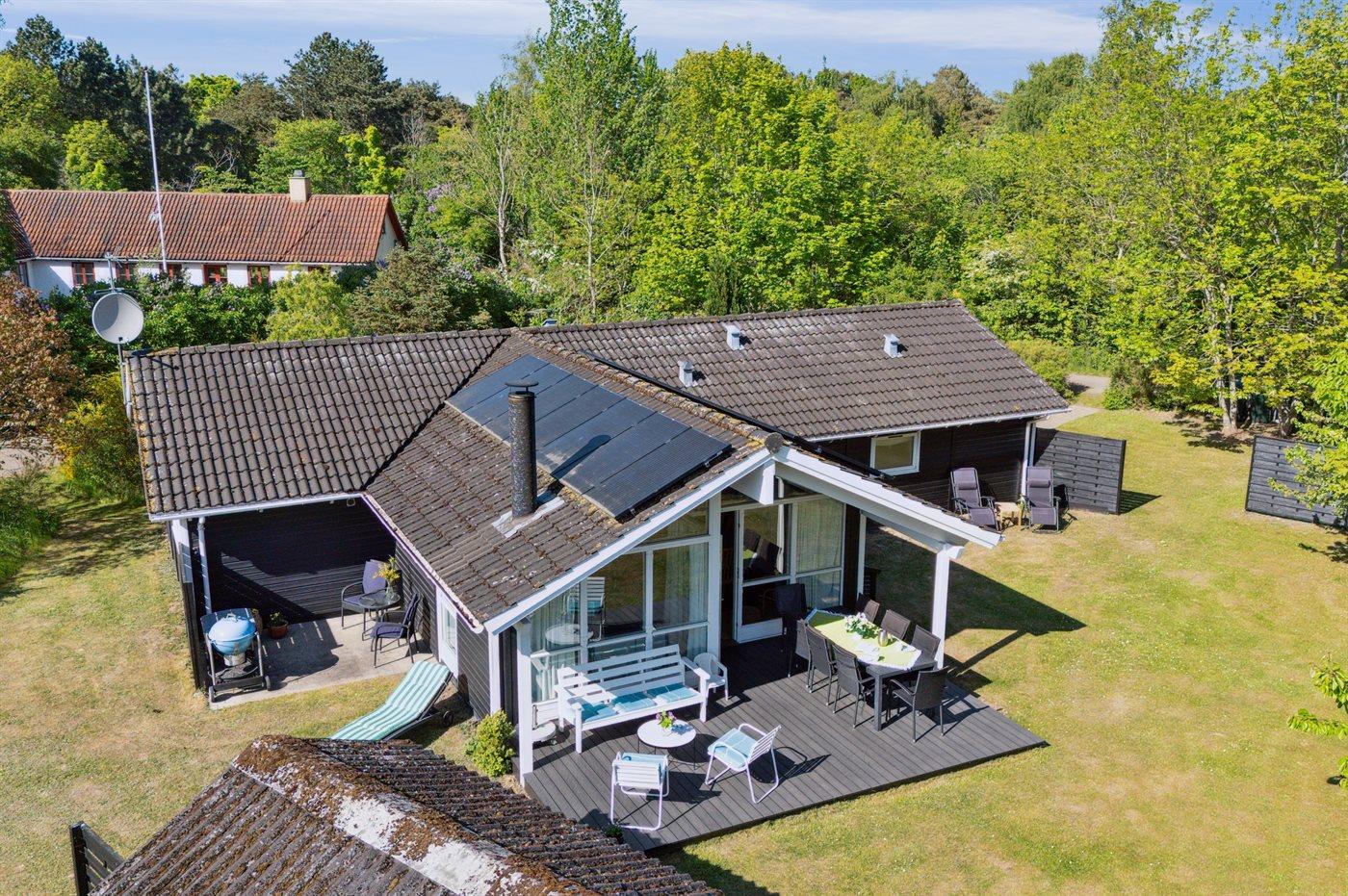 Auf einem Naturgrundstück nur 250 m vom Badestrand entfernt liegt dieses schöne Ferienhaus aus Holz mit Whirlpool und Sauna, 2002 gebaut. Zum Haus gehört sowohl offene als auch überdachte Terrasse mit Gartenmöbeln. Innen gibt es Holzböden. Das Haus ist mit 2 Badezimmern mit Dusche eingerichtet. Das eine ist ferner mit Fußbodenheizung, 3-Pers. Whirlpool und Zutritt zur Sauna des Hauses ausgestattet. Moderne Küche in offener Verbindung mit dem Wohnzimmer mit u. a. Geschirrspüler, Mikrowelle, Tiefkühlgerät und Herd mit Ceran-Feld. Das helle Wohnzimmer enthält Kaminofen, TV, Chromecast, DVD-Spieler sowie Stereoanlage mit CD-Spieler. Es können keine Fernsehsender empfangen werden - nur Streaming. Die 8 Schlafplätze verteilen sich auf 4 Schlafzimmer; 3 mit Doppelbett und 1 mit Etagenbett. Zusätzliches TV mit eingebautem DVD-Spieler in dem einen Schlafzimmer. An weiterer Ausstattung können kostenlose, kabellose Internetverbindung (Computer ist mitzubringen), Waschmaschine sowie Wäschetrockner erwähnt werden und es ist eine energiesparende Wärmepumpe installiert. Für die kleinen Feriengäste stehen Kinderbett, Kinderhochstuhl, Schaukel, Rutsche und Sandkasten bereit.
