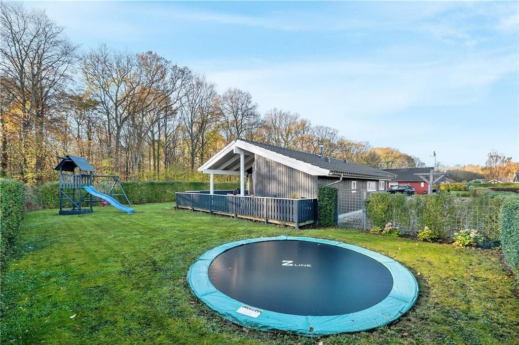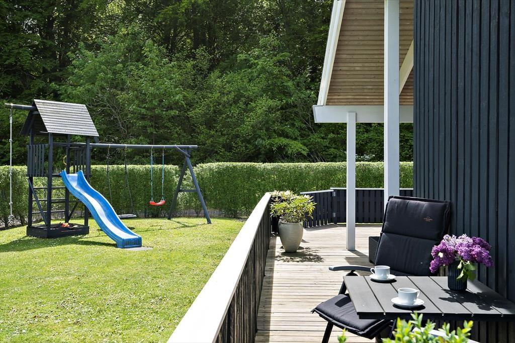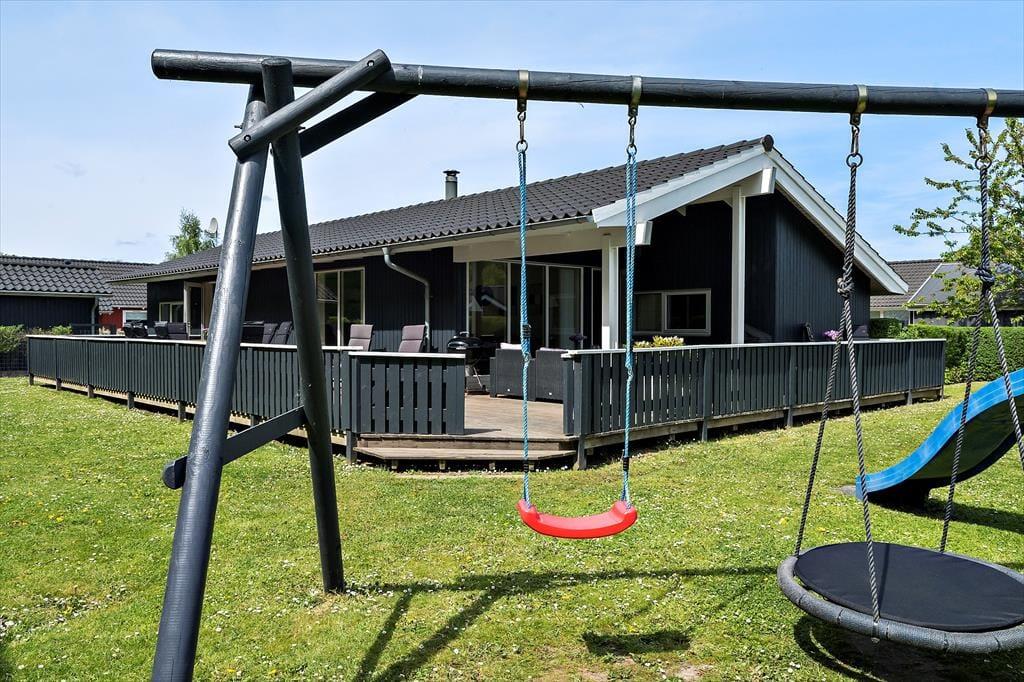 Das Ferienhaus befindet sich in einem ruhigen, geschlossenen Weg nahe des Waldes. Im Garten und auf den Terrassen halten Sie sich nahezu völlig ungestört inmitten schöner Natur auf. Ein Großteil des Gartens und die Terrasse sind umzäunt – ein Umstand, den sicherlich insbesondere Eltern von abenteuerlustigen Kleinkindern sehr zu schätzen wissen. In diesem Gartenbereich werden sich kleine und etwas größere Kinder ausgesprochen wohl fühlen, da hier ein Spielturm, eine Rutsche, ein Trampolin, eine Schaukel und eine Sandkiste für viel Spaß und Abwechslung sorgen. Die Terrasse verwöhnt Sie mit offenen und überdachten Bereichen, auf denen Sie Ihre spielenden Kinder im Blick haben. Somit können Sie völlig frei entscheiden, wo nun genau Ihr persönlicher Lieblingsplatz sein soll, an dem Sie die wertvolle Zeit mit Ihren Mitreisenden genießen. Gute Gartenmöbeln sind zahlreich vorhanden. Da auch Liegestühle, ein Sonnenschirm und ein Gasgrill zu Ihrer Verfügung stehen, steht traumhaft entspannten Stunden oder geselligen Runden absolut nichts im Wege. In der Einfahrt zum Haus können mindestens vier Pkws abgestellt werden. Im Schuppen sind darüber hinaus ein zusätzlicher Kühlschrank und ein paar Fahrräder untergebracht. Die Benutzung der Räder erfolgt auf eigene Gefahr. Für den Zustand der Fahrräder wird nicht gehaftet.