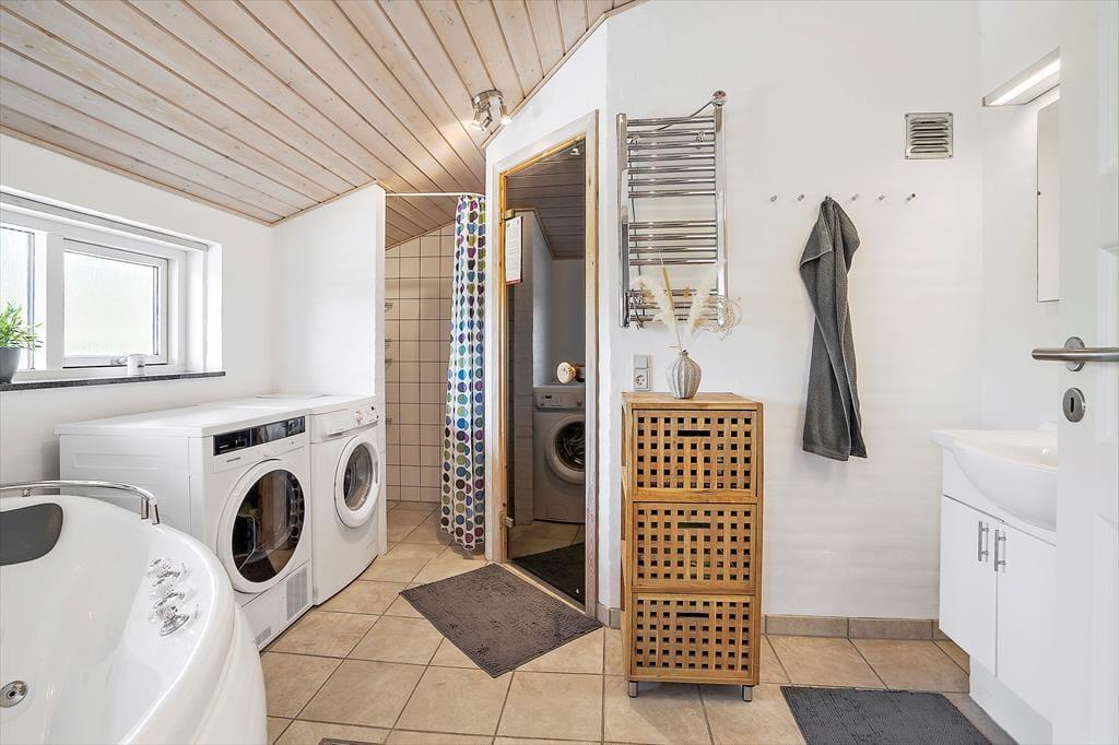 Das Urlaubsdomizil verfügt über ein schönes Badezimmer, das mit einem WC, einer Dusche, einem Whirlpool und einer Sauna zu begeistern weiß. Eine Waschmaschine und ein Wäschetrockner sind ebenfalls vorhanden. Dank des ebenfalls im Haus befindlichen Gäste-WCs werden unangenehme Warteschlangen vermieden und Sie können die Erholung und Entspannung in Whirlpool und Sauna in vollen Zügen auskosten.