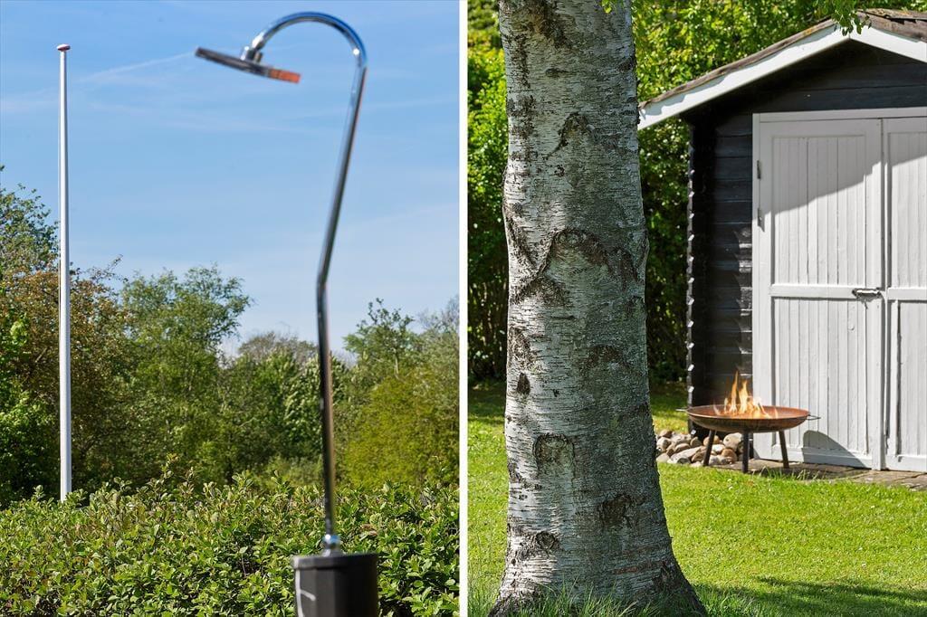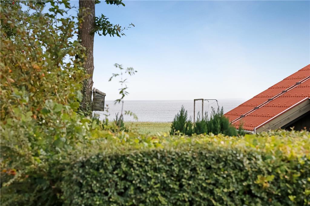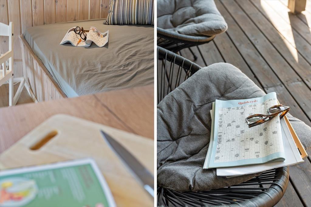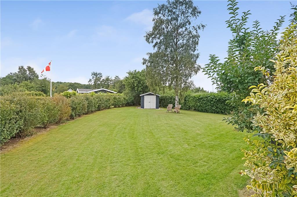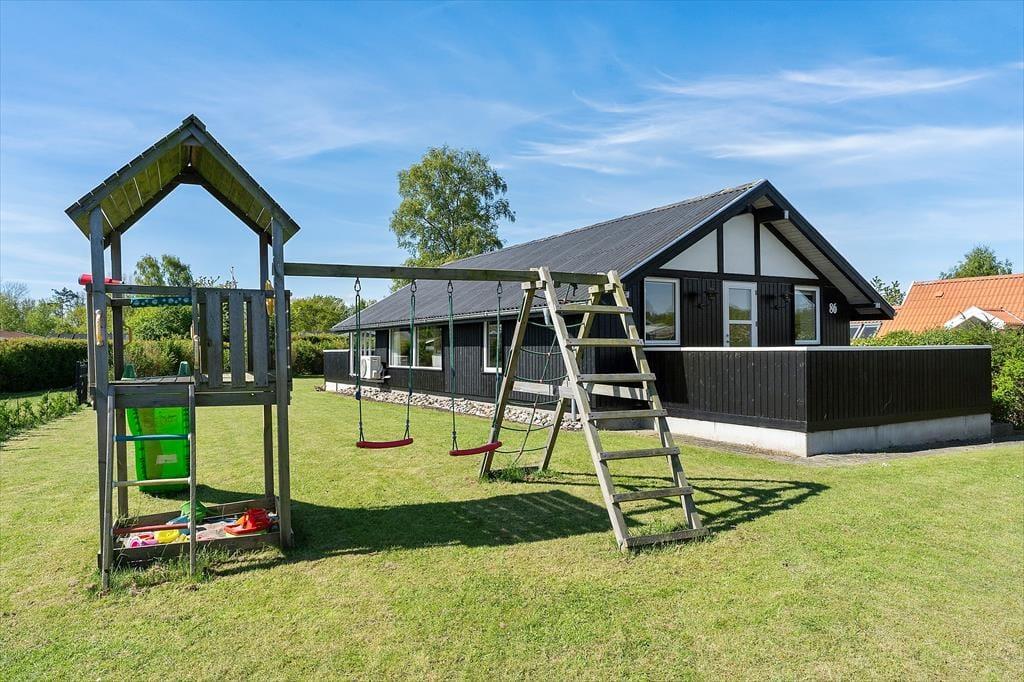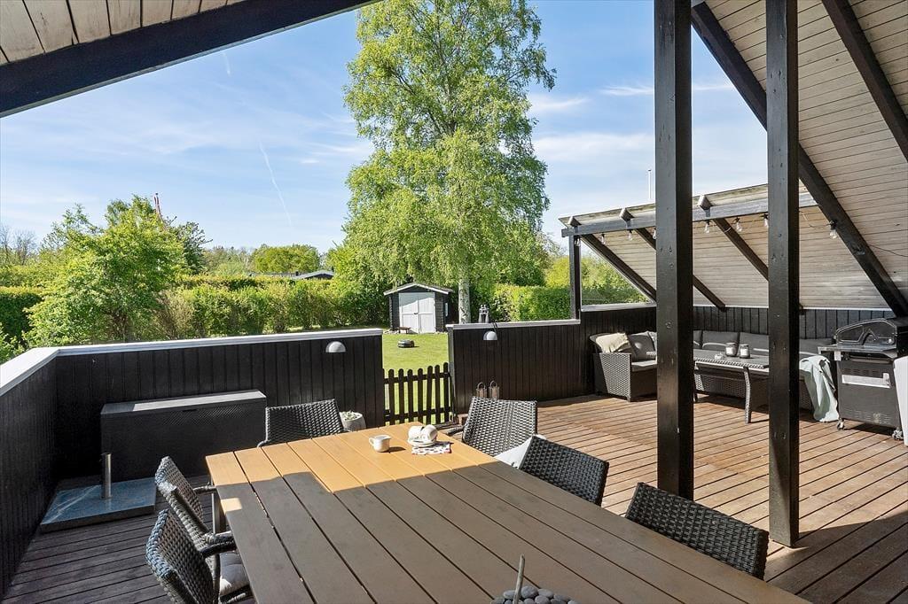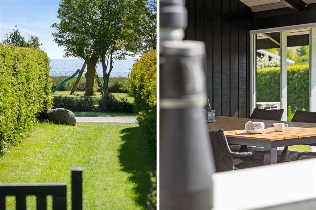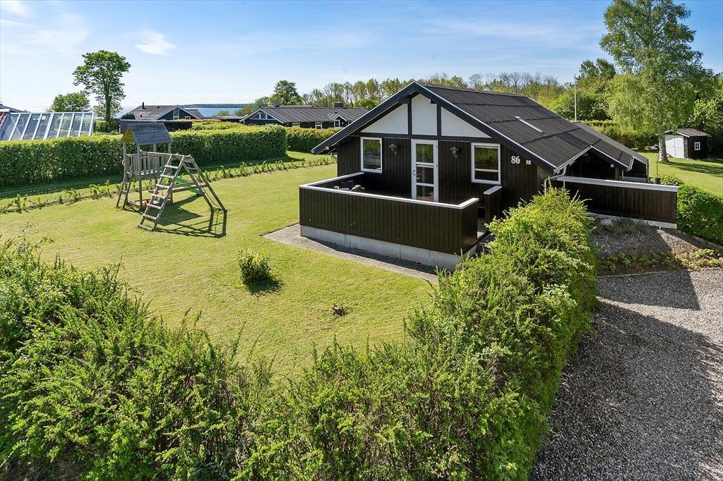 Das Ferienhaus liegt in einer ruhigen Ferienhaussiedlung – nur knapp 100 Meter vom Wasser und dem Badesteg entfernt. Das Grundstück bietet eine große Rasenfläche mit Platz zum Spielen und ist von einer kleinen Hecke umgeben. Die schöne, teilweise überdachte Holzterrasse bietet auf einer Hausseite Windschutz, auf der anderen Seite befindet sich eine weitere Terrasse am Eingang. Ein Grill und Gartenmöbel stehen zur freien Verfügung.