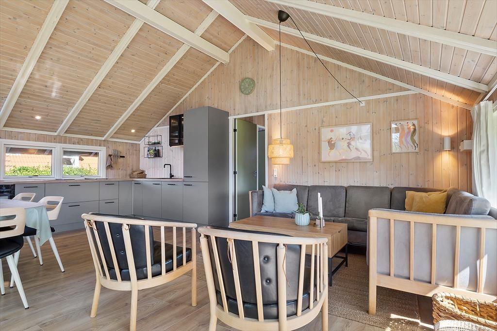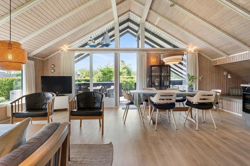 Das Ferienhaus empfängt Sie mit einer hellen und einladenden Atmosphäre und bietet viel Platz für die ganze Familie. Küche, Essbereich und Wohnzimmer sind offen gestaltet und verfügen über eine hohe Decke sowie direkten Zugang zur Terrasse. Im Wohnzimmer laden bequeme Möbel zum Entspannen oder Fernsehen ein – ganz nach Wunsch. Es stehen mehrere TV-Kanäle in Dänisch, Deutsch, Schwedisch und Norwegisch zur Verfügung. WLAN ist kostenlos nutzbar. Durch die großen Fenster fällt viel Tageslicht, was das gepflegte Haus besonders freundlich erscheinen lässt. Eine Wärmepumpe und Elektroheizung sorgen für angenehme Temperaturen.