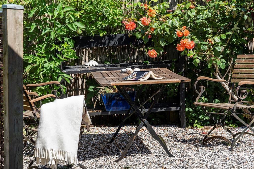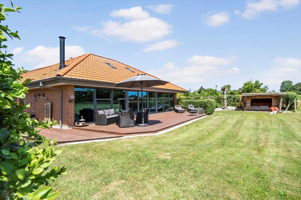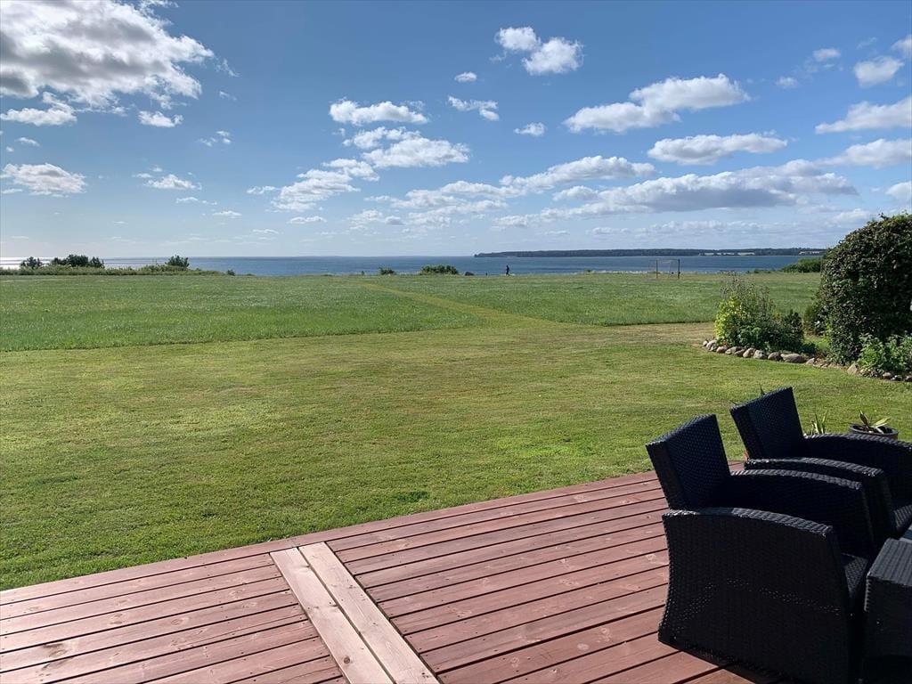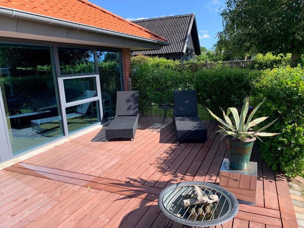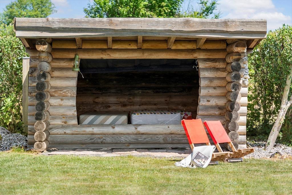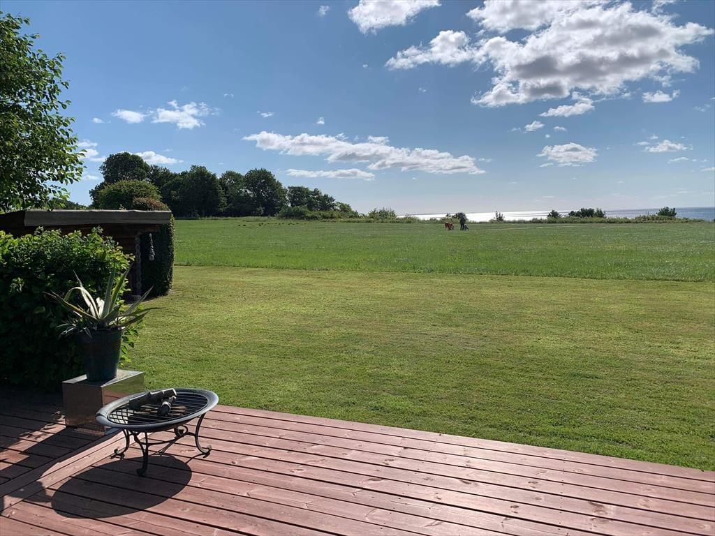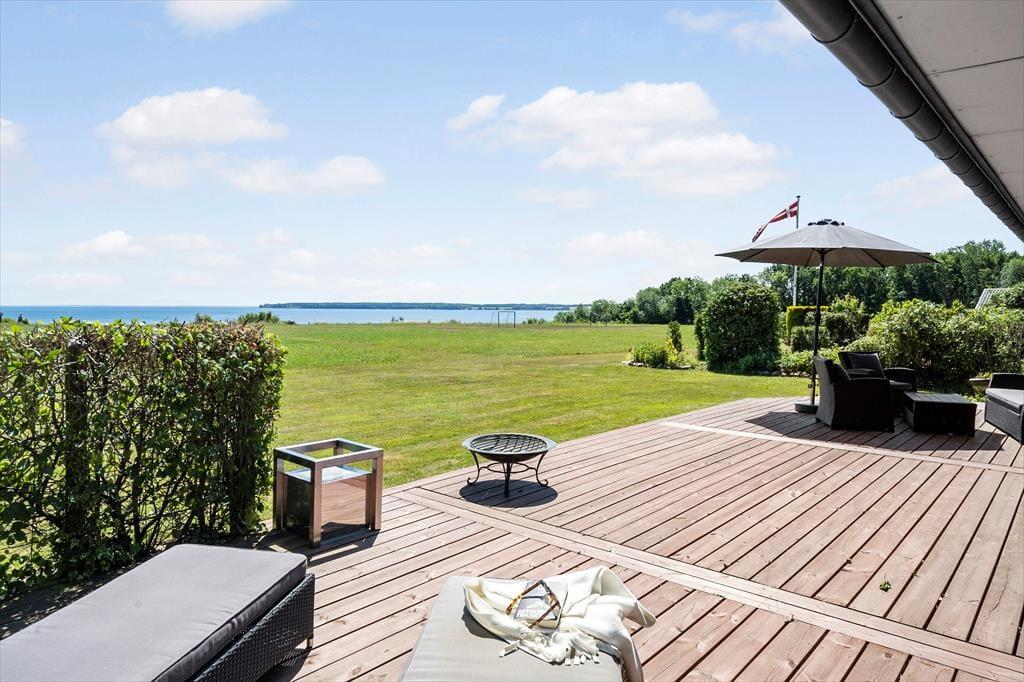 Das Ferienhaus ruht auf einem großen, offenen Grundstück, sodass Sie im Hausinneren und draußen eine fantastische Aussicht genießen. Vor dem Haus erstreckt sich eine schöne, nach Osten und Süden gerichtete Holzterrasse. Gute Gartenmöbel, Liegestühle, ein Grill und eine Feuerstelle laden zu entspannten Stunden im Freien ein. Vom Wohnraum gelangen Sie direkt hinaus auf die Terrasse. Wenn Sie über die Rasenfläche spazieren, erreichen Sie einen kleinen Pfad, der Sie direkt hinunter ans nur 50 Meter entfernte Wasser führt. Die Terrasse ist gemütlich von Büschen, einem Zaun und Pflanzgefäßen eingerahmt. Sie genießen eine gute Aussicht auf den gepflegten Garten. Auf dem Grundstück steht eine gemütliche Holzschutzhütte zur Verfügung. Diese steht schön geschützt hinter Büschen und besticht gleichzeitig mit einem fantastischen Meerblick.