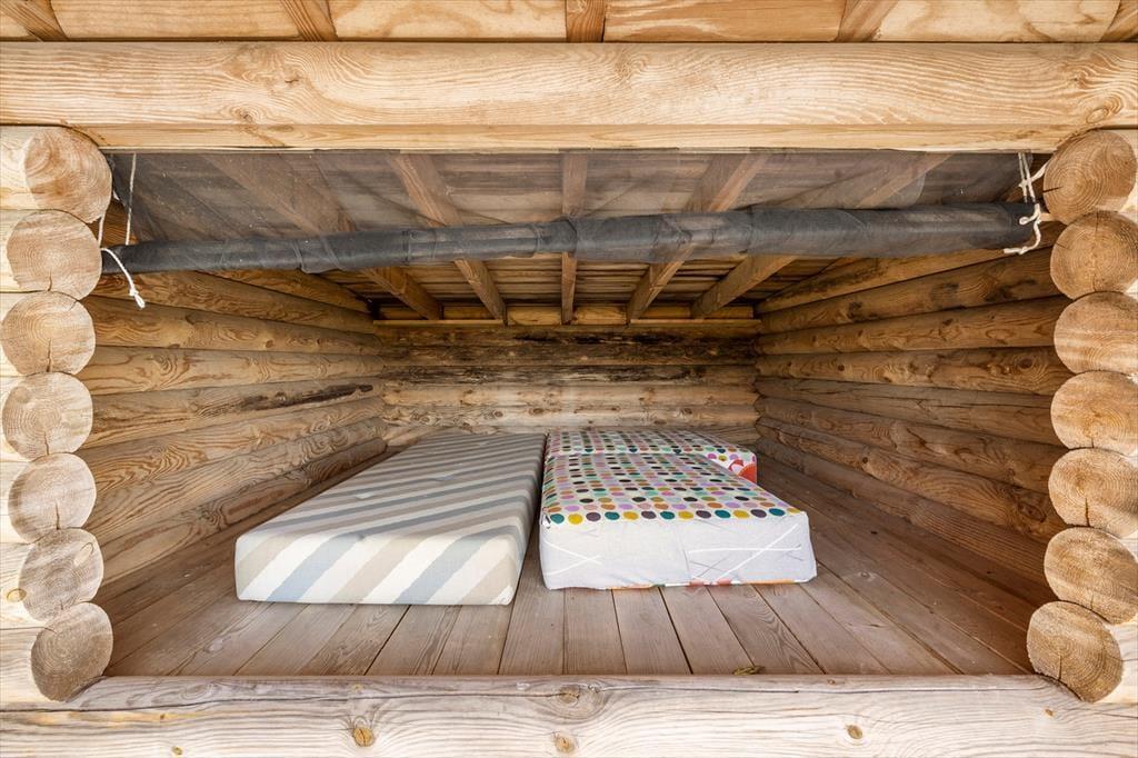 Auf dem Sofa werden Sie an kühlen Abenden mit der Wärme des zentral im Raum platzierten Kaminofens verwöhnt. Die heimelige Einrichtung und die fantastische Aussicht tragen dazu bei, dass Sie sich viel und gern in diesem Raum aufhalten. Die Küche ist direkt mit dem Wohn- und Essbereich verbunden, sodass Sie selbst während der Essenszubereitung schön im Familiengeschehen integriert bleiben. Zu den kücheneigenen Annehmlichkeiten zählen unter anderem ein Herd, ein Kühl-/Gefrierschrank, eine Kaffeemaschine und ein Geschirrspüler. Hinter der halbhohen Mauer ist ein weiterer kleiner Esstisch platziert, an dem Sie gut zu zweit essen können. Von hier können Sie direkt auf die Südterrasse hinaustreten. Vom Wohnraum gelangen Sie in ein Doppelzimmer, das mit der gleichen wunderbaren Aussicht über den Garten und die Bucht verwöhnt. Stellen Sie sich nur vor, wie Sie unmittelbar nach dem Erwachen auf das Meer blicken. Dieses große Schlafzimmer mit einem guten Doppelbett und einem Zugang zum eigenen Badezimmer ist definitiv einer der attraktivsten Räume im gesamten Haus. Das andere Schlafzimmer eignet sich wunderbar für Kinder. Es beinhaltet ein Einzelbett und ein Doppelbett mit einem darüber angebrachten Hochbett. Spiele und Spielsachen sorgen bei den Jüngsten für viel Spaß und Unterhaltung. Im Dachgeschoss steht ein weiterer Schlafraum zur Verfügung. Dieser ist über eine steile Treppe erreichbar und glänzt mit einer herrlichen Aussicht. Er ist mit Teppichboden ausgelegt und beinhaltet ein gutes Einzel- und ein Doppelbett. Eines der beiden Badezimmer ist vom großen Schlafzimmer aus zugänglich. Das andere verfügt über eine Dusche. Beide Bäder sind gefliest und mit einer Fußbodenheizung versehen. Im Hauswirtschaftsraum neben dem Eingangsbereich stehen Ihnen unter anderem ein Bügelbrett, eine Waschmaschine und ein zusätzlicher Hochstuhl zur Verfügung.