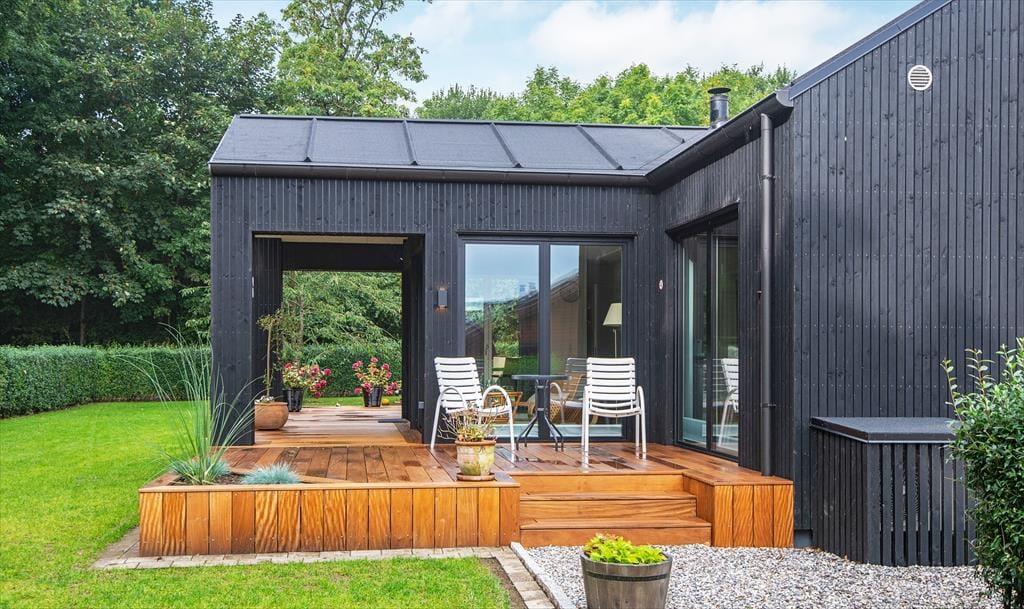 Die großen Fensterfronten lassen sich öffnen, sodass du direkten Zugang zur großen Holzterrasse hast.