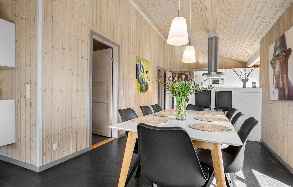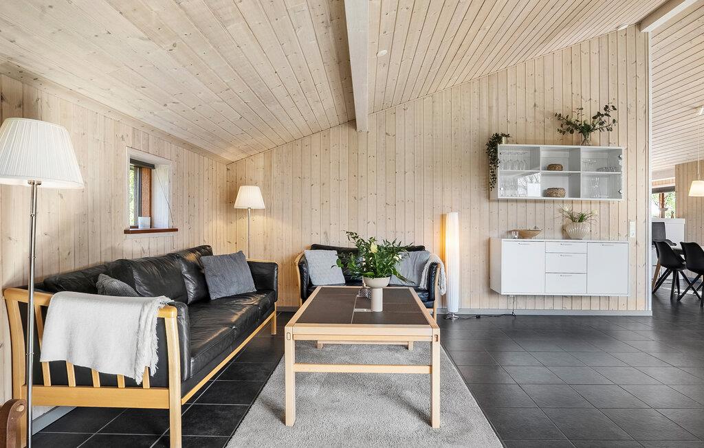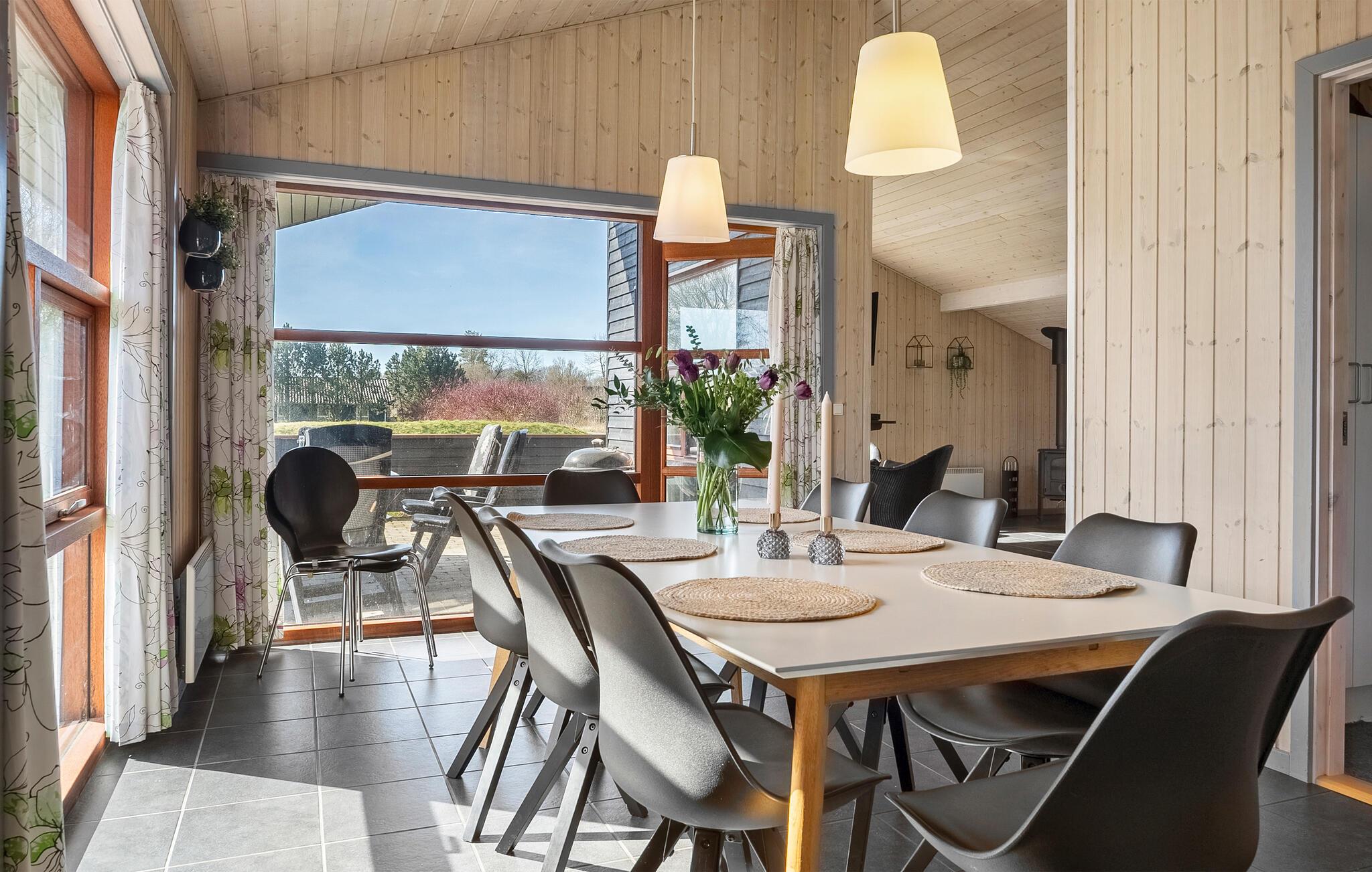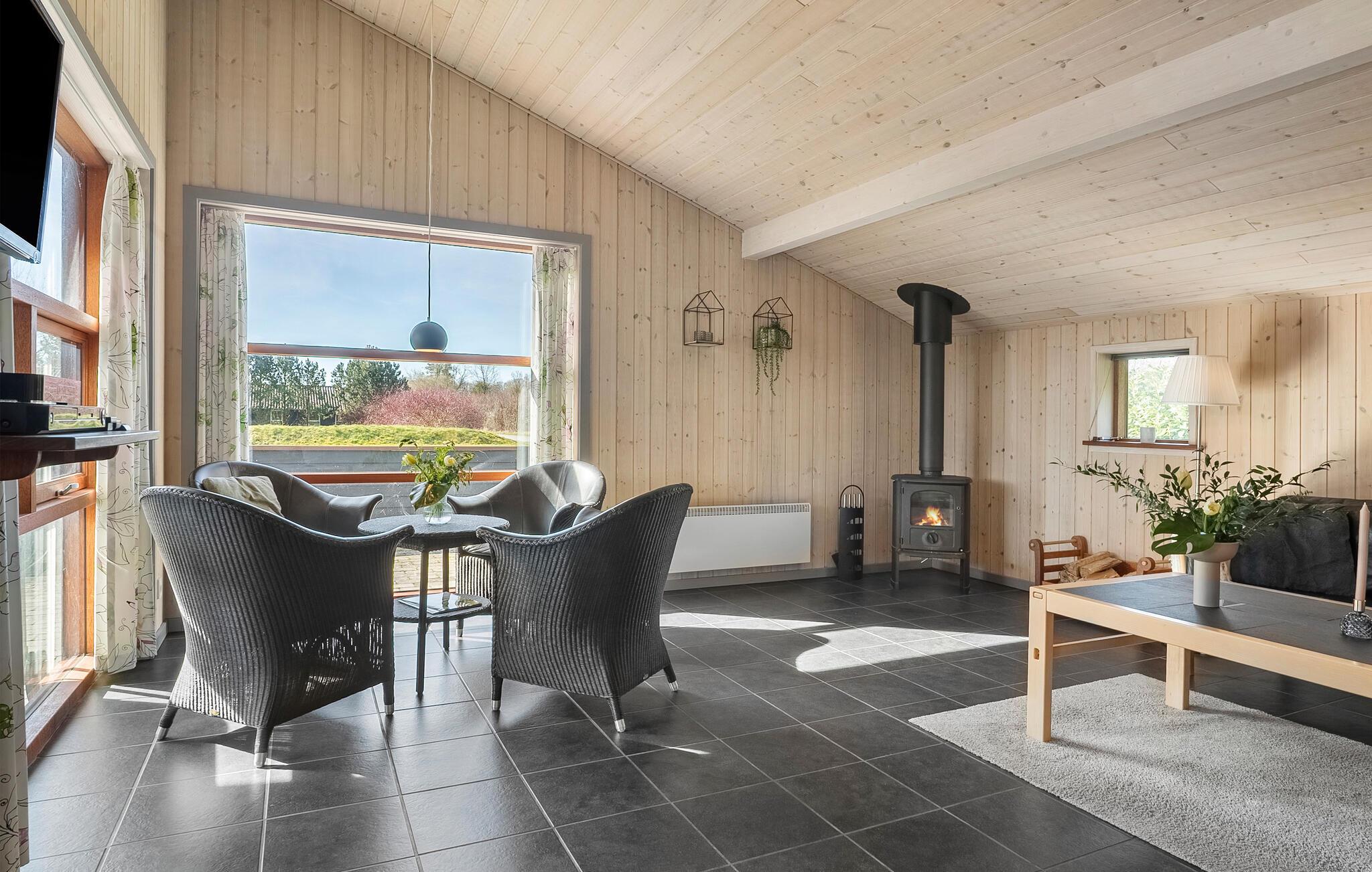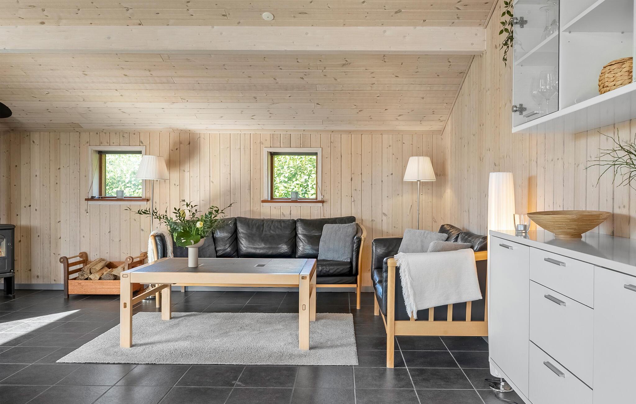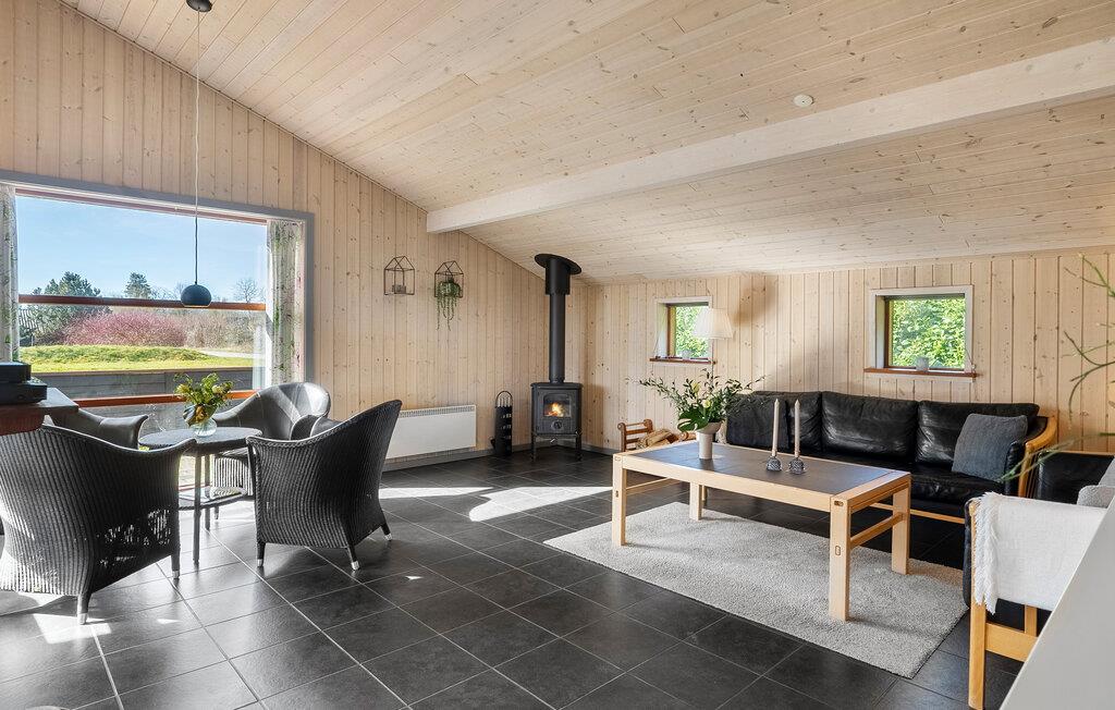 Freuen Sie sich auf den freundlichen Wohnbereich mit hohen Holzdecken, großen Fenstern und einer gemütlichen Atmosphäre. Machen Sie es sich auf dem Sofa bequem oder genießen Sie entspannte Stunden vor dem Kaminofen. Spielen Sie Karten, sehen Sie einen Film oder lassen Sie sich vom Blick ins Grüne inspirieren. Bereiten Sie Ihre Mahlzeiten in der modernen Küche zu und versammeln Sie sich am langen Esstisch zu Frühstück, Abendessen oder geselligen Runden. Wellnessliebhaber kommen im Whirlpool und in der Sauna voll auf ihre Kosten.