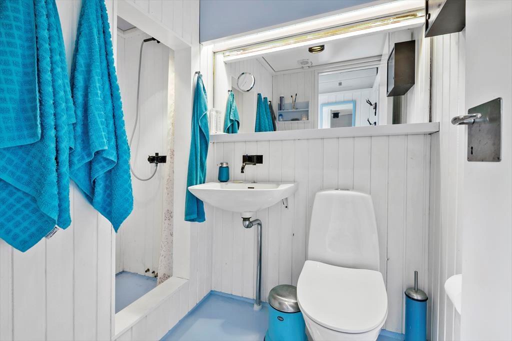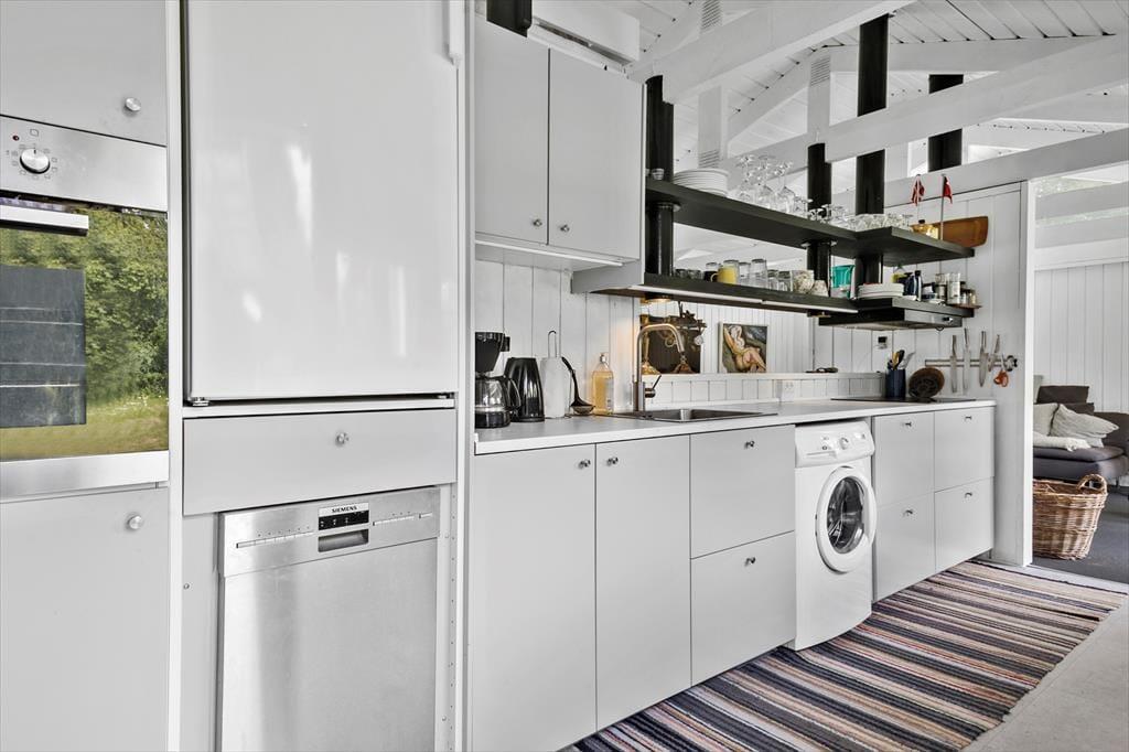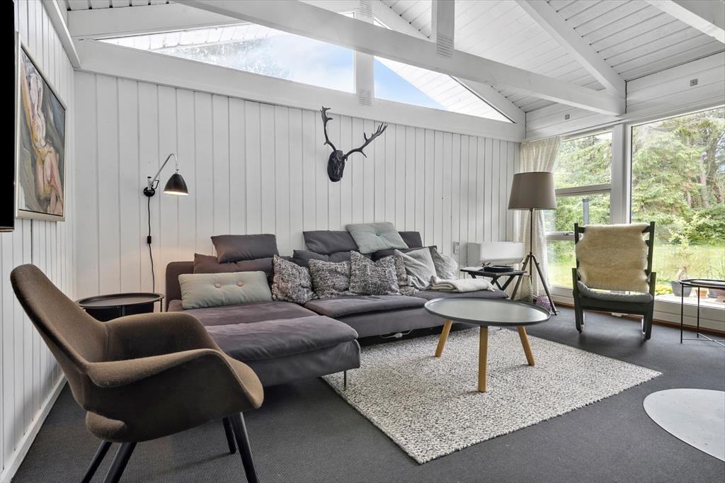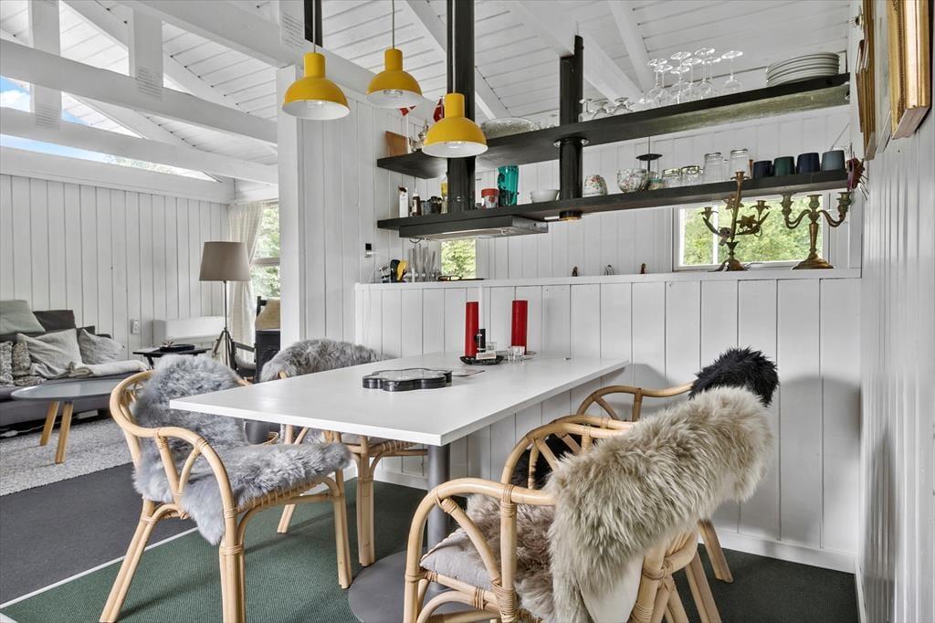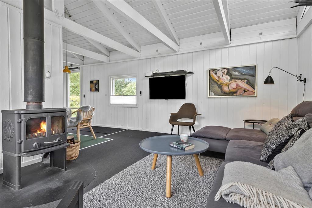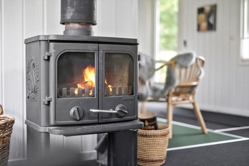 Sowohl von der Küche als auch vom Wohnzimmer aus gelangst du auf eine schöne, teilweise überdachte Holzterrasse und weiter hinaus in den ungestörten Garten, in dem sich auch eine Feuerstelle befindet. Hier kannst du die warmen Tage und die warmen Abende genießen, und wenn der Tau fällt, kannst du dich unter die Überdachung zurückziehen.