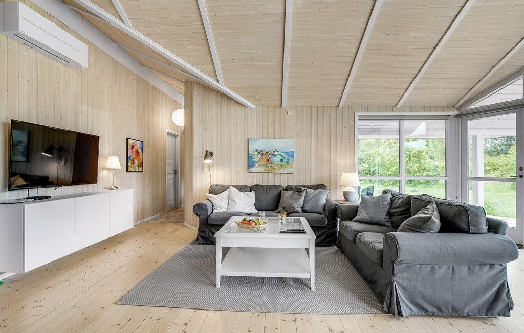 Im Wohnzimmer befindet sich ein 55-Zoll-LED-Smart-TV mit Altibox Basic + TV-Paket (DR1, DR2, TV2, TV2SpXrt, 3, 3+, 3PULS, National Geographic Channel (HD), DR Ramasjang, DK4 (HD), UPTOWN Classic, UPTOWN Dänisch, TV2-Regionen, lokales Fernsehen, Folketinget, Nr. (HD), 2 (HD), SVT1 (HD), SVT2 (HD), 4 (HD), 2DF (HD), RTL (HD), 1 (HD) inkl. Streaming-Filmfavoriten und verschiedene andere Streaming-Dienste.