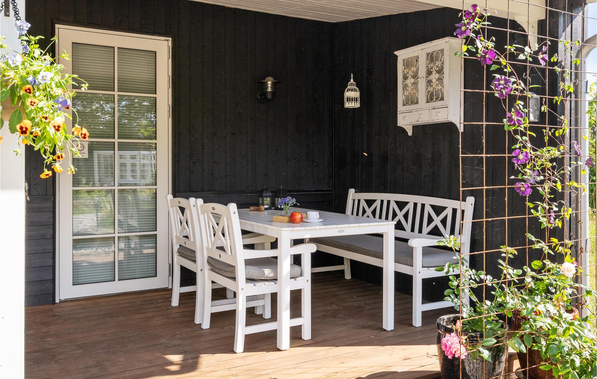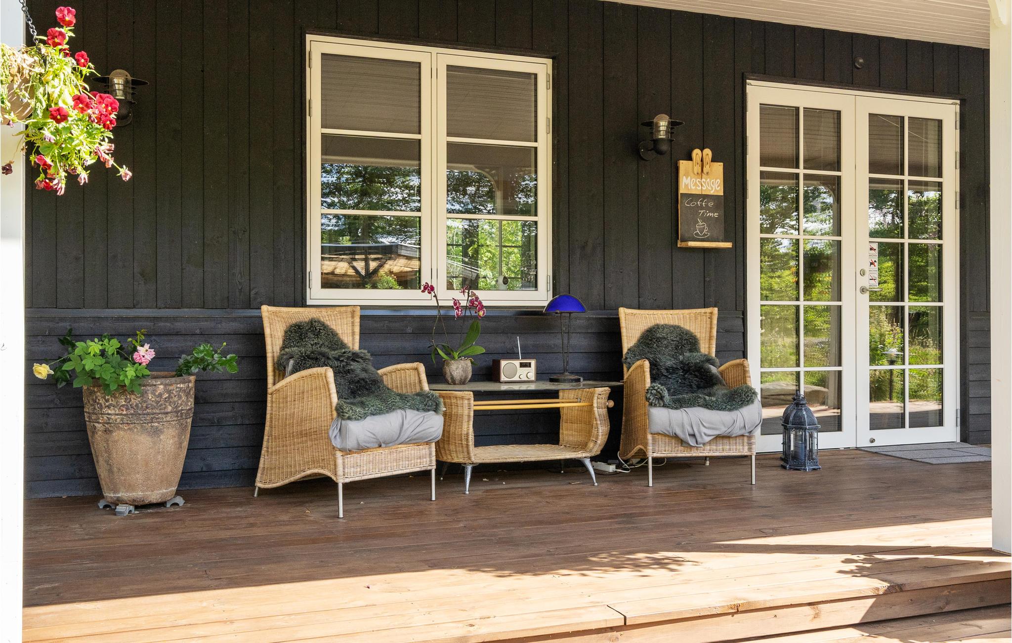 Ein Highlight des Hauses ist die große überdachte Veranda, wo Sie geschützt mit Blick in den Garten sitzen können. Entspannen Sie hier mit einem guten Buch, während die Kinder auf dem Grundstück spielen.