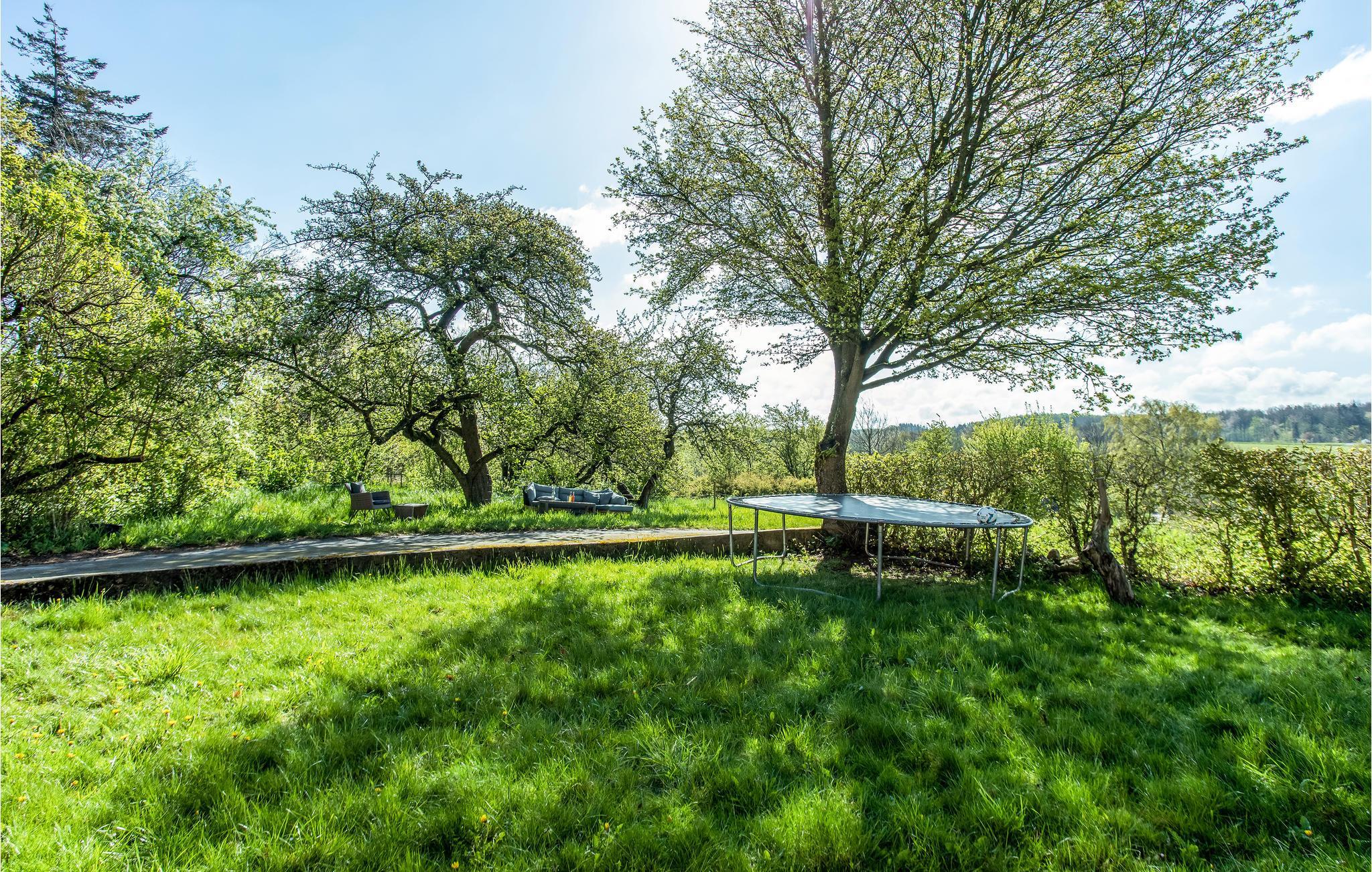 Das auf einem offenen Grundstück gelegene Haus liegt dicht am Wald und bietet Ihnen eine wunderbare Aussicht über die Landschaft. Auf dem Grundstück gibt es große Obstbäume, an denen Sie sich nach Belieben bedienen können, und auch den Tieren, die auf den angrenzenden Feldern grasen, können Sie und Ihre Kinder ganz nah kommen.