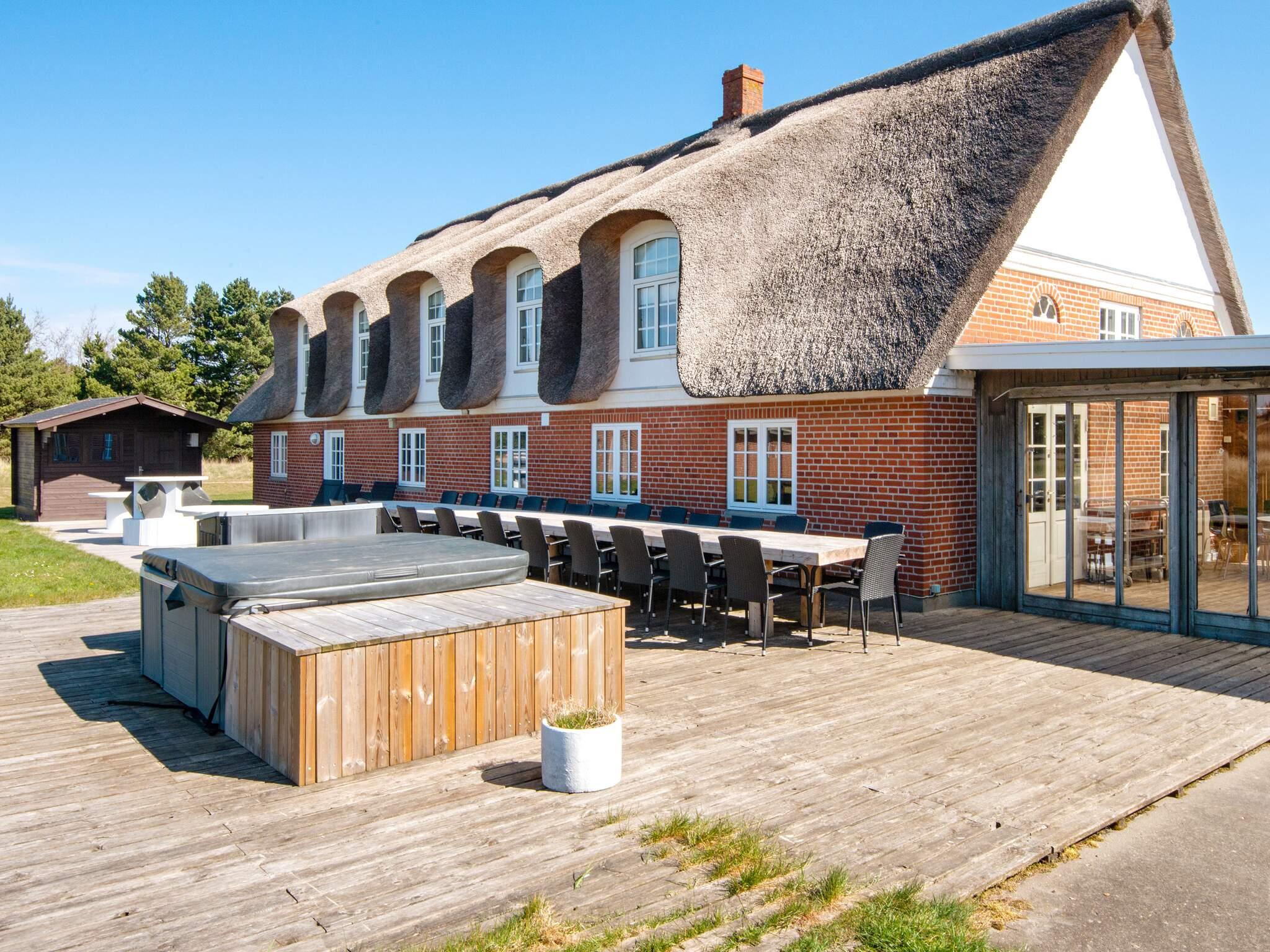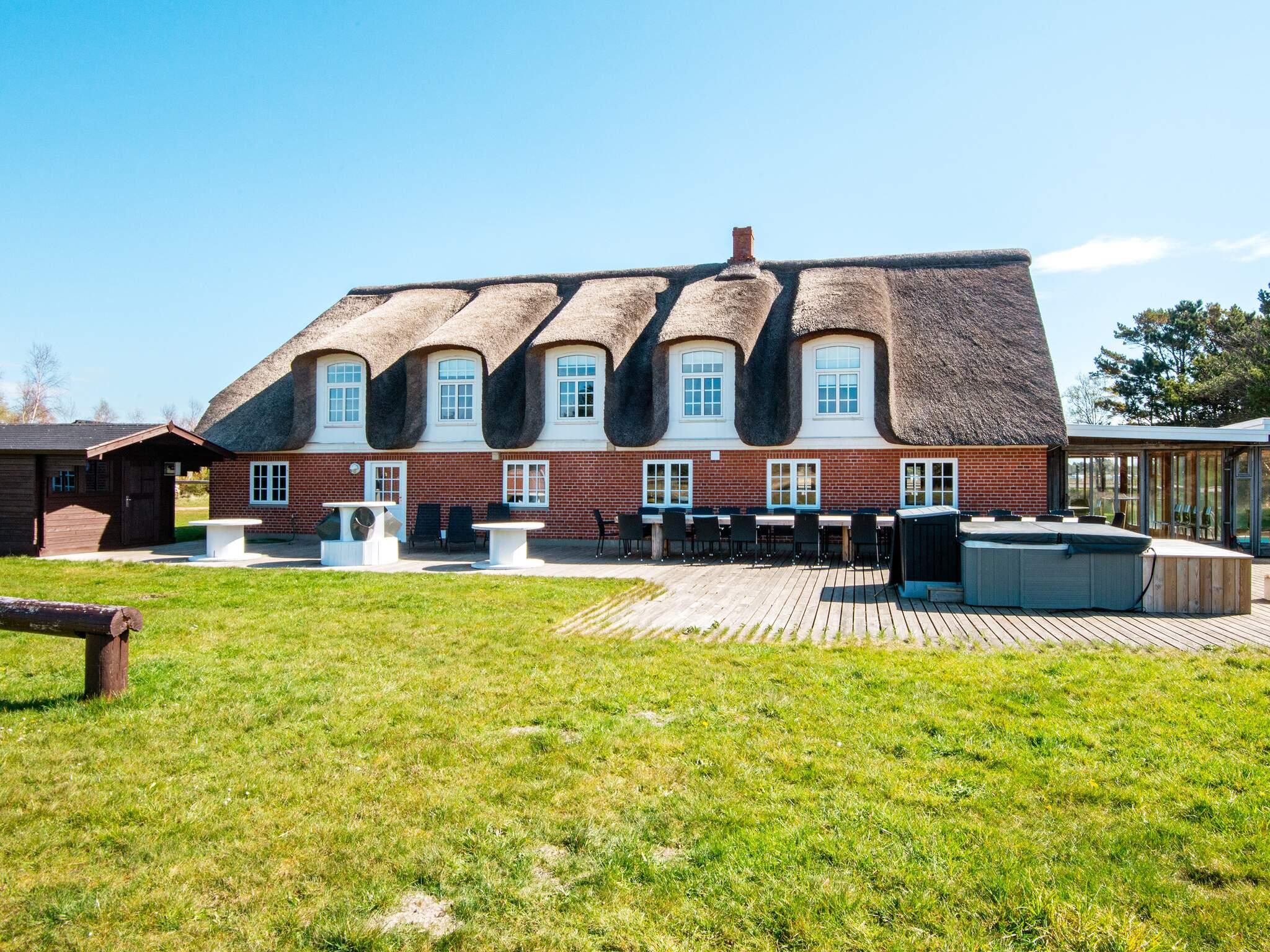 Attraktives, reetgedecktes Ferienhaus mit überdachtem Swimmingpool, Whirlpool im Freien und Saunahäuschen auf der Terrasse. Das äußerst geräumige Feriendomizil befindet sich auf einem weitläufigen, malerisch gelegenen Naturgrundstück mit 9.000 m2 großer Fläche und Ausblick zur Dünenlandschaft ringsum. Sie wohnen hier nur wenige Autominuten von Sønderstrand entfernt, einem herrlich breiten und kinderfreundlichen Strand mit seichtem Uferbereich, sandigem Boden und Dünen.