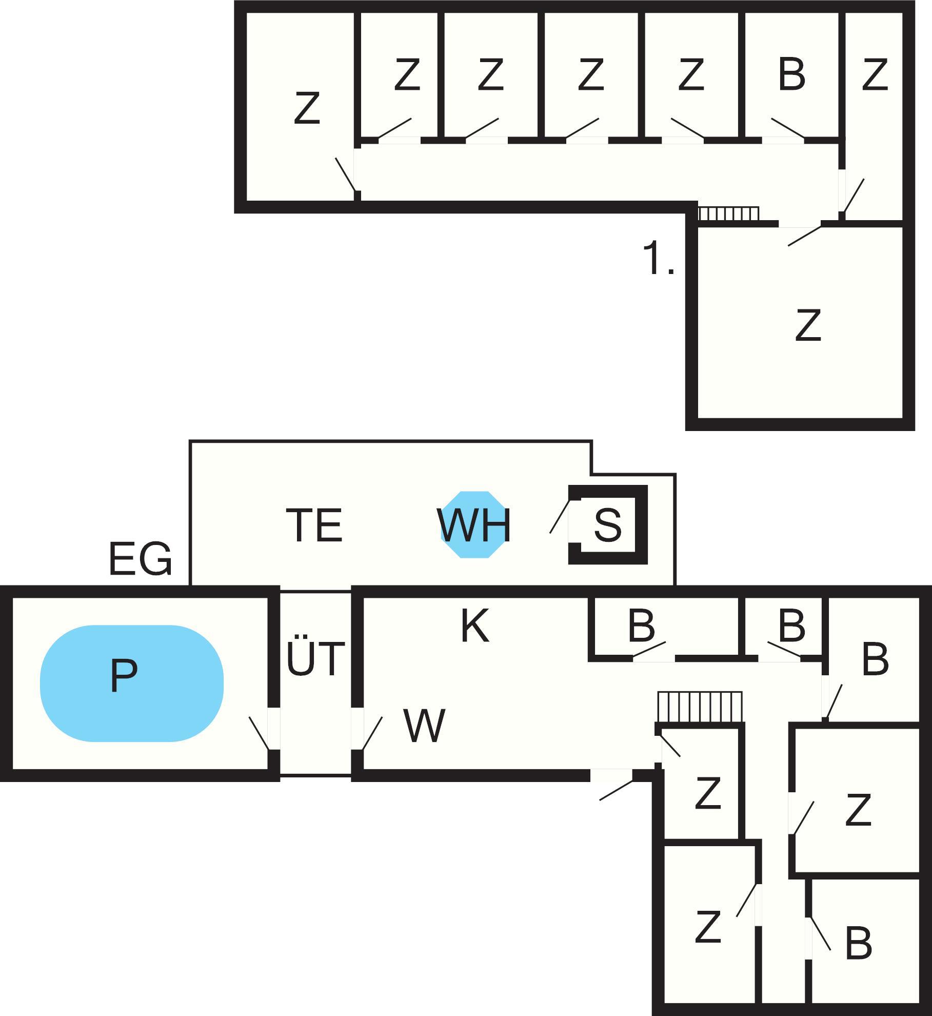 10 Schlafz.: (1DB)+(1DB)+(1DB)+(1DB)+(1DB)+(2DB)+(1DB)+(1DB)+(1DB+1B)+(1DB+2B), Kinderbett