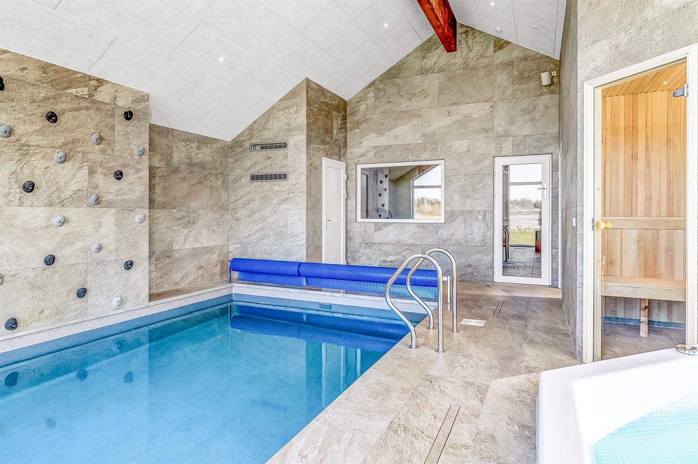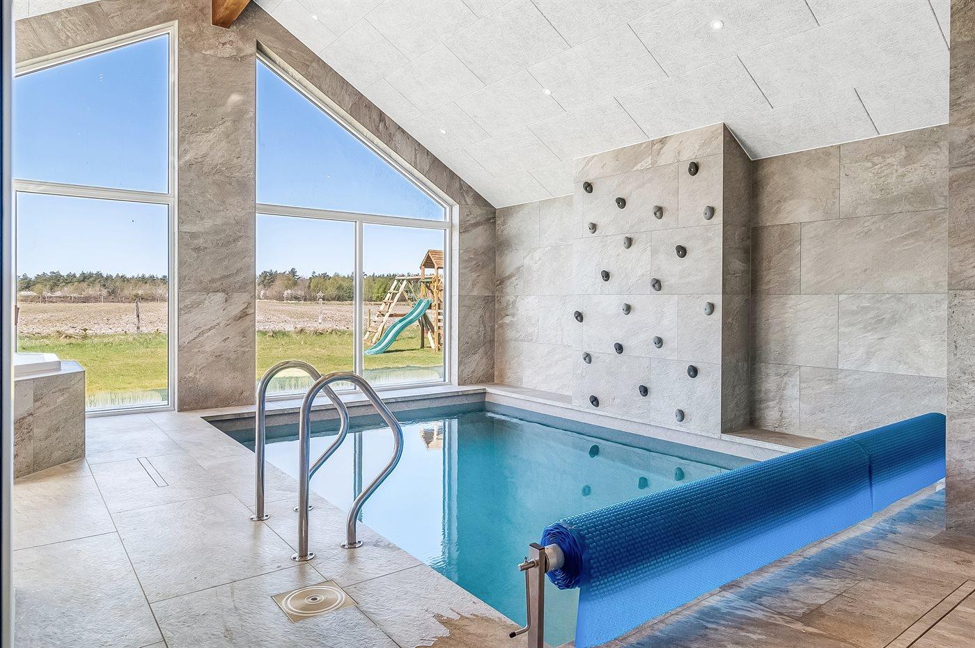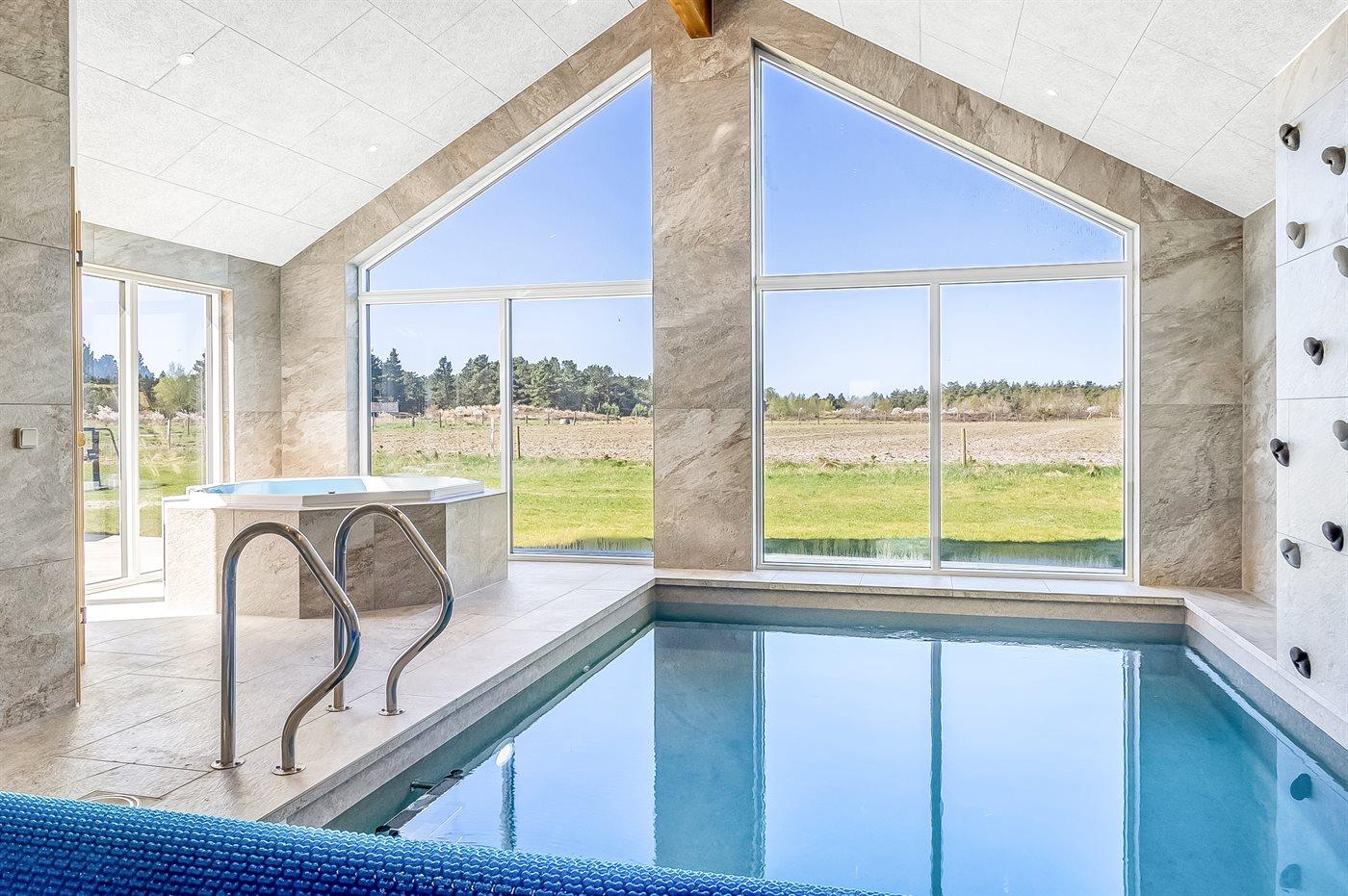 Der große Swimmingpool-Bereich des Hauses lädt euch sowohl zu lustige als auch entspannende Stunden ein. Hier gibt es einen Swimmingpool mit Gegenstromanlage, eine Kletterwand für Abenteuerlustige sowie eine Sauna und einen Whirlpool für ultimative Entspannung. Der Pool ist bis zu 3,5 Meter breit, 5 Meter lang und 1,35 Meter tief. Die Wassertemperatur liegt zwischen 28 und 32 °C. Vom Poolbereich aus könnt ihr die schöne Aussicht auf die umliegenden Felder genießen.