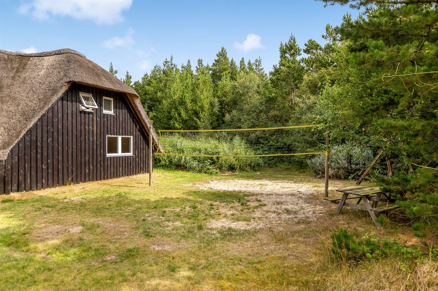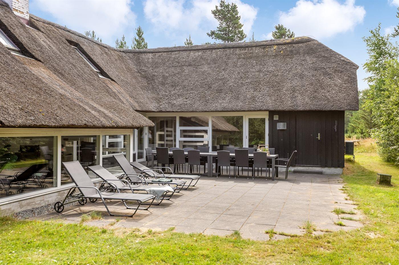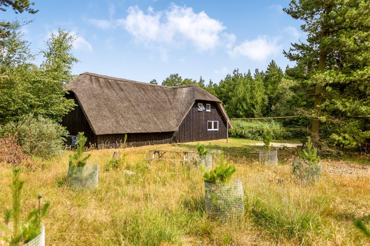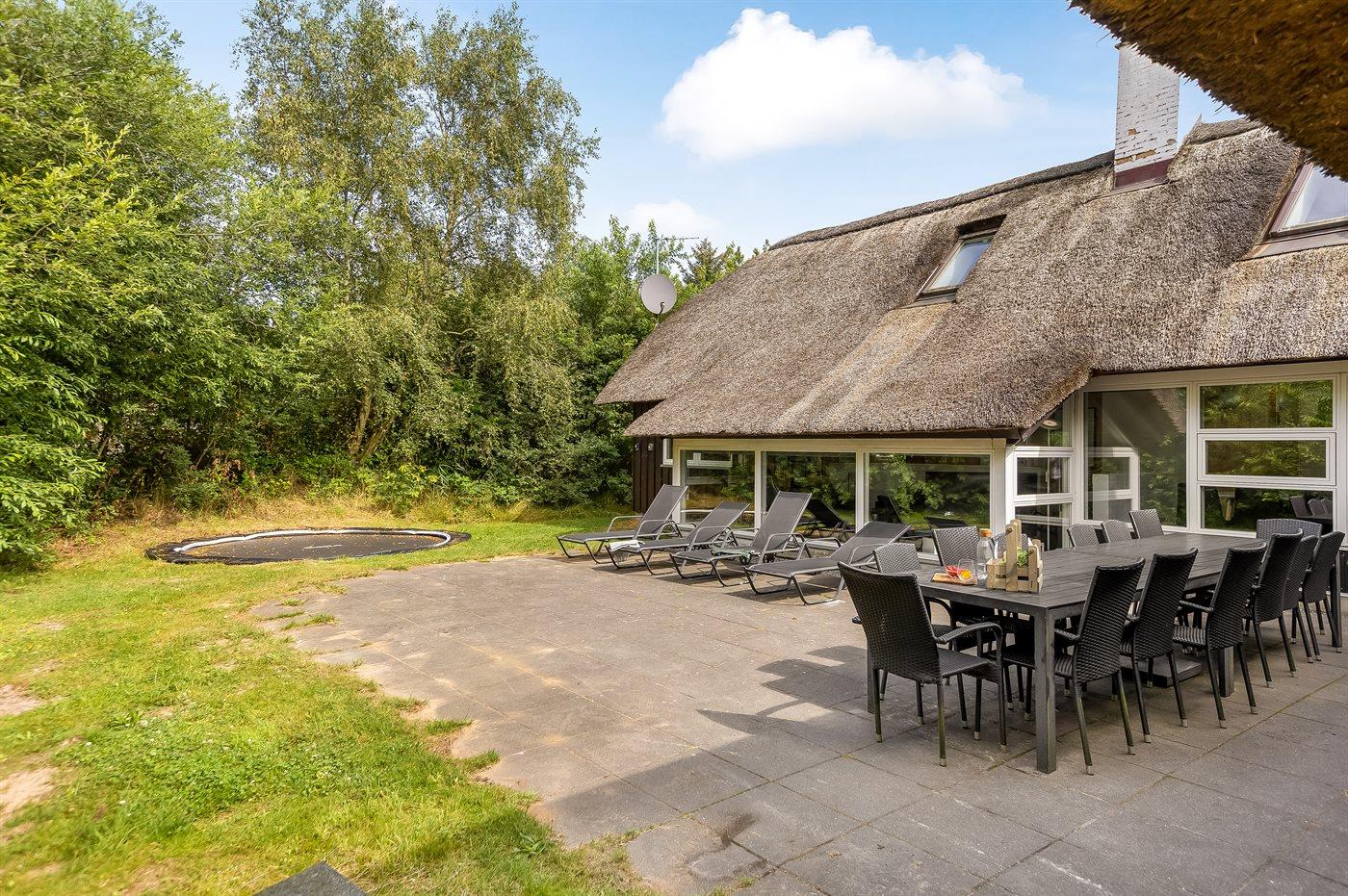 Dieses Ferienhaus mit Reetdach liegt auf einem von Bäumen umgebenen Naturgrundstück - nicht weit vom schönen, breiten Strand entfernt. Zum Haus gehört eine große, ungestörte Terrasse mit Gartenmöbeln und gutem Windschutz. Das Wohnzimmer mit großer Fensterfront liegt in versetzter Ebene. Übrigens: Zusätzlich zu den 5 Schlafzimmern gibt es 2 Schlafplätze in Einzelbetten im offenen Obergeschoss.