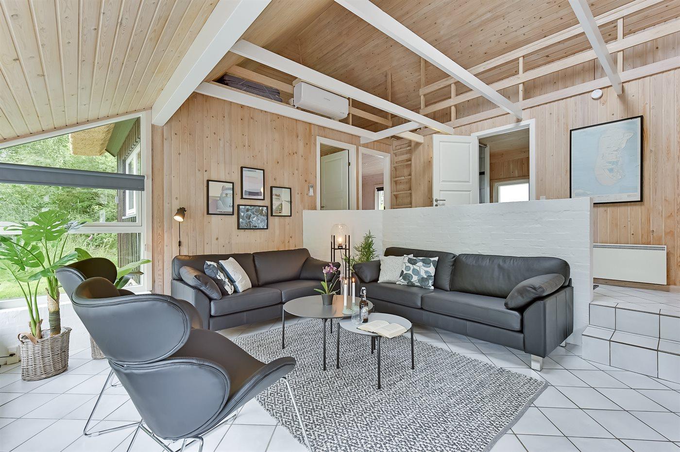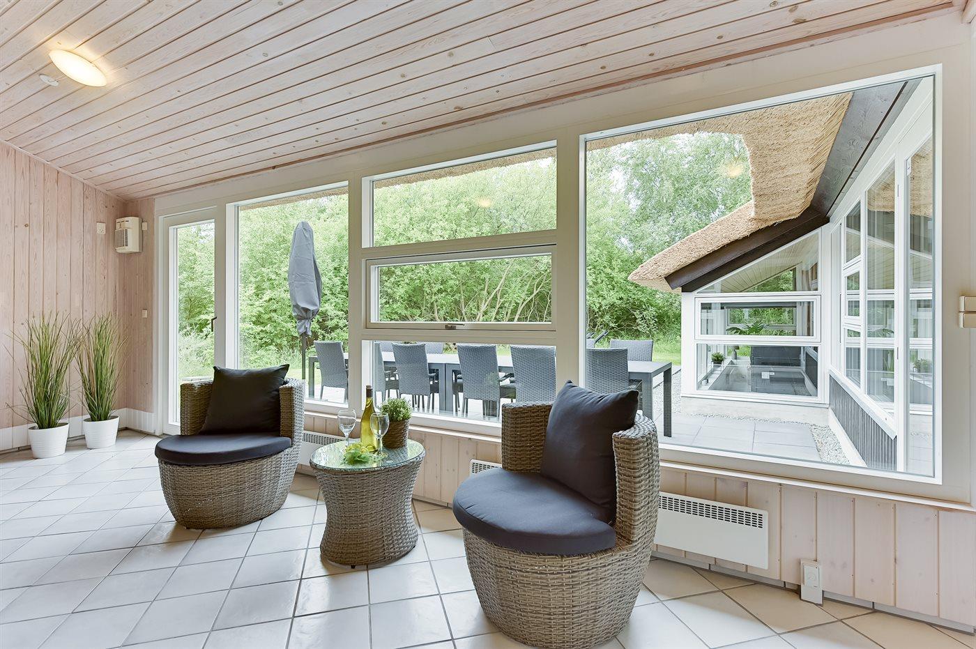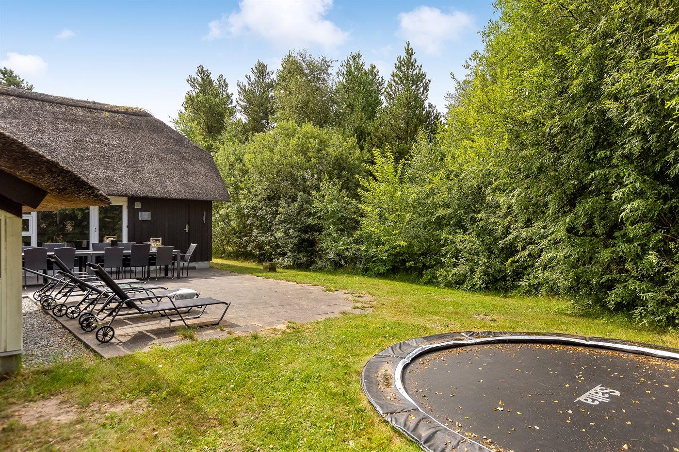 Dieses Ferienhaus mit Reetdach liegt auf einem von Bäumen umgebenen Naturgrundstück - nicht weit vom schönen, breiten Strand entfernt. Zum Haus gehört eine große, ungestörte Terrasse mit Gartenmöbeln und gutem Windschutz. Das Wohnzimmer mit großer Fensterfront liegt in versetzter Ebene. Übrigens: Zusätzlich zu den 5 Schlafzimmern gibt es 2 Schlafplätze in Einzelbetten im offenen Obergeschoss.