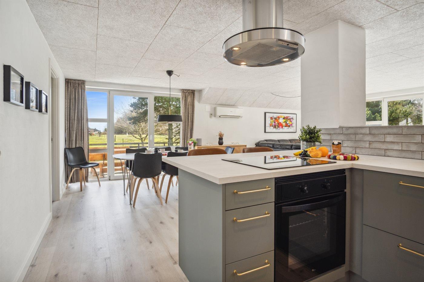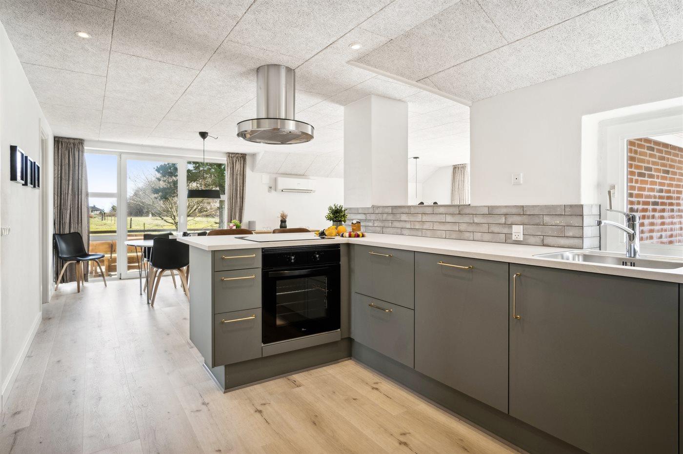 Die Küche ist mit Kühl-/Gefrierschrank ausgestattet. Außerdem gibt es 4 elektrische Kochplatten, Backofen, Umluftofen, Mikrowelle sowie Geschirrspüler. Fußbodenheizung in der Küche.