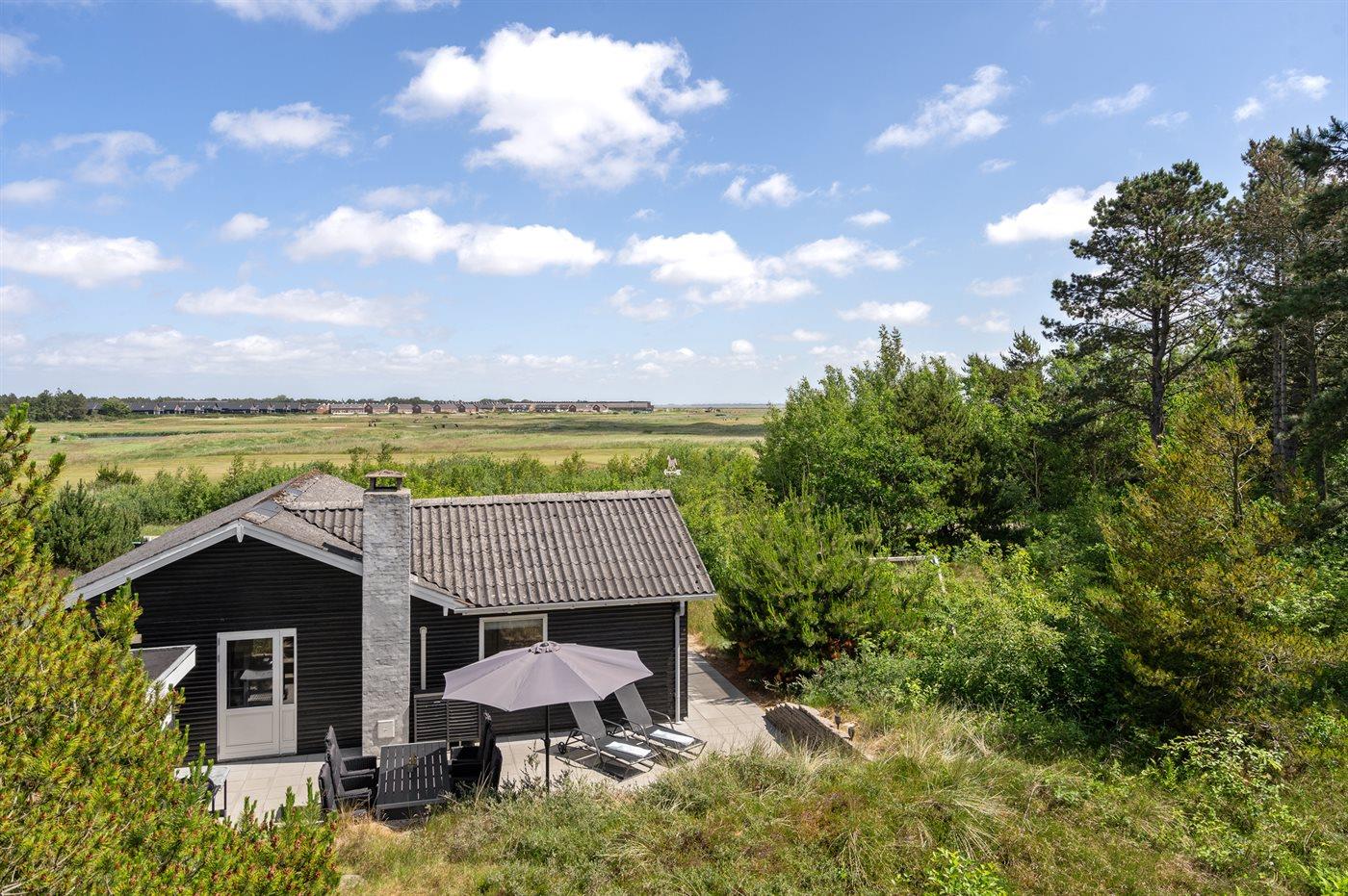 Gemütliches Ferienhaus auf Rømø mit großem Garten, Terrasse und Blick auf den Golfplatz, ideal für einen entspannten Urlaub in Dänemark.