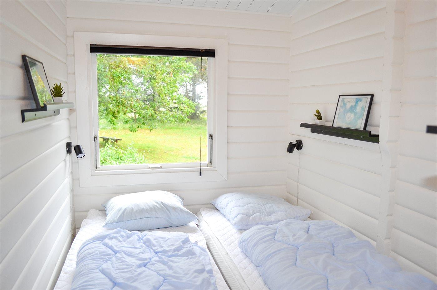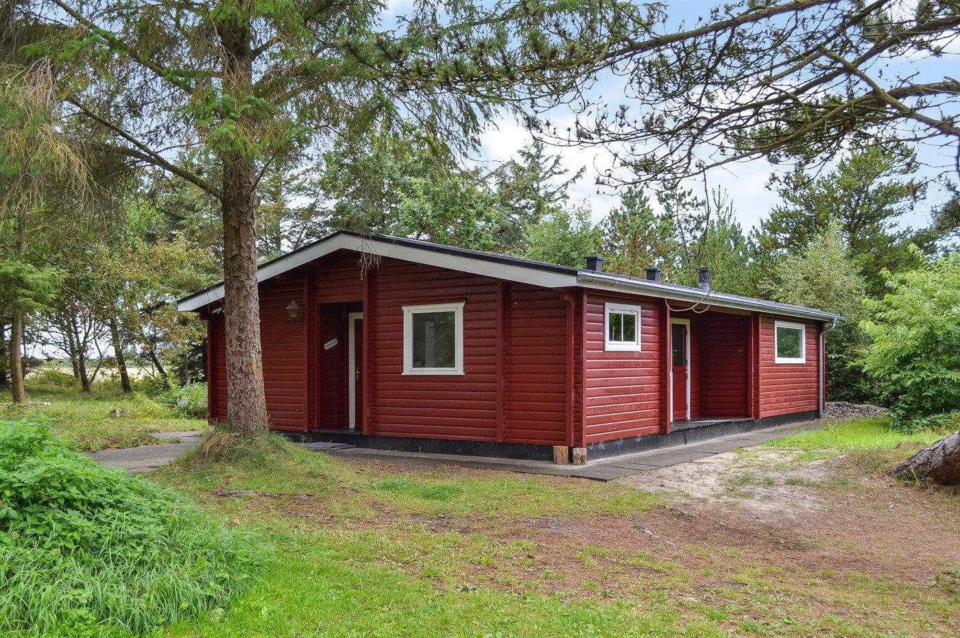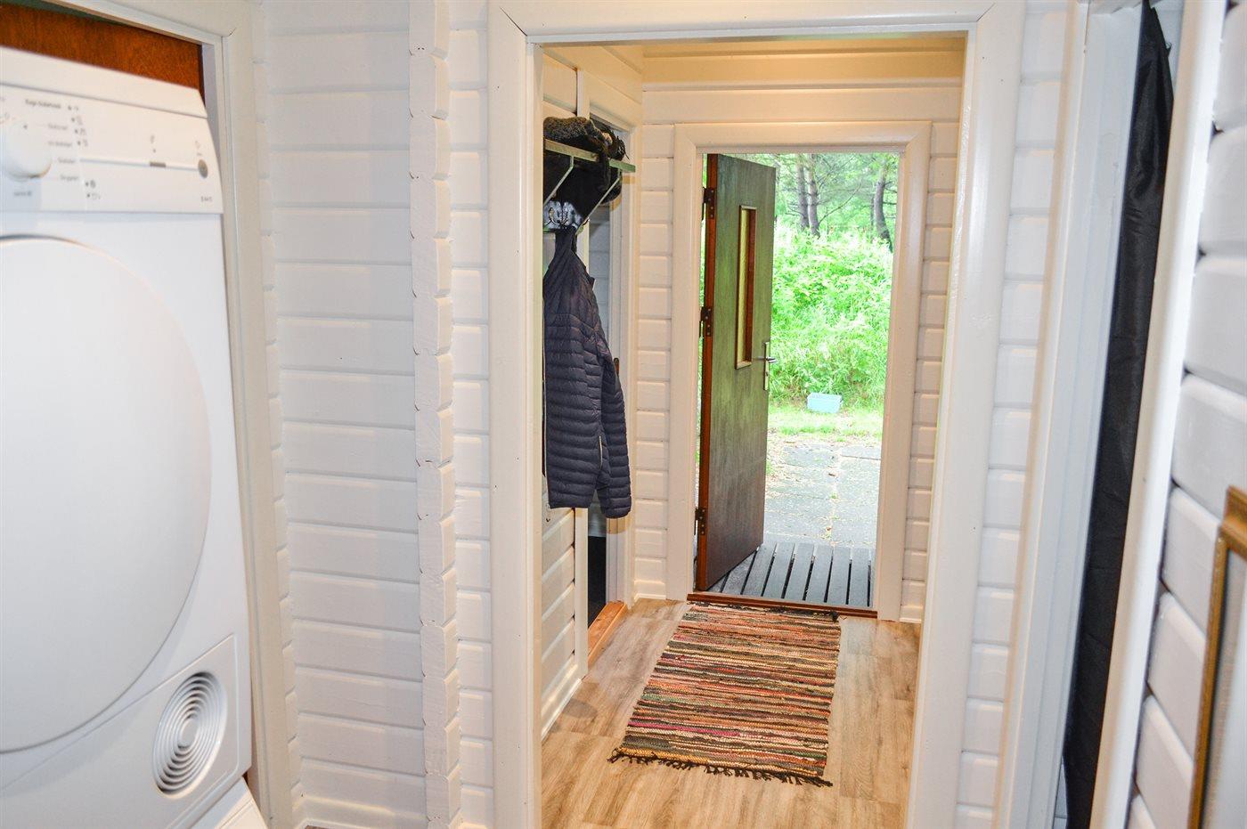 Dieses Blockhaus liegt in schöner Umgebung dicht am Strand und von Bäumen umgeben auf einem großen Naturgrundstück. Zum Haus gehört eine schöne, nach Süden gerichtete, teils überdachte Terrasse. Übrigens: Der Alkoven ist durch ein Vorhang vom Flur getrennt.