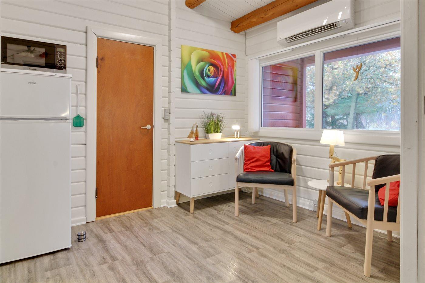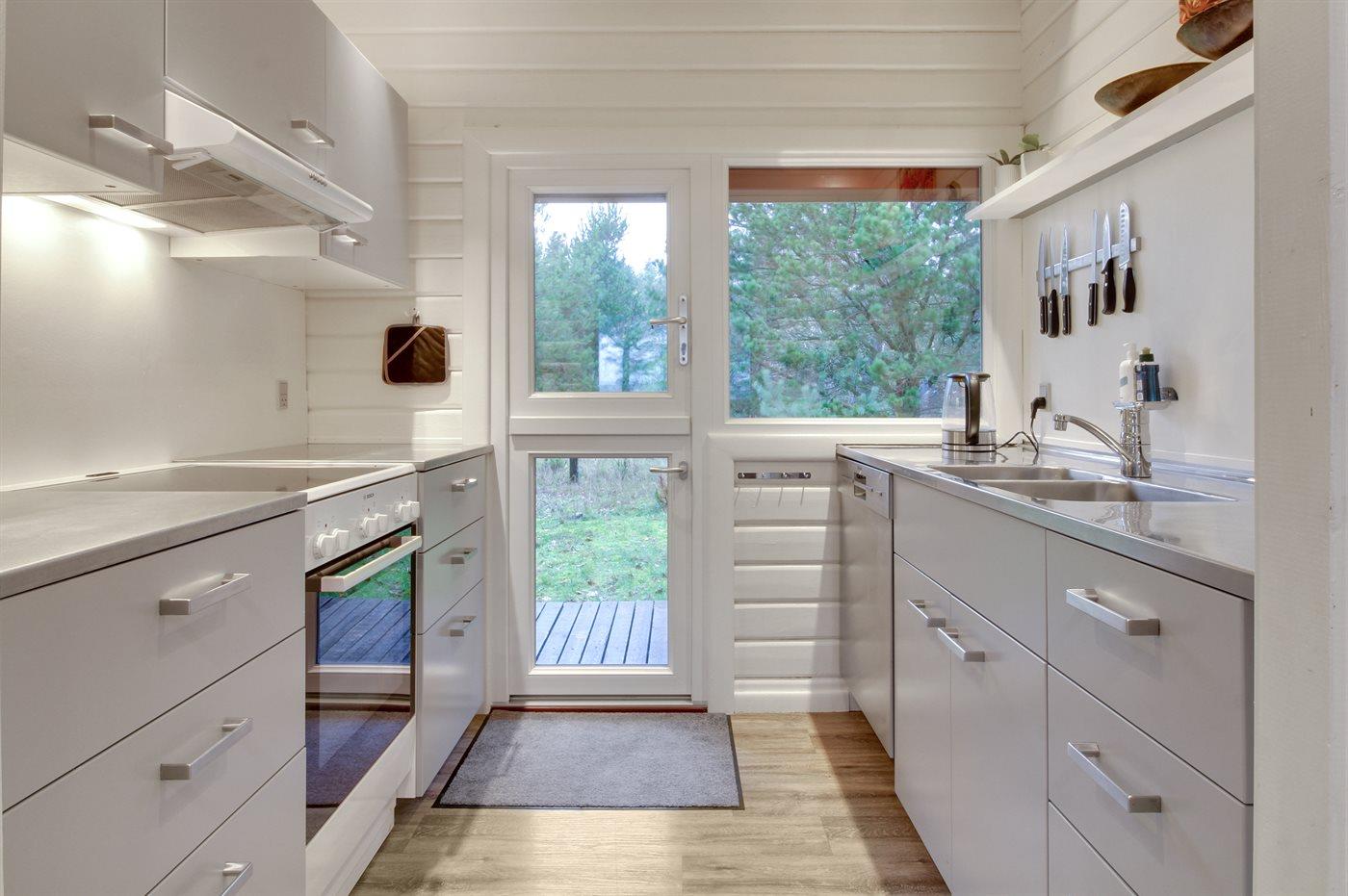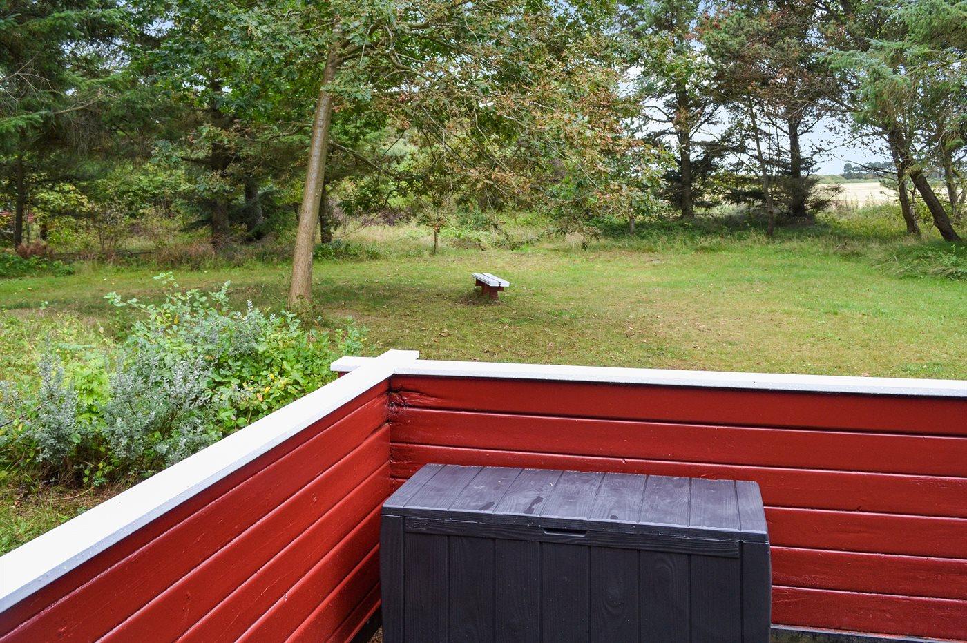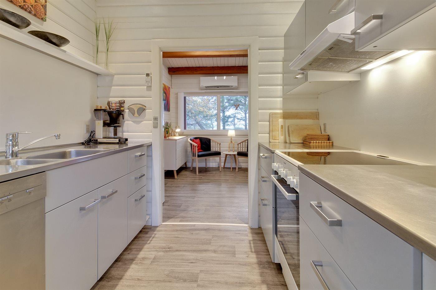 Dieses Blockhaus liegt in schöner Umgebung dicht am Strand und von Bäumen umgeben auf einem großen Naturgrundstück. Zum Haus gehört eine schöne, nach Süden gerichtete, teils überdachte Terrasse. Übrigens: Der Alkoven ist durch ein Vorhang vom Flur getrennt.