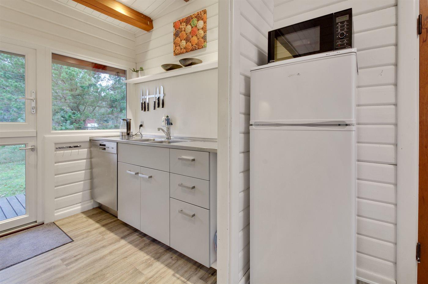 Die Küche ist mit Kühlschrank ausgestattet. Außerdem gibt es 4 elektrische Kochplatten, Umluftofen, Mikrowelle sowie Geschirrspüler.