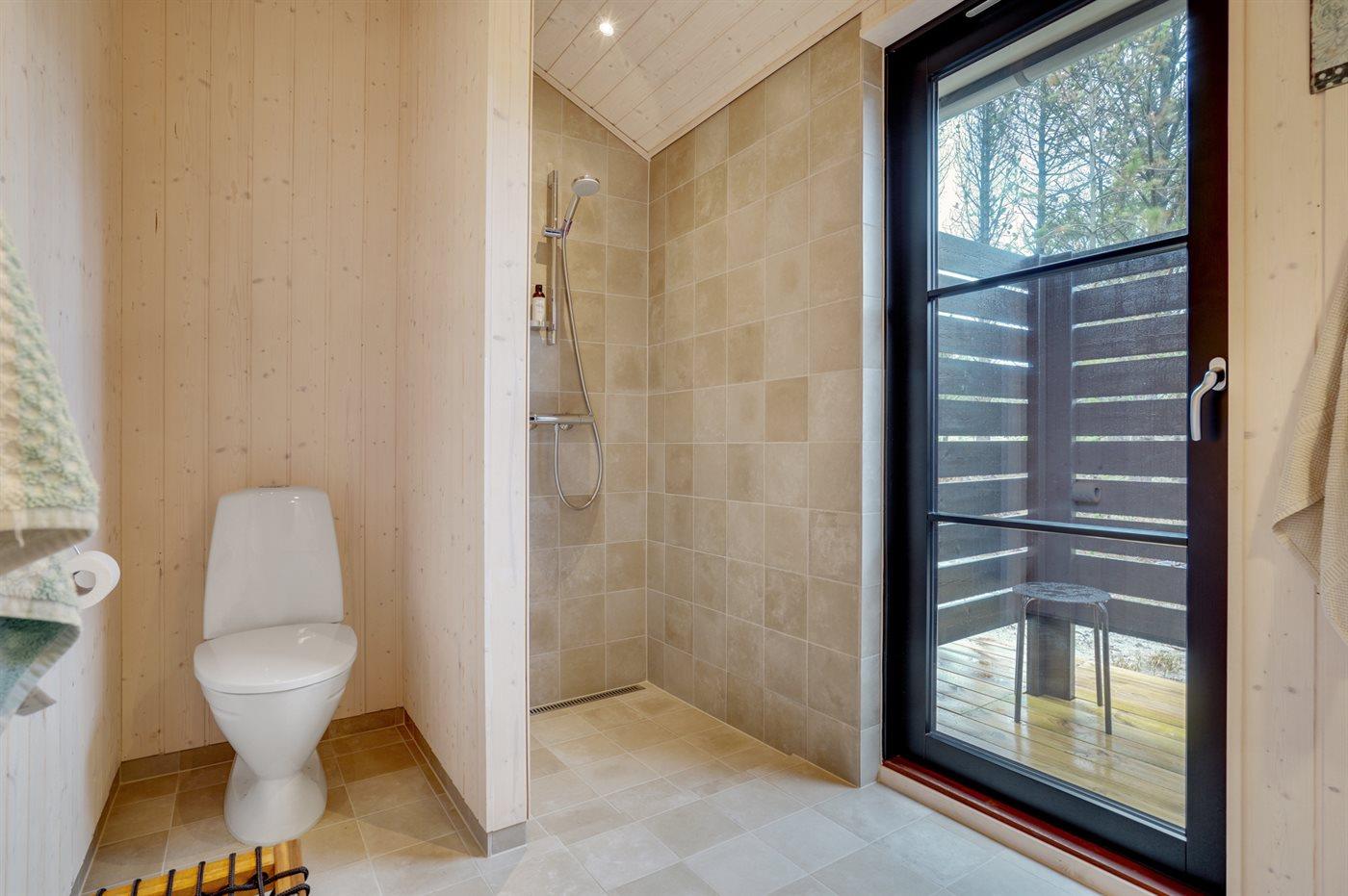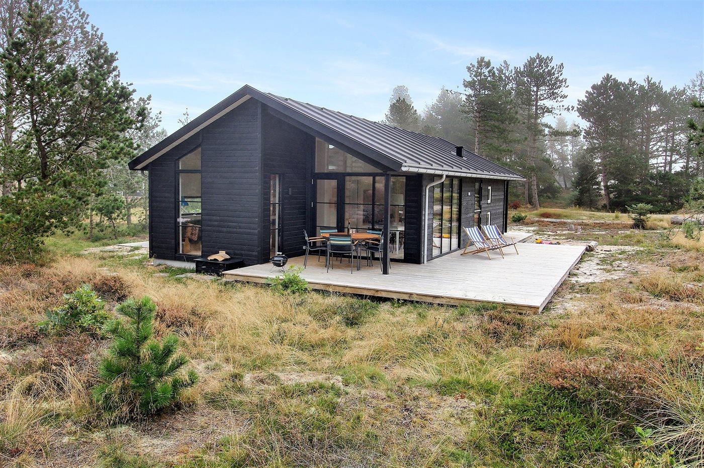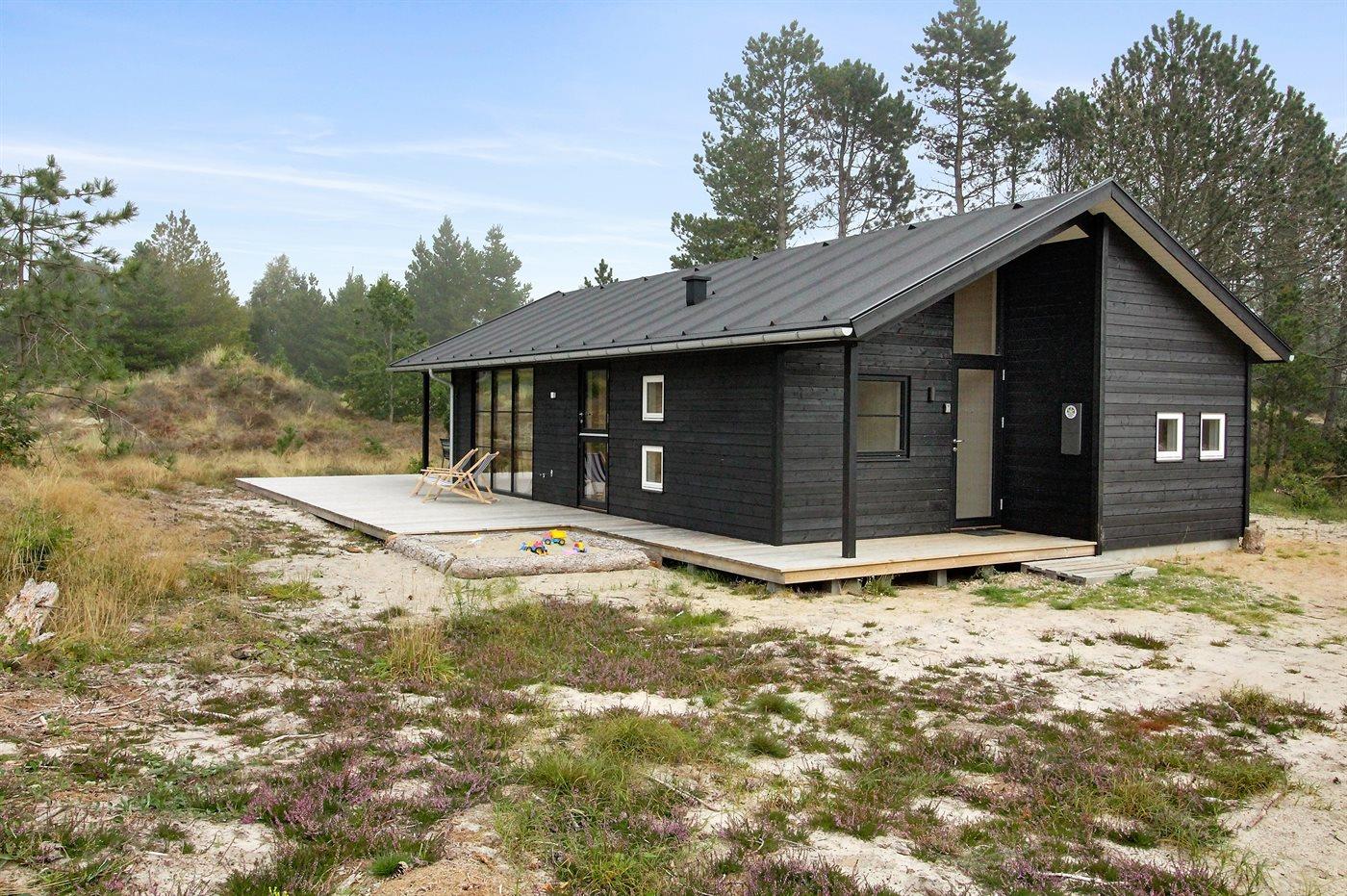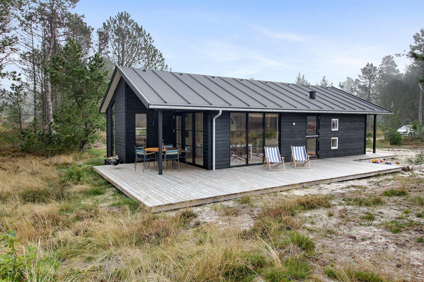 Modernes Ferienhaus auf Rømø mit Terrasse, Außendusche und Nähe zum Wattenmeer, ideal für Familien und Naturliebhaber.