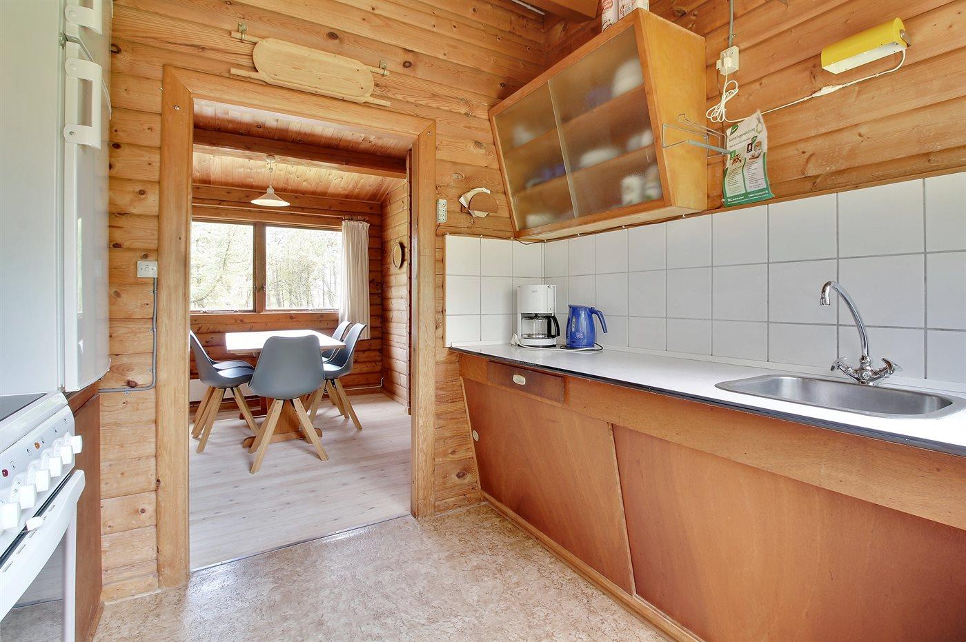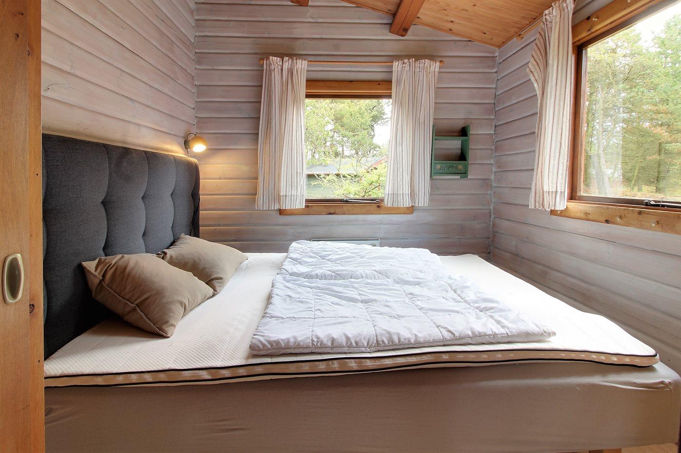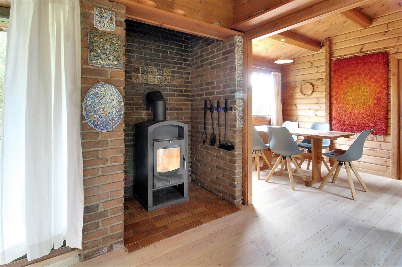 Nettes Balkenferienhaus auf einem Naturgrundstück, das von Bäumen umgeben ist, gelegen.