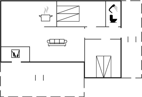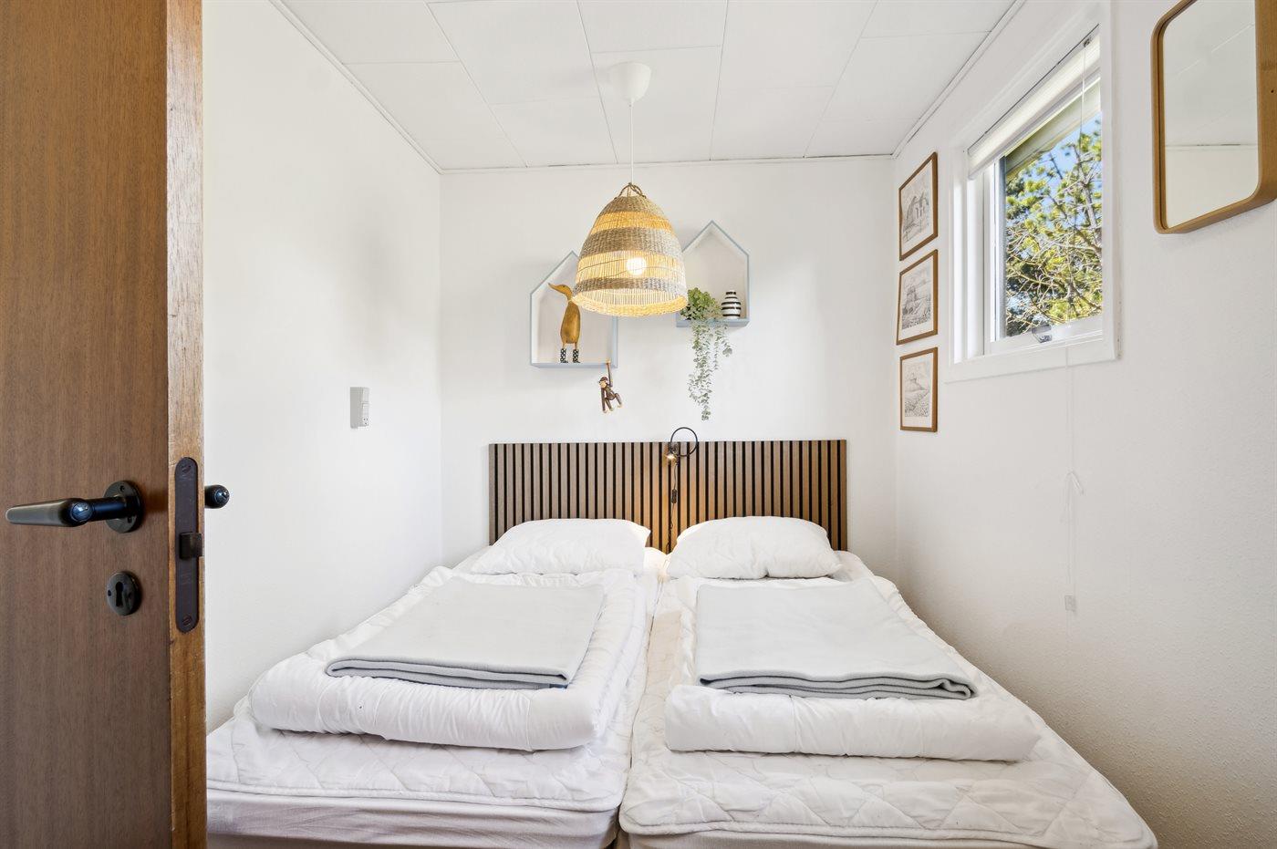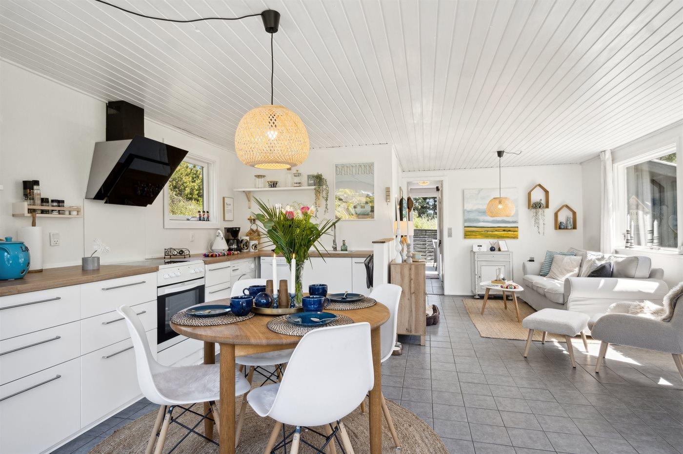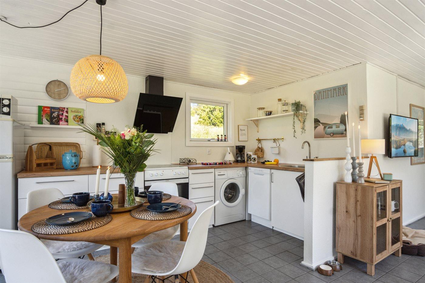 Das Ferienhaus, 1965 gebaut, wurde kontinuierlich renoviert und tritt hell und einladend mit vielen modernen Annehmlichkeiten hervor. Es gibt einen Eingangsbereich mit Fußbodenheizung und Platz für Jacken und Schuhe, zwei gute Schlafzimmer; das eine mit Doppelbett und das andere mit zwei Einzelbetten, ein gemütliches Wohnzimmer mit Kaminofen und offener Verbindung zur hellen Küche, wo es einen Essbereich und Zugang zur Terrasse gibt. Das Badezimmer des Hauses verfügt über Fußbodenheizung und eine Duschnische. Für die kleinsten Feriengäste stehen ein Hochstuhl und ein Kinderbett zur Verfügung. Das Ferienhaus wird durch eine Luft-Luft-Wärmepumpe beheizt, die ganzjährig ein gutes Raumklima gewährleistet.