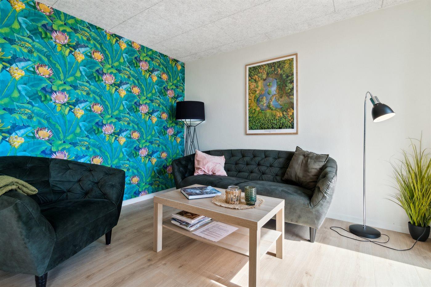 Die Wohnung liegt zusammen mit zwei weiteren identischen Ferienwohnungen am Stadtrand von Rønne, sodass man leicht Zugang zu den Einkaufsmöglichkeiten der Stadt hat – ebenso wie zu einer Reihe von Restaurants und Gaststätten. Ein 18-Loch-Golfplatz befindet sich in der Nähe. Wenn man einen Badeurlaub plant, ist der Sandstrand von Stampen sowohl beliebt als auch leicht erreichbar – nur etwa 200 Meter von der Ferienunterkunft entfernt.