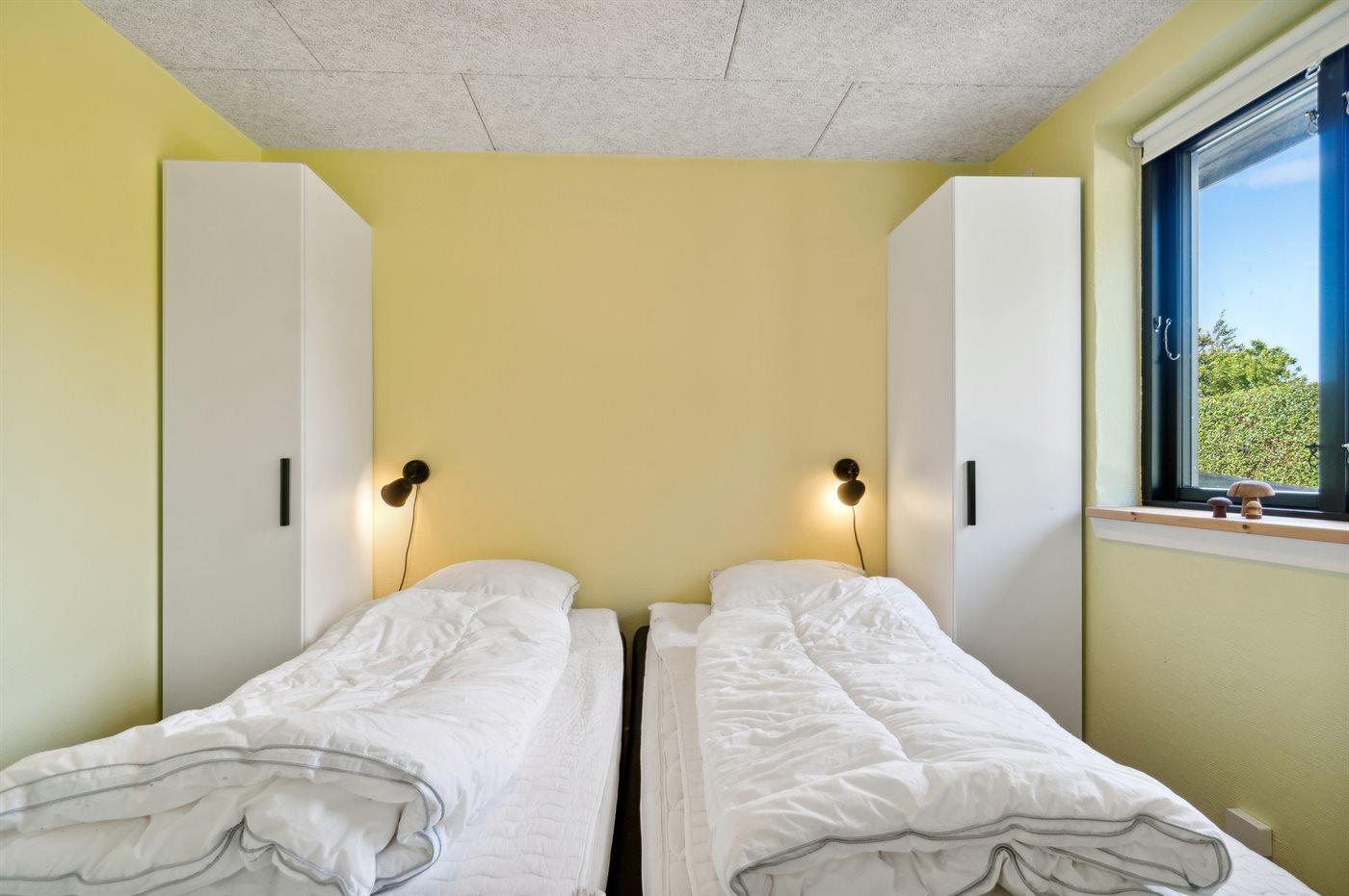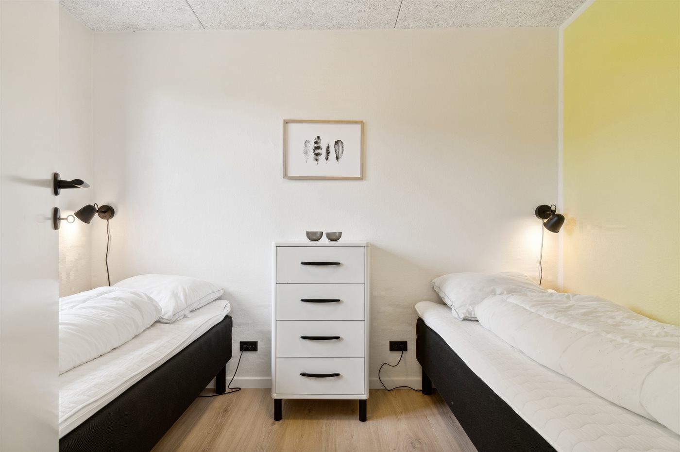 Die Schlafplätze verteilen sich auf 2 Schlafräume. 2 Schlafplätze in einem Doppelbett. 2 Schlafplätze in Einzelbetten.