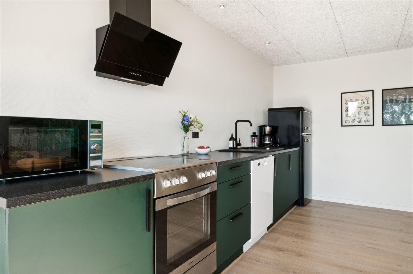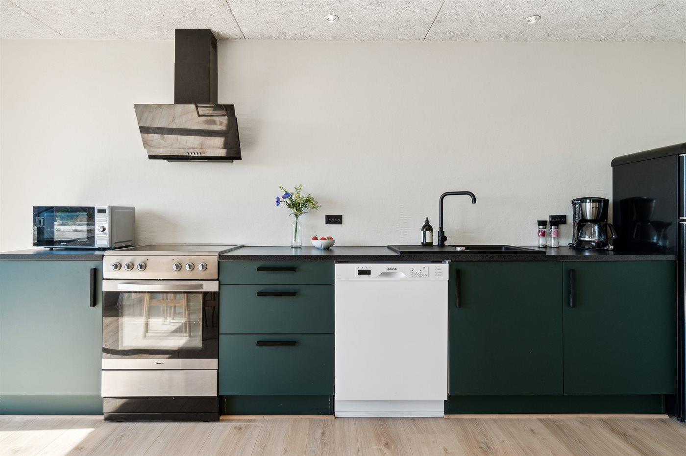 Die Küche ist mit Kühlschrank ausgestattet. Außerdem gibt es 4 Keramik-Kochfelder, Umluftofen, Mikrowelle sowie Geschirrspüler.