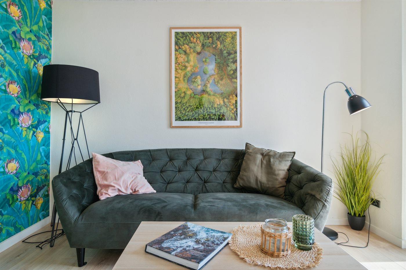 Direkter Zugang vom Wohnzimmer zur erhöhten Holzterrasse, auf der man ebenfalls die Aussicht genießen kann. Helle und warme Farben verleihen dem Inneren der Wohnung ein einladendes Ambiente, das neben dem Wohnzimmer mit moderner Küchenecke auch zwei gute Schlafzimmer und ein modernes Badezimmer umfasst.