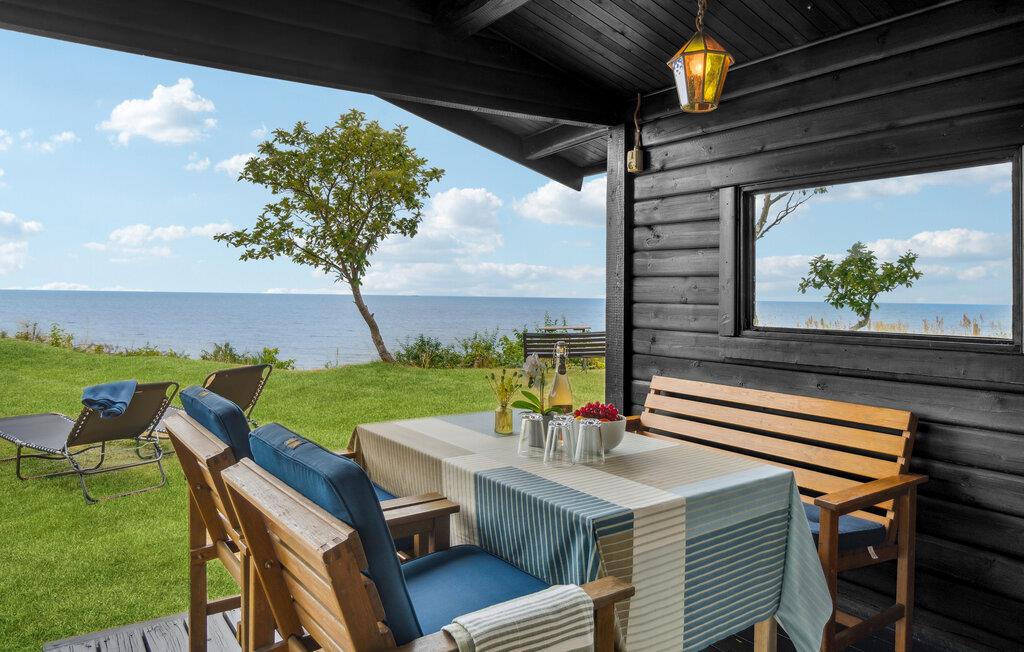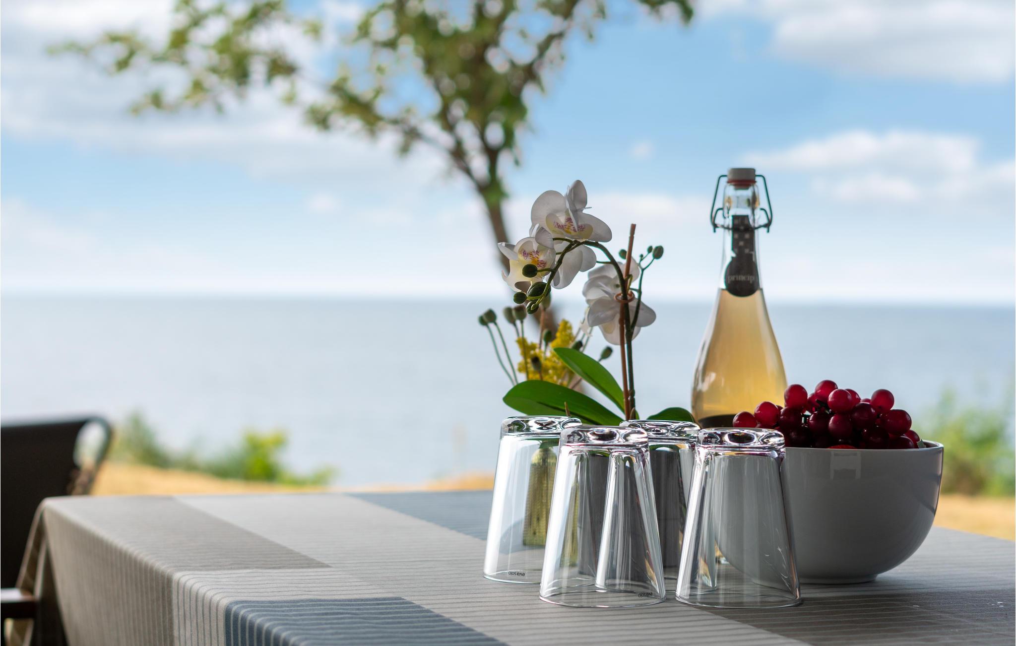 Ferienhaus in Rønne mit Panoramablick auf das Meer und überdachter Terrasse.