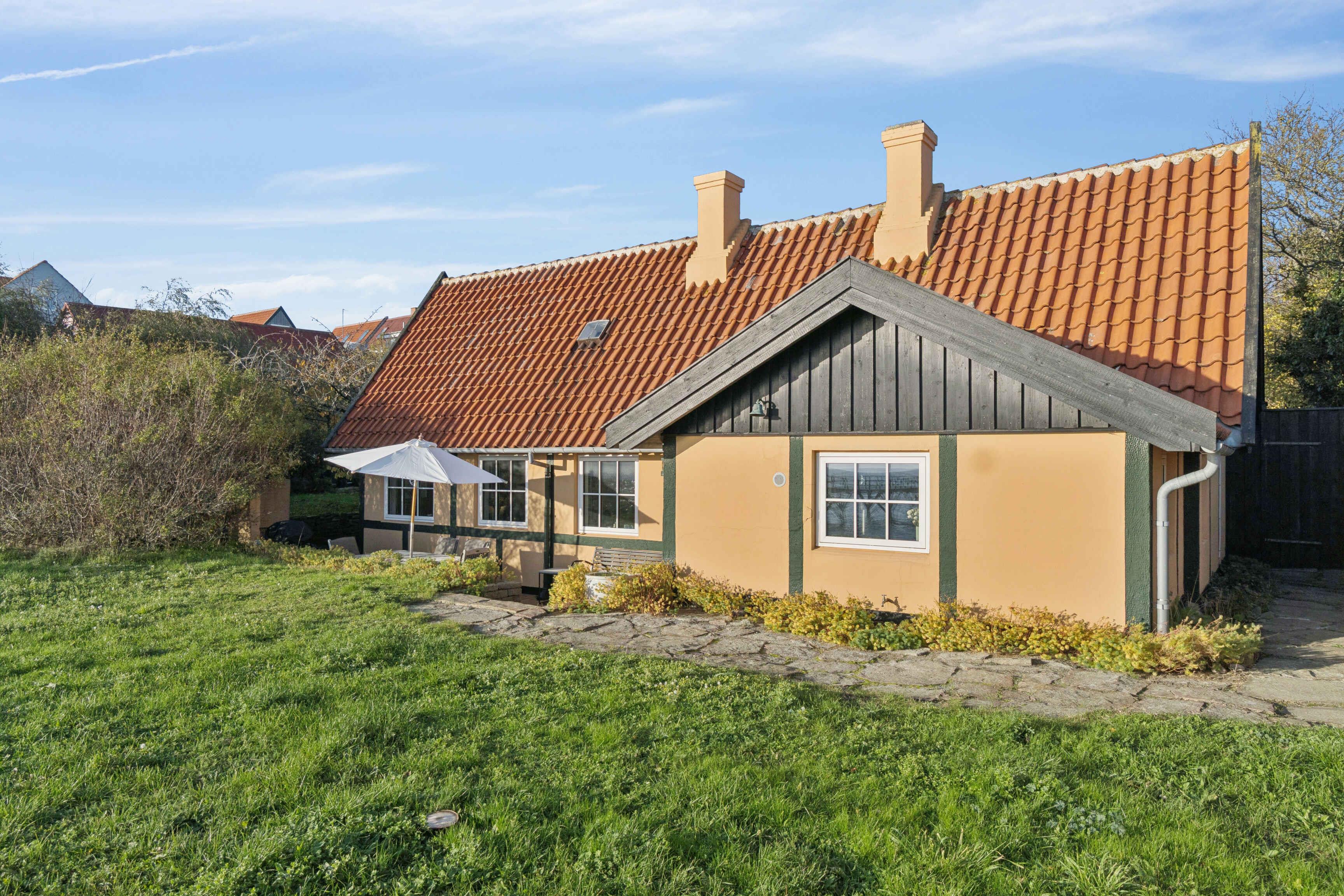 Familienfreundliches Ferienhaus Brohuset mit Meerblick und Terrasse, nur wenige Schritte vom Strand in Arnager entfernt.