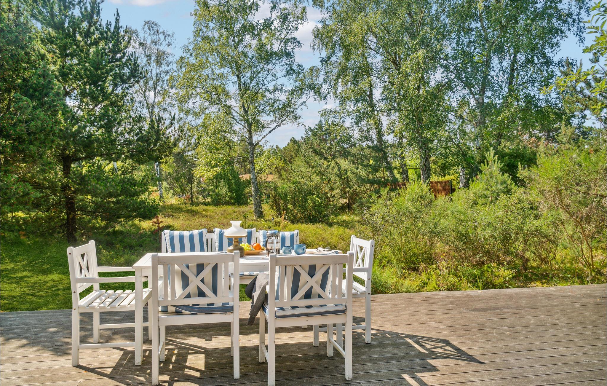 Wenn Sie Ruhe und Privatsphäre suchen, werden Sie in diesem gemütlichen Ferienhaus auf einem bewaldeten Naturgrundstück fündig! Im Inneren empfängt Sie Unterkunft in hellen Farben, die eine einladende Wohlfühlatmosphäre versprüht. Kuscheln Sie zusammen auf dem Sofa, feuern an kühlen Abenden den Kamin an oder spielen ein Brettspiel am Esstisch. Auf der großen Holzterrasse können Sie sich sonnen oder Ihre gegrillten Mahlzeiten genießen und Pläne für die anstehenden Urlaubstage machen.
