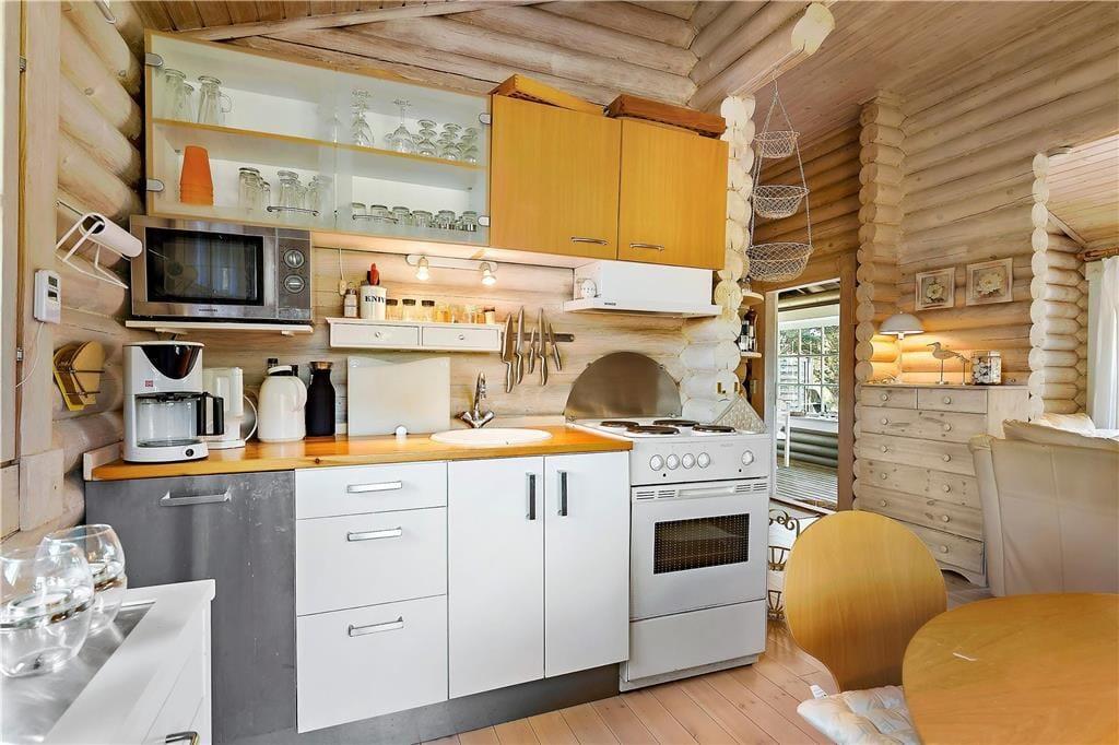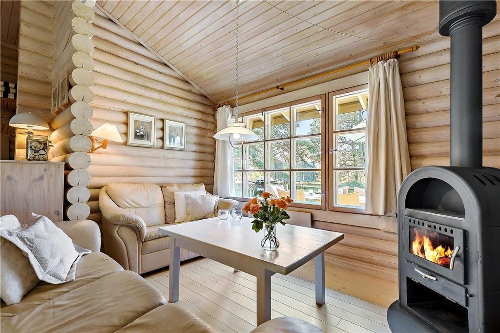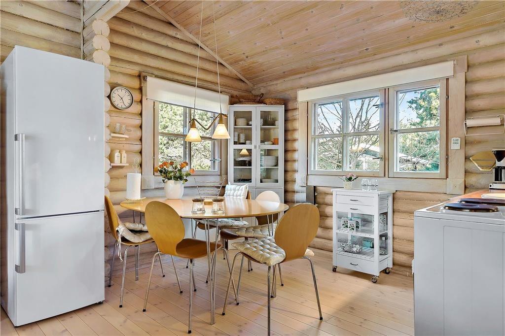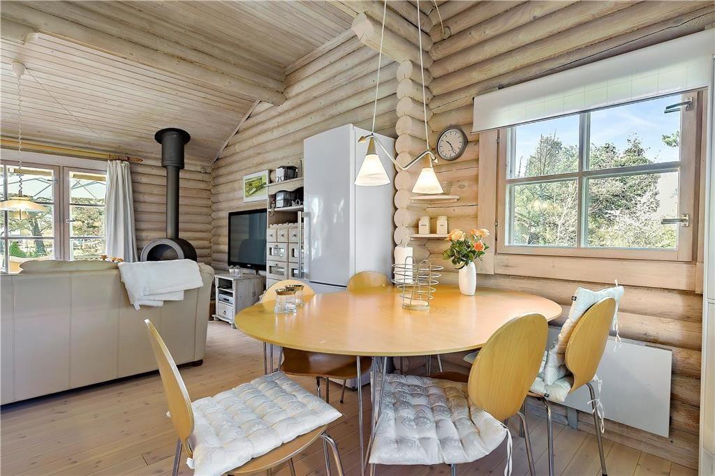 Dein helles Blockhaus mit hohen Decken verzaubert mit einer richtig schönen Ferienhausatmosphäre. Am runden Tisch in der offenen Küche kannst du früh am Morgen in aller Ruhe den ersten Kaffee des Tages genießen. Das Frühstück für deine Familie servierst du hingegen sicherlich gern am weißen Esstisch auf der geschlossenen, überdachten Terrasse. Eure gemütlichen Abende auf dem Sofa untermalt der davor platzierte Kaminofen mit seinem flackernden Feuerschein und seiner behaglichen Wärme.