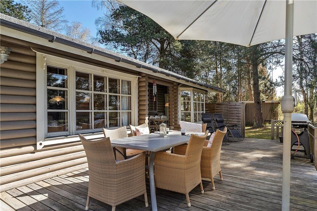 An eine Längsseite deines Urlaubsdomizils schmiegt sich eine große, von einer Holzumrandung umgebene Terrasse. Auf dieser kannst du mit deinen Lieben stimmungsvolle Grillabende am großen Esstisch verleben und auf den schönen Gartenstühlen und Sonnenliegen die Ruhe und die Natur ringsum genießen.