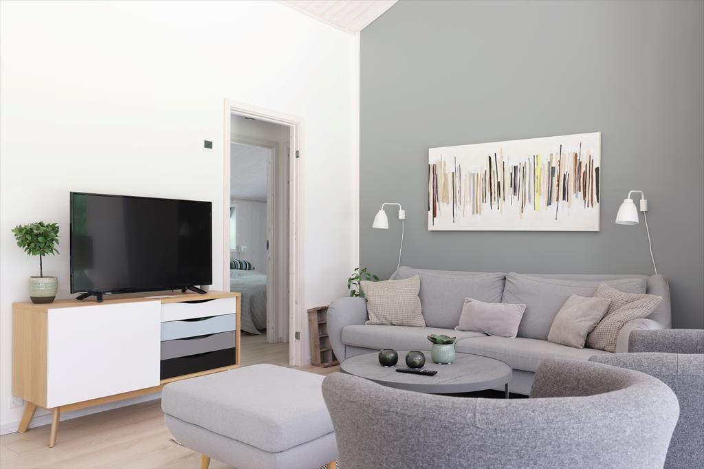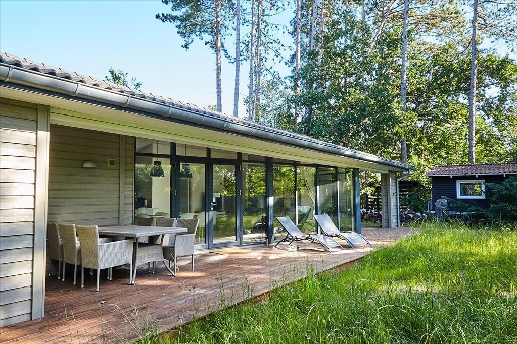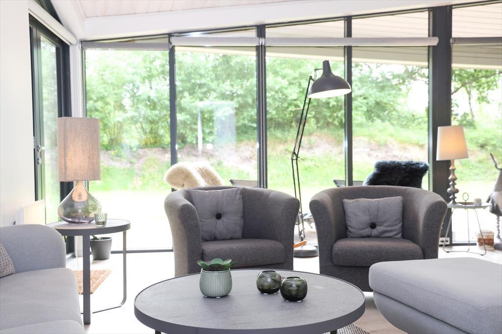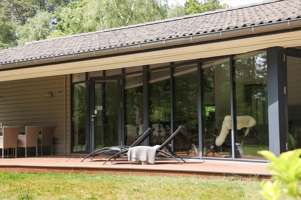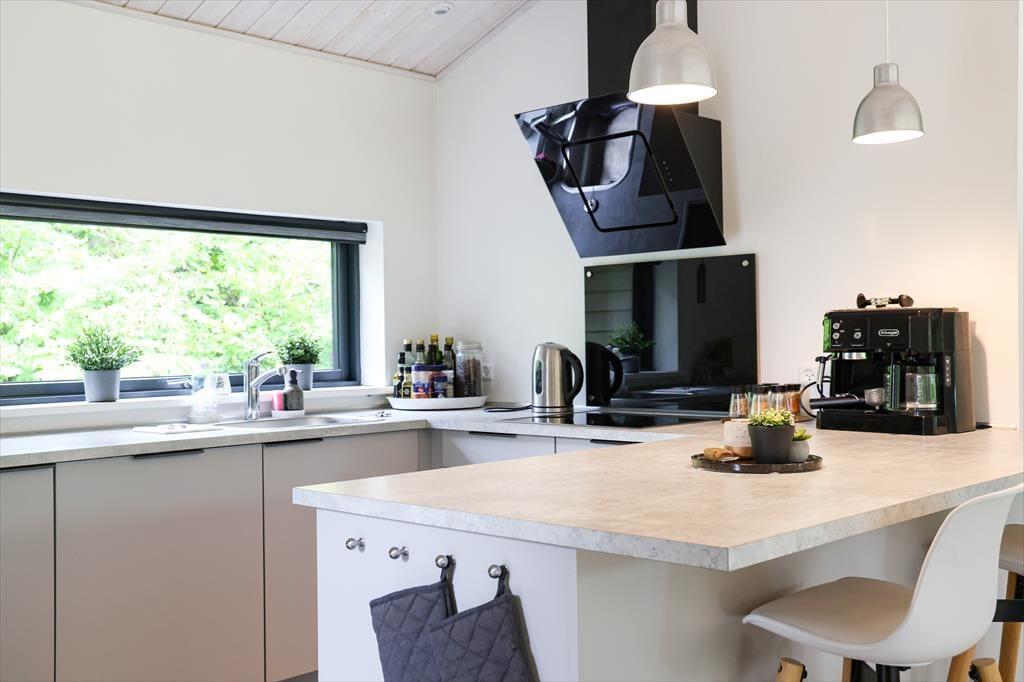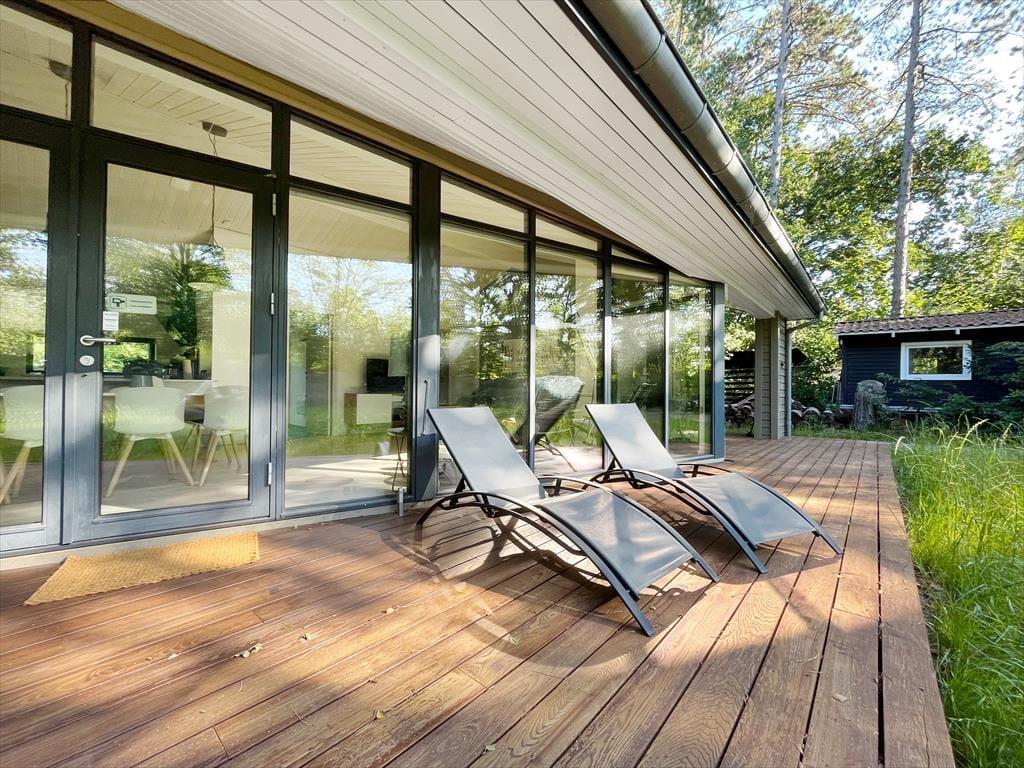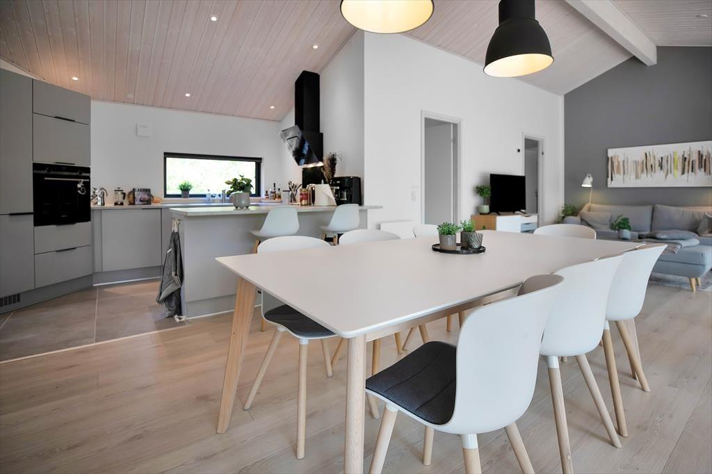 Das Ferienhaus ist mit Bodenheizung in allen Räume ausgestattet und enthält folgendes: Waschküche mit Waschmaschine, 2 Schlafzimmer mit Doppelbetten und ein Schlafzimmer mit 2 Einzelbetten. Dazu gehören auch 2 gute Badezimmer, das eine mit schönem Spabad. Küche/Mehrzweckraum in weißen Elemente mit allen modernen Ausstattungen; hier können Sie sich helfen, einen guten Lunch zu vorbereiten. Die Küche ist in offener Verbindung mit einem schönen Wohnraum, wo Sie sich u.a. mit einen guten Kaffee entspannen können. Vom Wohnraum haben Sie Zugang zu der großen Holzterrasse, die in mehrere offenen und eine überdachte Sektion aufgeteilt ist. Hier können Sie ab Morgen bis Abend die Sonne genießen und vielleicht ein Paar gute Steaks auf den Grill hinlegen. Der Garten ist in Etablierung und der Rasen auf dem Weg.