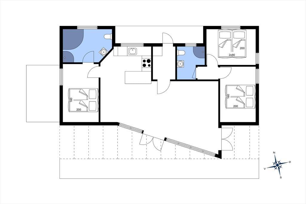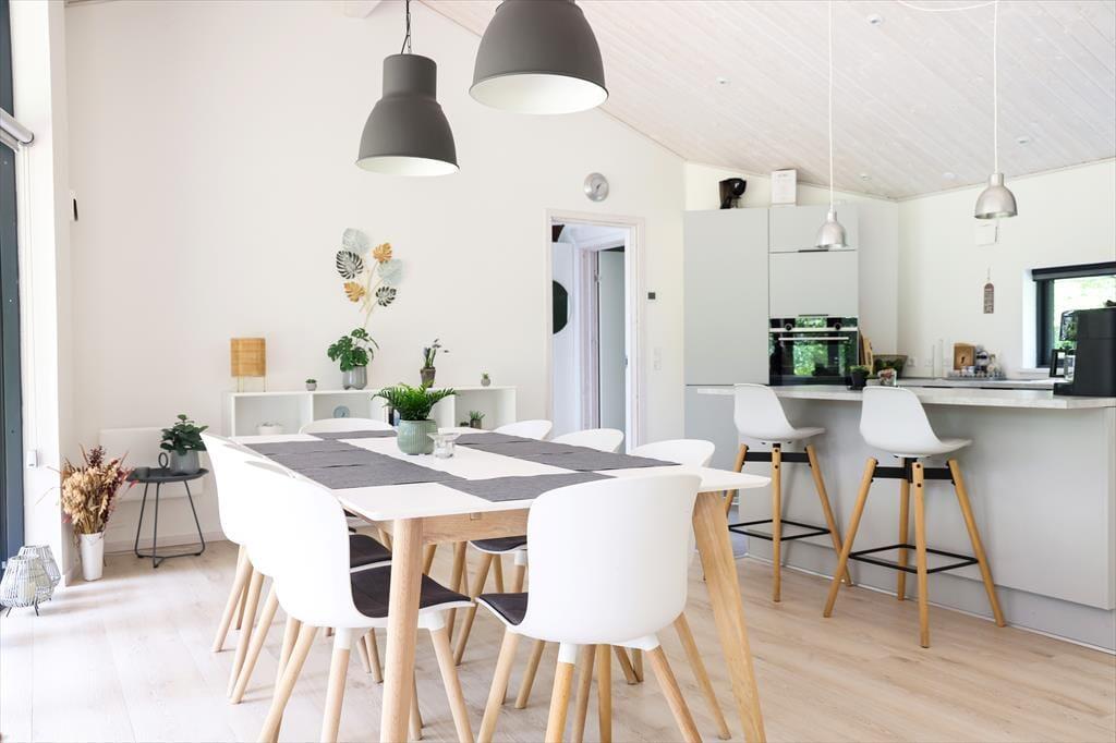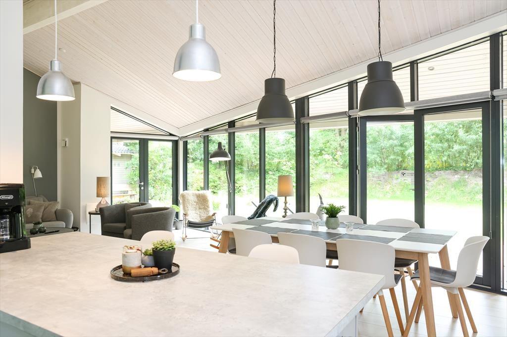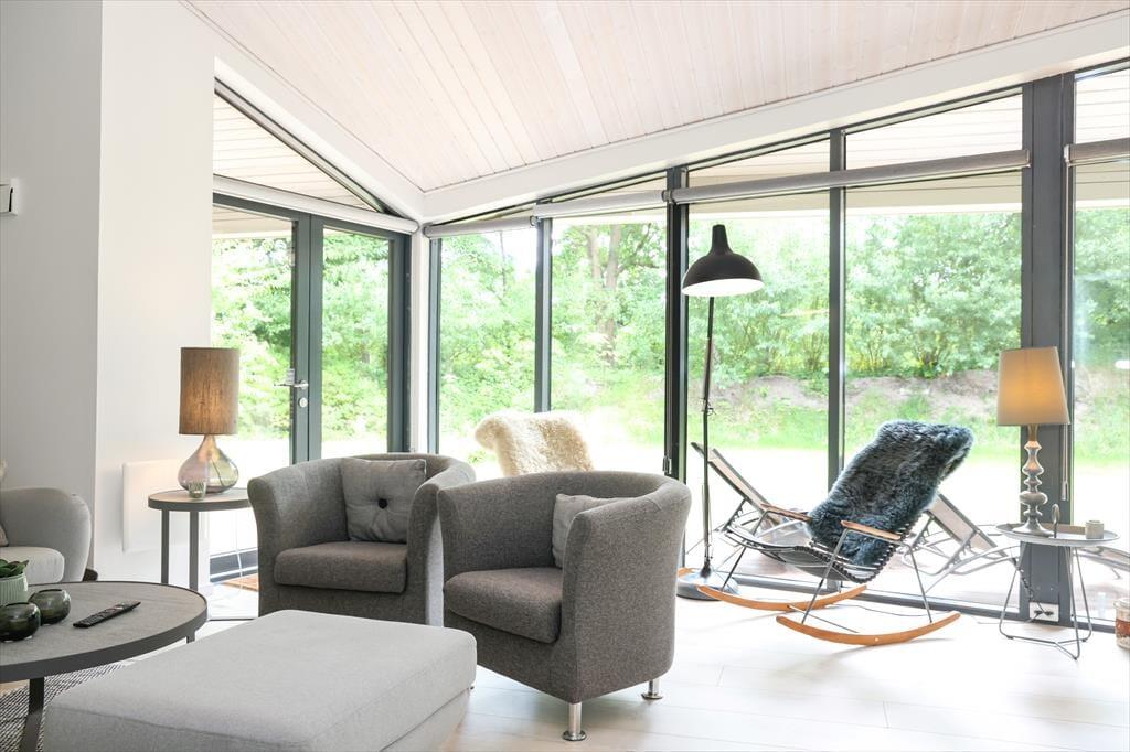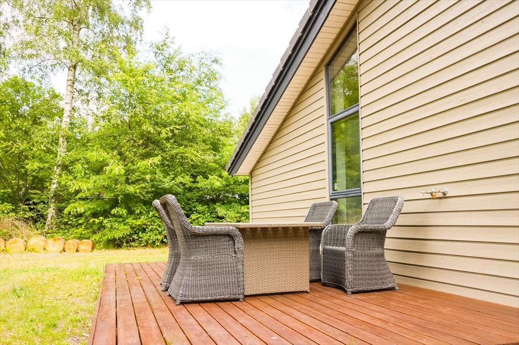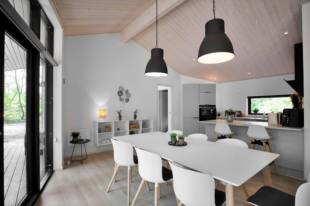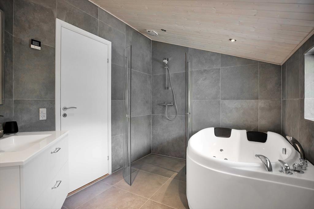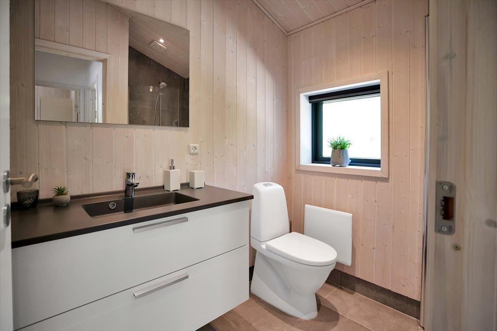 Das Ferienhaus ist mit Bodenheizung in allen Räume ausgestattet und enthält folgendes: Waschküche mit Waschmaschine, 2 Schlafzimmer mit Doppelbetten und ein Schlafzimmer mit 2 Einzelbetten. Dazu gehören auch 2 gute Badezimmer, das eine mit schönem Spabad. Küche/Mehrzweckraum in weißen Elemente mit allen modernen Ausstattungen; hier können Sie sich helfen, einen guten Lunch zu vorbereiten. Die Küche ist in offener Verbindung mit einem schönen Wohnraum, wo Sie sich u.a. mit einen guten Kaffee entspannen können. Vom Wohnraum haben Sie Zugang zu der großen Holzterrasse, die in mehrere offenen und eine überdachte Sektion aufgeteilt ist. Hier können Sie ab Morgen bis Abend die Sonne genießen und vielleicht ein Paar gute Steaks auf den Grill hinlegen. Der Garten ist in Etablierung und der Rasen auf dem Weg.