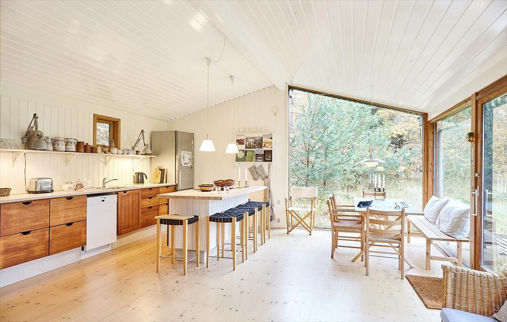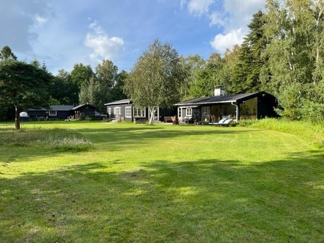Das Ferienhaus ist mit einer großen, offenen Küche mit eingebautem Kamin, Fernseher und kombiniertem Wohn- und Essbereich eingerichtet. In der geräumigen Küche können Sie die Mahlzeiten sehr gut gemeinsam zubereiten. Der gemütliche Wohnraum mit Holzofen lädt zu Kartenspielrunden und Fernsehen ein, oder Sie können sich in einem guten Buch vertiefen. Das Haus bietet zwei schöne Badezimmer mit je einer Dusche an. Die Schlafplätze verteilen sich auf vier tolle Schlafräume und auf ein zusätzliches Durchgangszimmer mit Sofa/Doppelbett. Geräumiger Flur mit Raum für Mäntel und die Stiefeln der Kinder. Das gesamte Mietobjekt präsentiert sich hell und schön. Das Haus bietet schöne Terrassen an mit Sonne ab Morgen bis Abend und mit einem gemauerten Pizzaofen. Die Rehe kreuzen das große Grundstück – und Sie haben genug Platz für Fußball und Rasentennis.