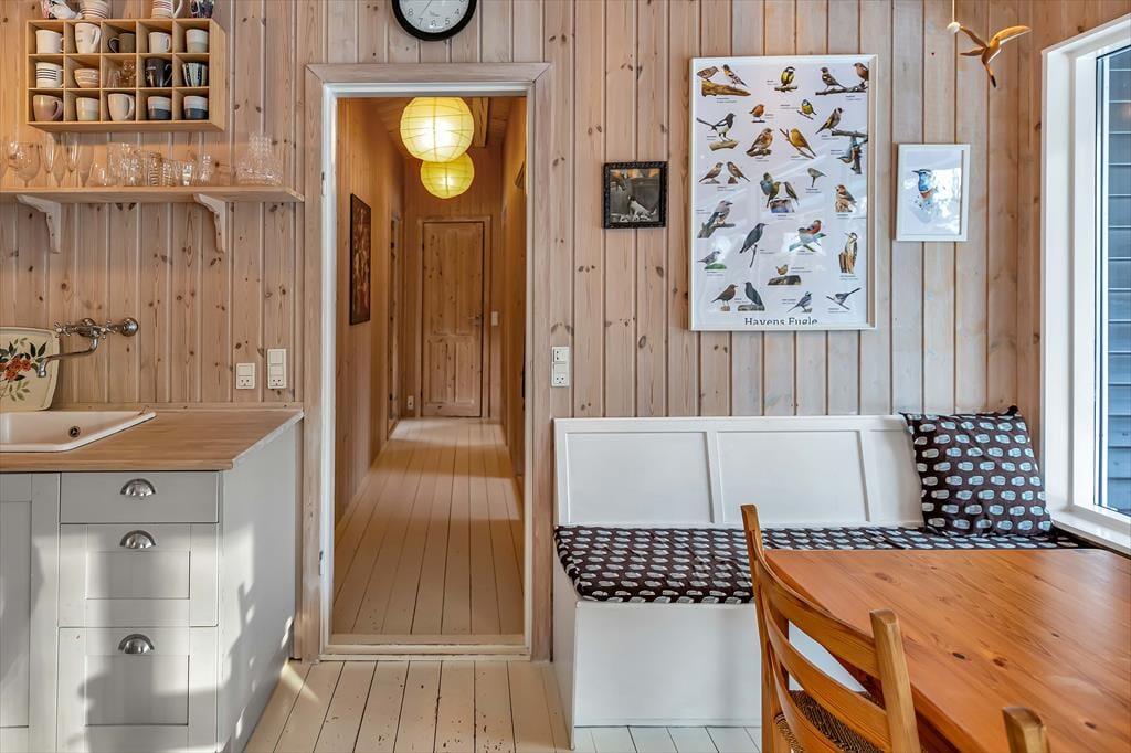 Draußen lädt die große Holzterrasse des Ferienhauses zum Entspannen ein. Du kannst hier die Sonne genießen oder in Ruhe ein gutes Buch lesen, während die Kinder sich im Garten mit mitgebrachten Spielen austoben. Auf der großzügigen Terrasse ist genug Platz, damit alle gemeinsam ein schönes Mittag- oder Abendessen genießen können. Der große Garten des Ferienhauses ist gut geschützt, sodass du und deine Familie den Urlaub in ruhiger Umgebung genießen könnt. Nach einem Badetag am schönen Sandstrand ist es herrlich, sich einfach auf die Terrasse zu legen, den Vögeln zu lauschen oder einem Reh zuzuschauen, das vorbeiläuft.
