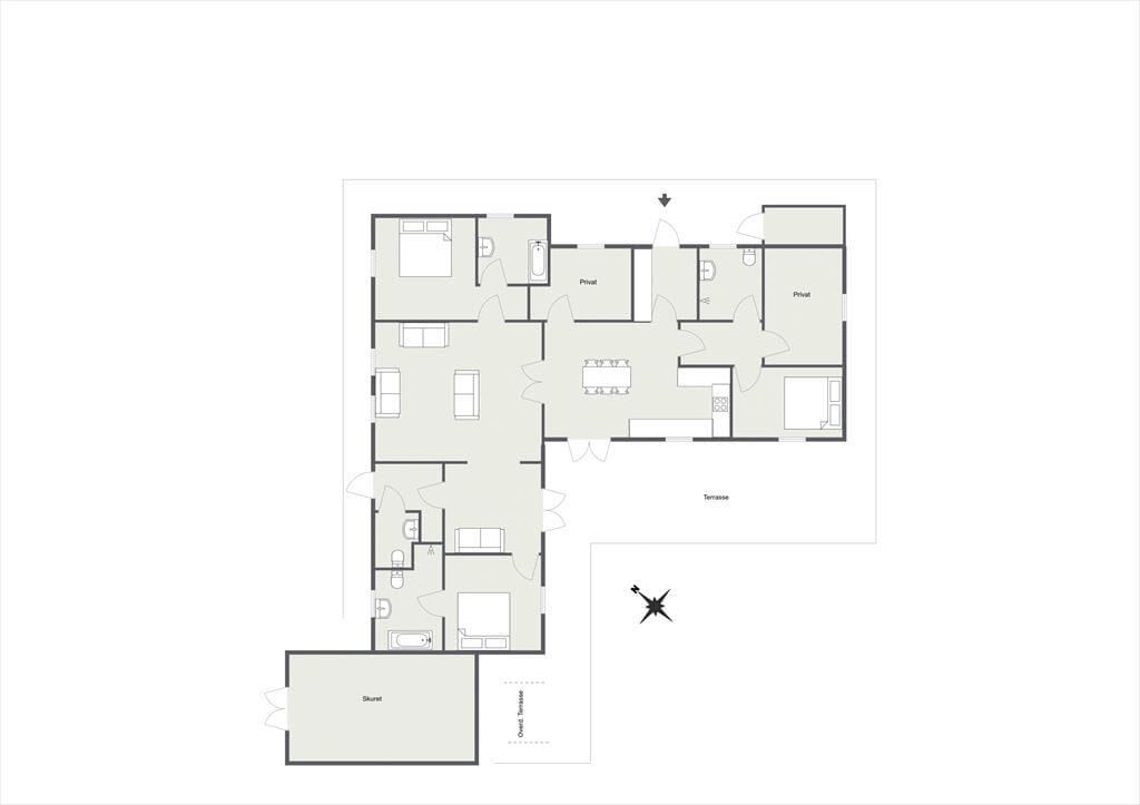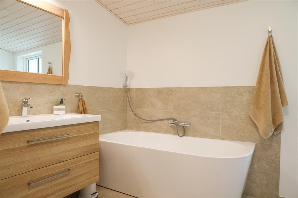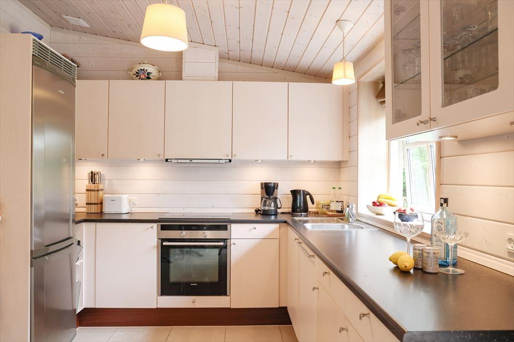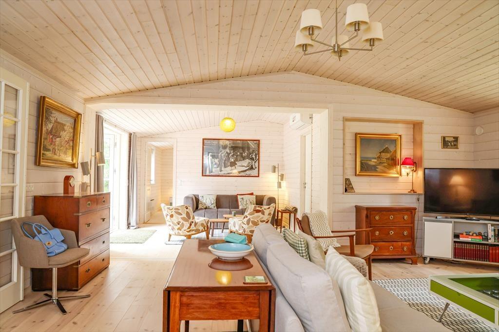 In der Mitte des Hauses gibt es eine schöne Wohnküche mit gemütlichem Essplatz. In dem einen Ende Hauses gibt es zwei Schlafzimmer und Badezimmer und an dem anderen Ende befindet sich das Wohnzimmer. In Verbindung mit dem Wohnzimmer gibt es ein Schlafzimmer mit höhenverstellbaren Bett sowie einem zweiten Badezimmer mit Badewanne - keine Duschkabine aber Dusche in Verbindung mit der Wanne. Es gibt Internet und Apple TV-nur streaming.