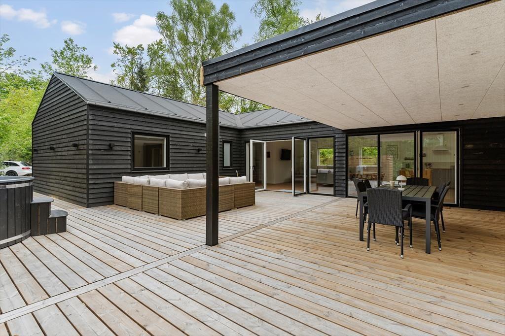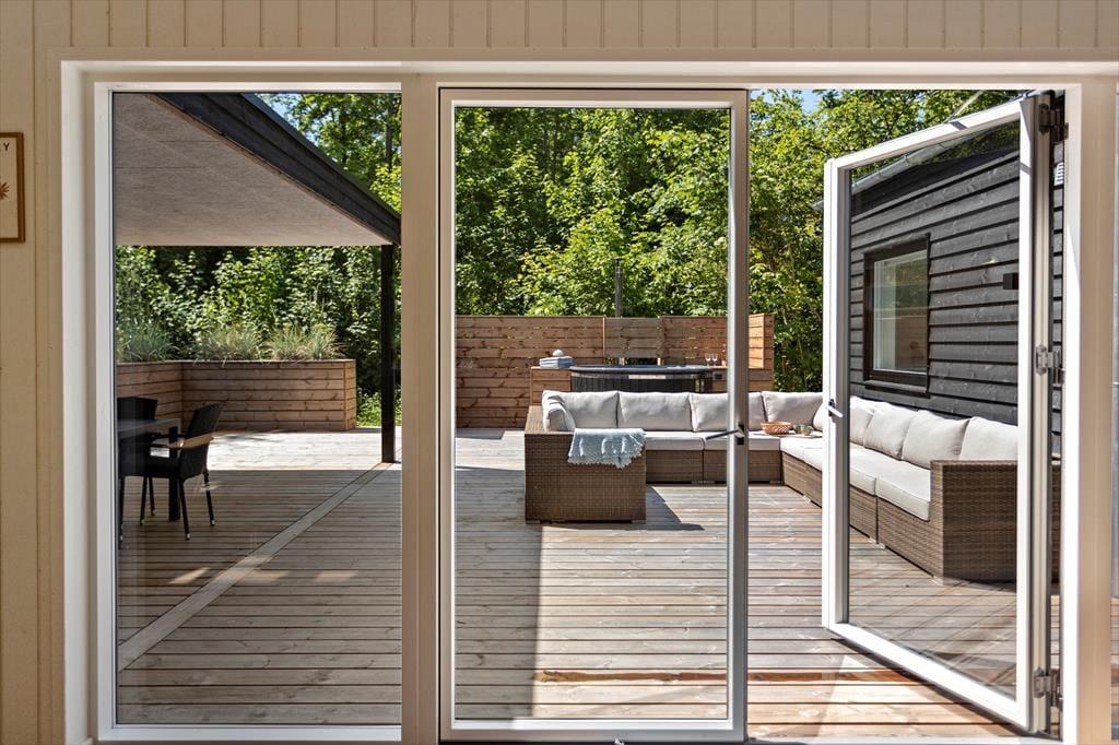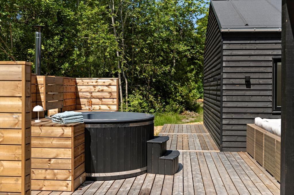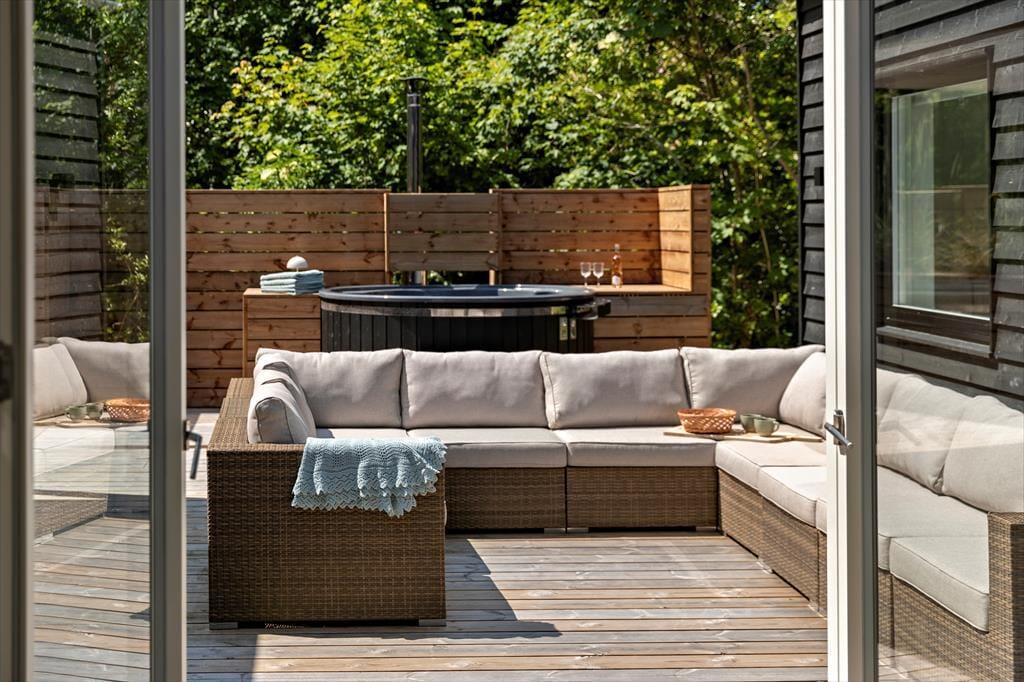 Die große Holzterrasse bietet beste Voraussetzungen für ausgedehnte Sonnenbäder und lange, entspannte Stunden mit einem guten Buch. Auf der großen, nach Westen ausgerichteten Terrasse laden Gartenmöbel zu gemeinsamen Frühstücken, Mittagessen und Grillabenden ein. Pure Erholung und Entspannung mit einem Hauch von Wellnessflair verspricht die schöne Schwedische Badetonne. Wenn es tatsächlich einmal regnen sollte, gelangst du trockenen Fußes vom Hausinneren auf den überdachten Terrassenbereich, der sich übrigens auch nach Einbruch der Dunkelheit sehr schön als gemütlicher Rückzugsort anbietet.