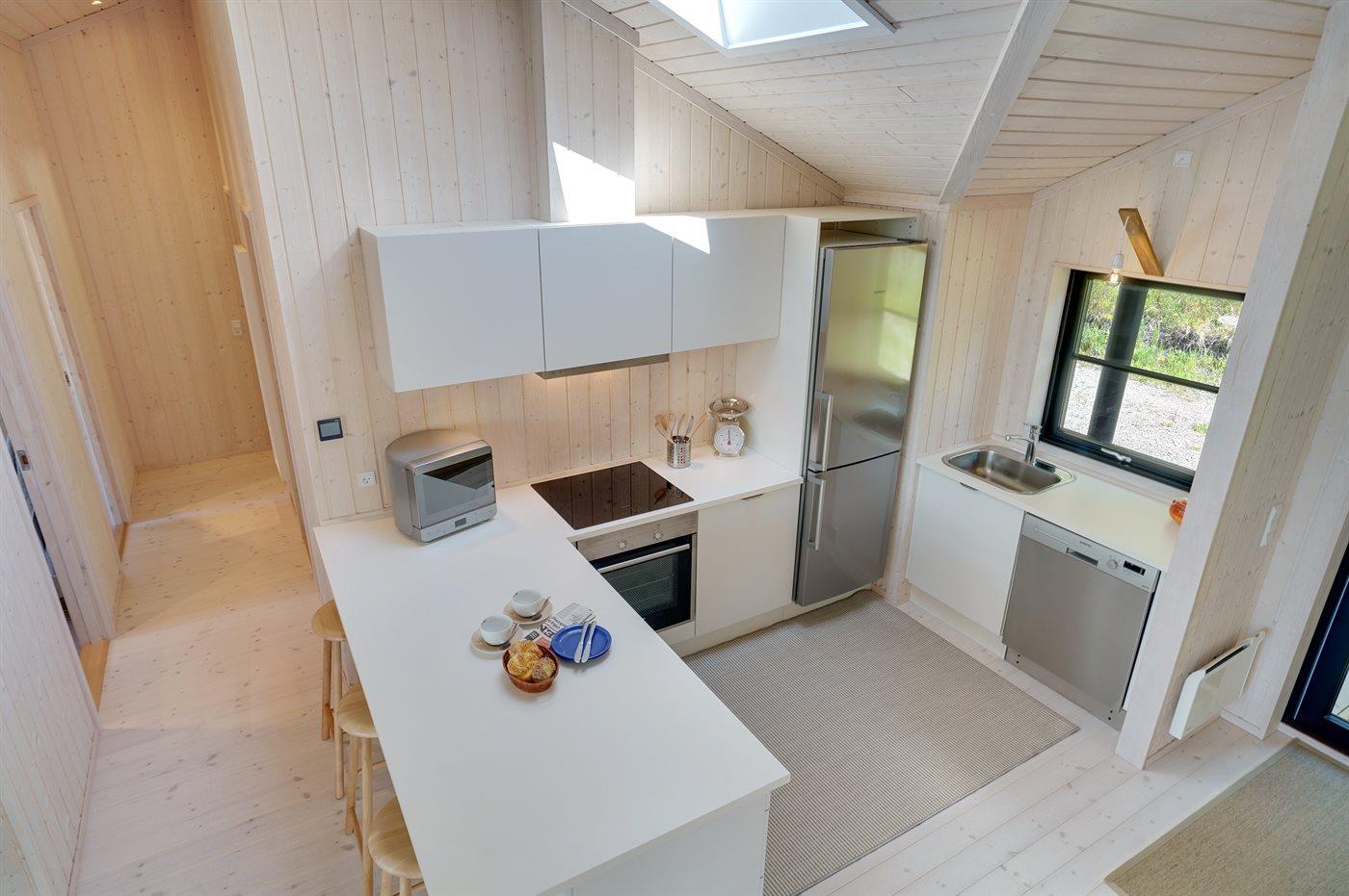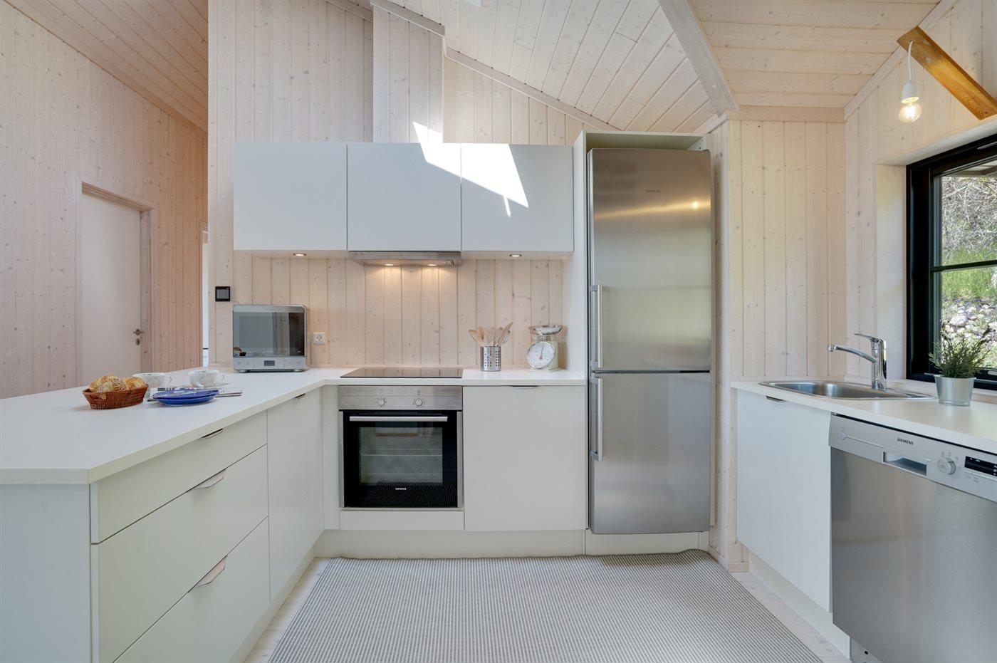 Die Küche ist mit Kühlschrank ausgestattet. Außerdem gibt es 4 Induktions-Kochzonen, Umluftofen, Mikrowelle sowie Geschirrspüler.