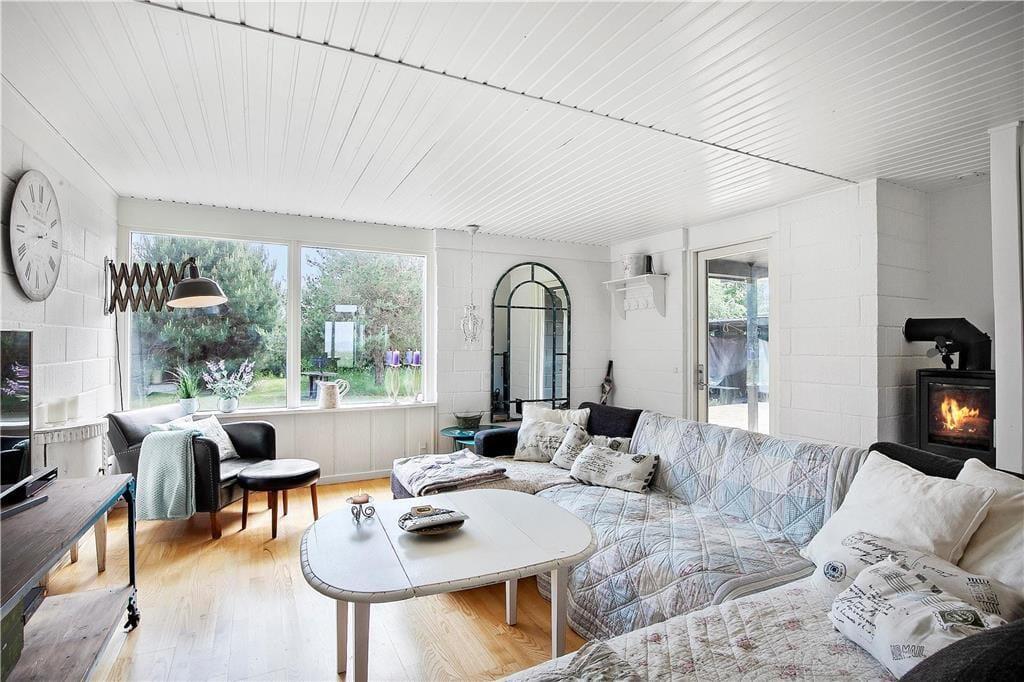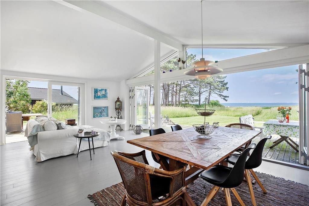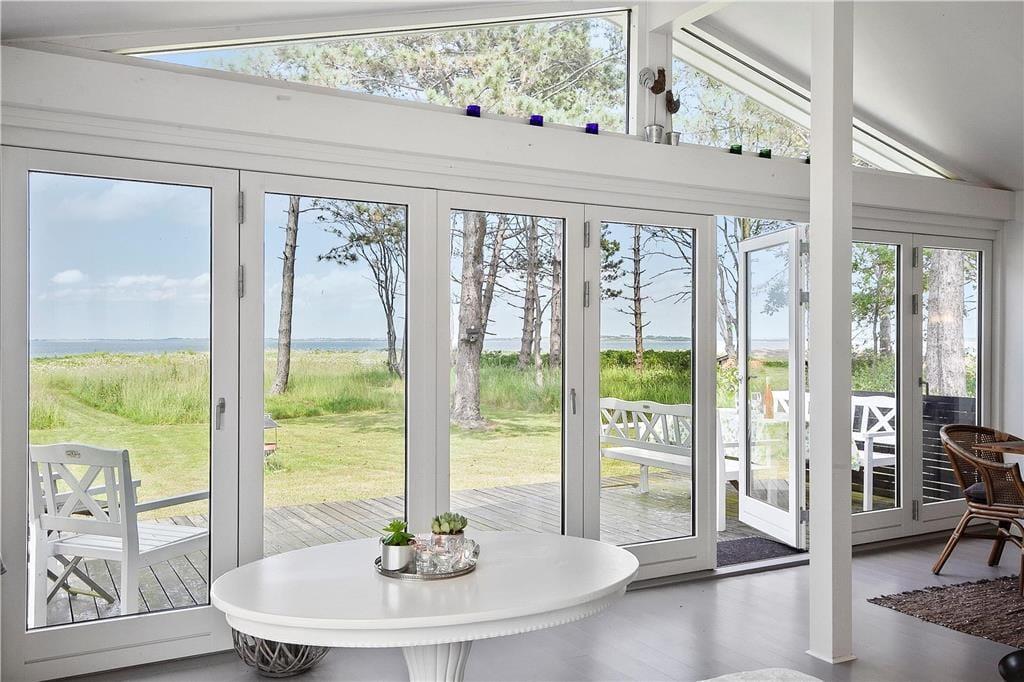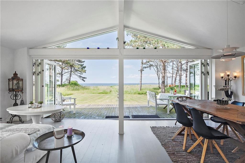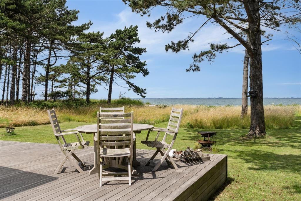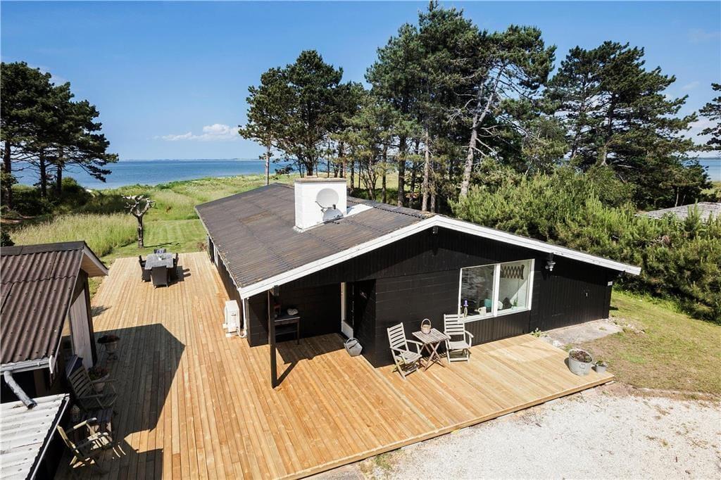 Die Panoramaaussicht über das Wasser und die Attribute zauberhaft, gemütlich, hell und wunderbar charakterisieren dieses Ferienhaus mit wenigen Worten. Das Ferienhaus empfängt Sie mit einem kombinierten Küchen- und Wohnbereich sowie einem weiteren Wohnbereich, bei dem die große Fensterfront zur Wasserseite komplett geöffnet werden kann. Die Küche beinhaltet einen Herd mit Ceranfeld und eine Spülmaschine. Außerdem gibt es einen Kühlschrank mit Gefriermöglichkeit. Vom Wohnbereich genießen Sie direkten Zugang zur Holzterrasse, die direkt an das Haus anschließt. Im Wohnraum dürfen Sie sich zudem auf ein Chaiselongue-Sofa und einen Fernseher freuen. Fernseher mit Zugriff auf Viaplay, Tv2 Play, HBO, Netflix, DR über Webbrowser Der andere Wohnbereich besticht mit einem fantastischen Ausblick auf das Meer und über die Landschaft. Dank der großen, komplett zu öffnenden Fensterfront gelangen Sie außerdem auf eine Terrasse mit einem ganz einmaligen Panoramablick. Kamin, Sofa, Sessel und ein guter Essplatz sind ebenfalls in diesem Raum enthalten. Das mit einem Fliesenboden versehene Badezimmer verfügt über eine Duschnische, eine Waschmaschine und eine Fußbodenheizung. Im Hauswirtschaftsbereich stehen eine Waschmaschine und eine Mikrowelle für Sie bereit. Die Schlafplätze verteilen sich auf zwei Schlafzimmer mit jeweils einem Doppelbett. Weitere Schlafplätze sind in Form zweier doppelter Schlafsofas im Nebengebäude untergebracht. Das herrliche Ferienhaus wird mittels des Kamines, einer Wärmepumpe und Elektroheizungen beheizt.