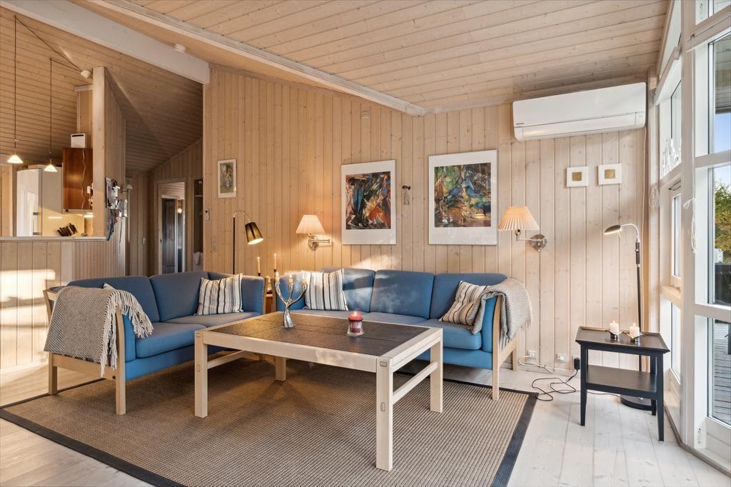 Willkommen in deinem Ferienhaus: Im Haus erwarten Sie große Fensterflächen mit viel Licht und Luft sowie ein einladender Wohnbereich, in dem sich die Familie versammeln kann. Wohnzimmer und Küche sind offen gestaltet, und neben dem reichlichen Tageslicht sorgt die bis zum Giebel offene Decke für ein großzügiges Raumgefühl. An kühleren Tagen können Sie gerne den Kaminofen anfeuern und die Ruhe genießen. Die Küche ist schlicht und hell eingerichtet, und vom Wohnbereich aus gelangen Sie in alle drei Schlafzimmer. Platzsparende Schiebetüren und ein gepflegtes Bad sowie ein praktischer Hauswirtschaftsraum mit Waschmaschine runden das Haus ab.