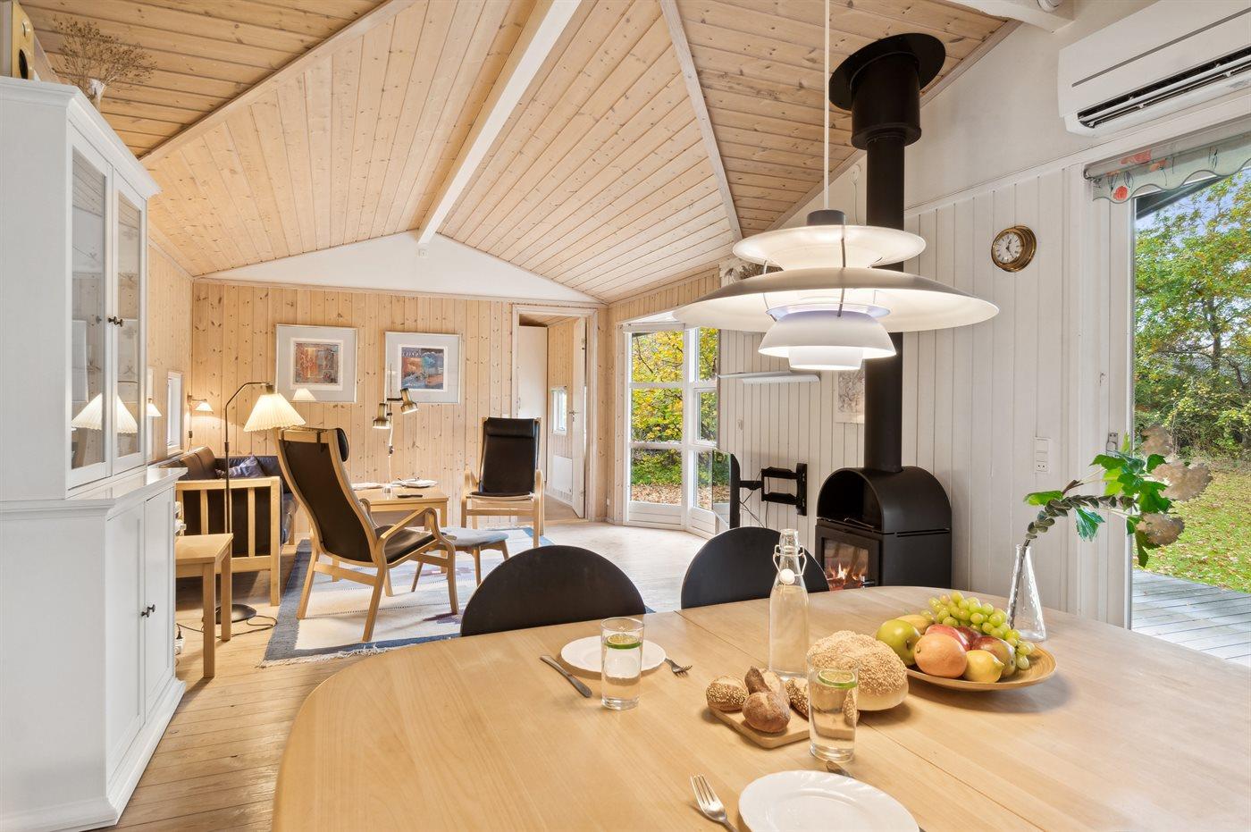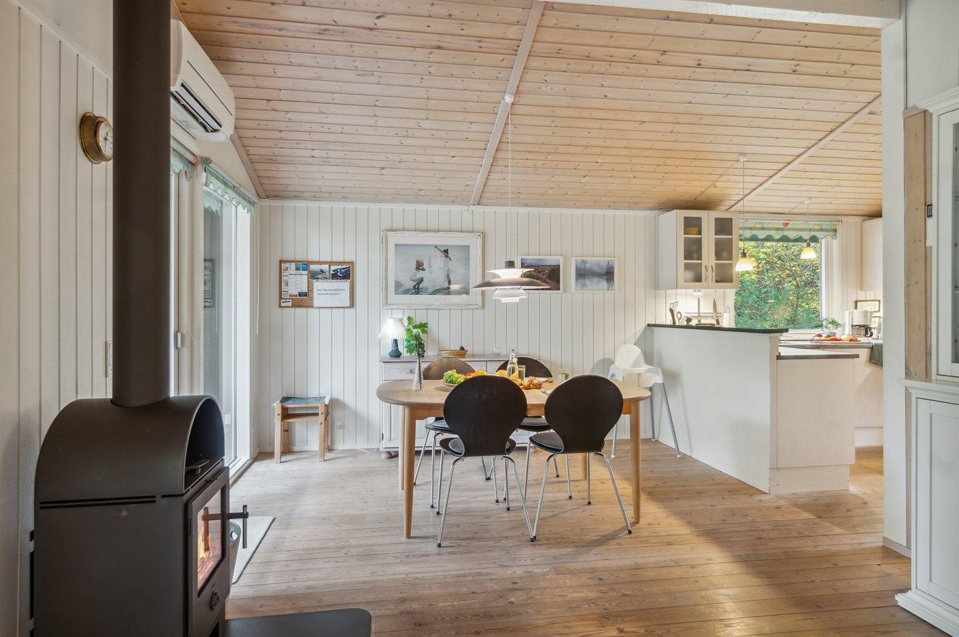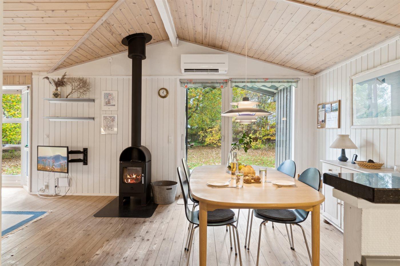 Das Haus wird energieeffizient mit einer Luft-Luft-Wärmepumpe beheizt, und es gibt einen Kaminofen für gemütliche Stunden.